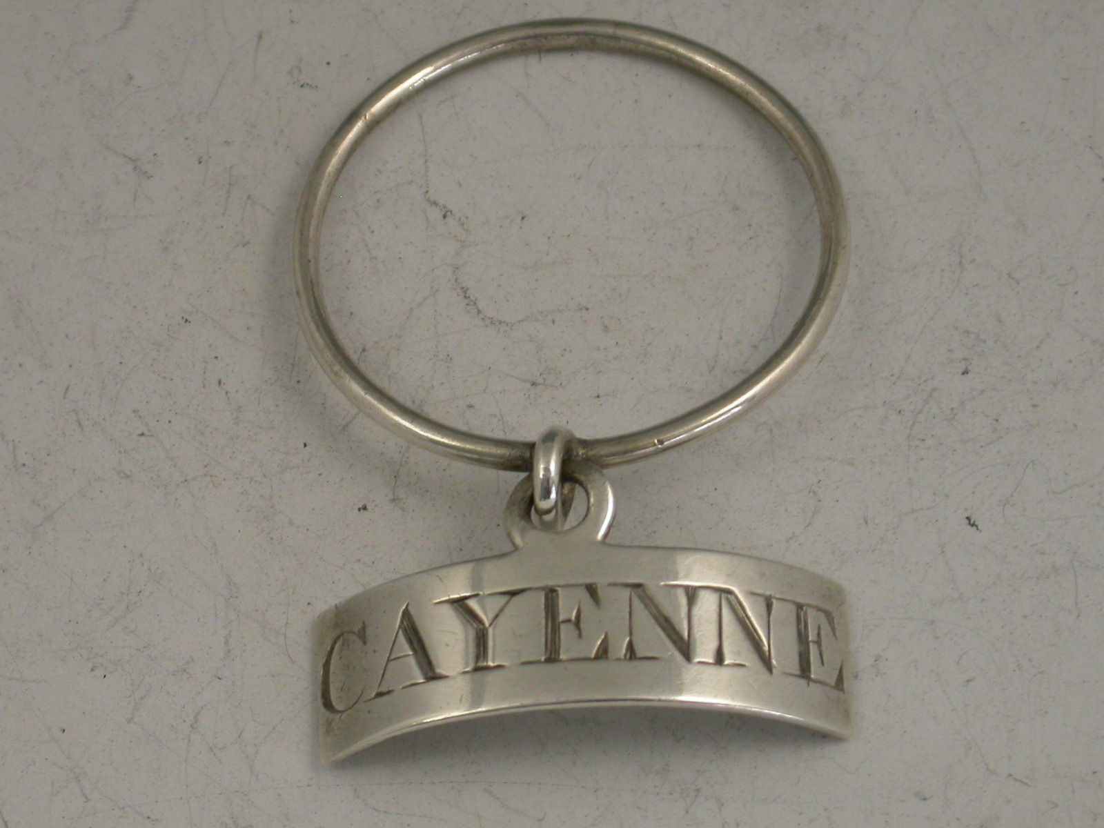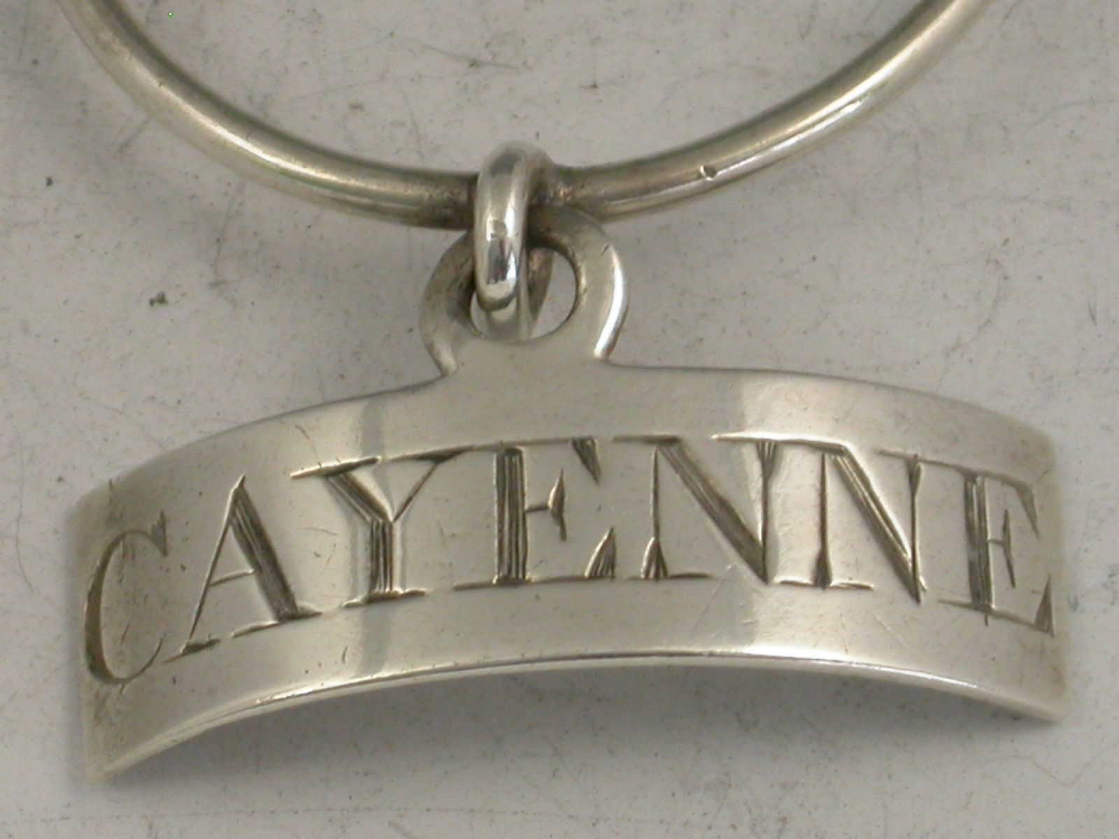 A good George III silver Sauce Label of neck ring form, the curved narrow rectangular label with single suspension eye and sold circular silver wire suspension ring, incised for Cayenne.