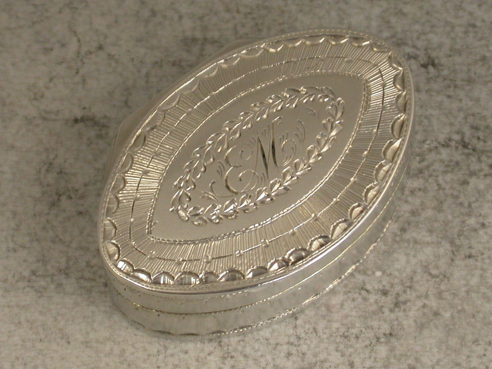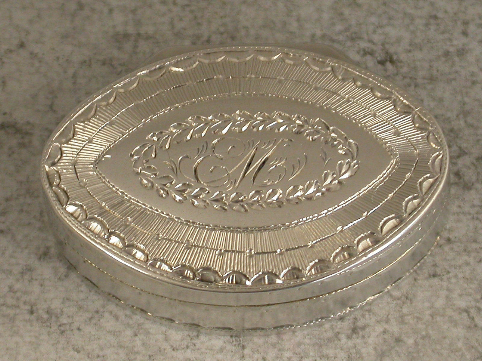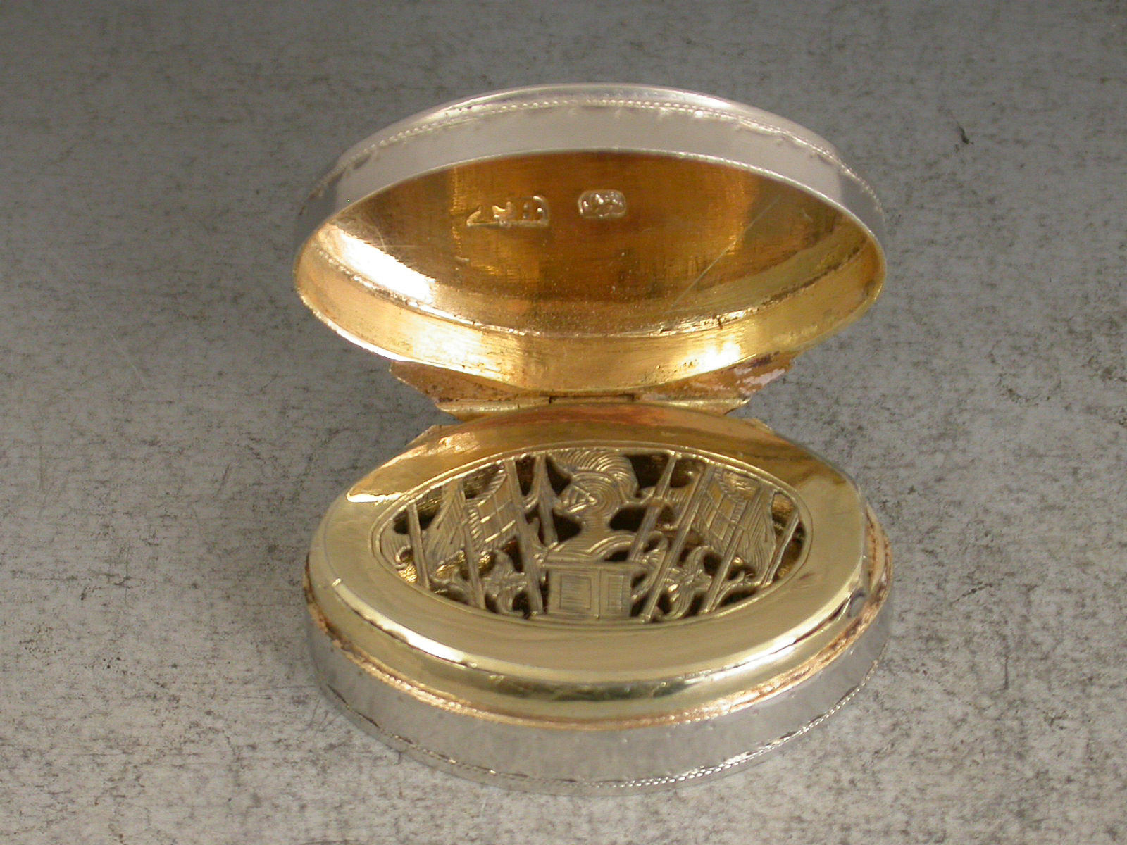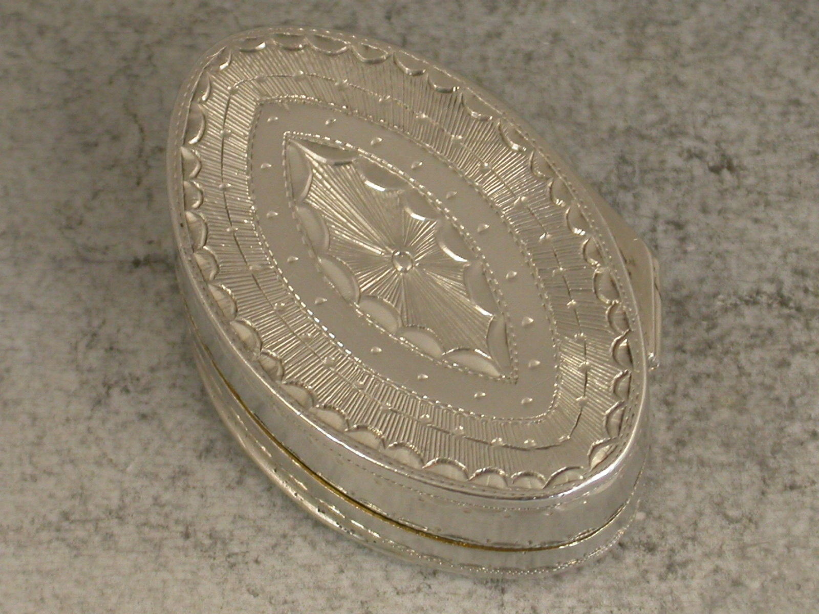 A fine George III silver Vinaigrette of oval or navette shape with stand-away hinge, the base, sides and lid with very crisp bright-cut and prick-dot engraved decoration. The silver gilt interior with pierced grille depicting a Knights helmet on a plinth between flags and battle-axes.