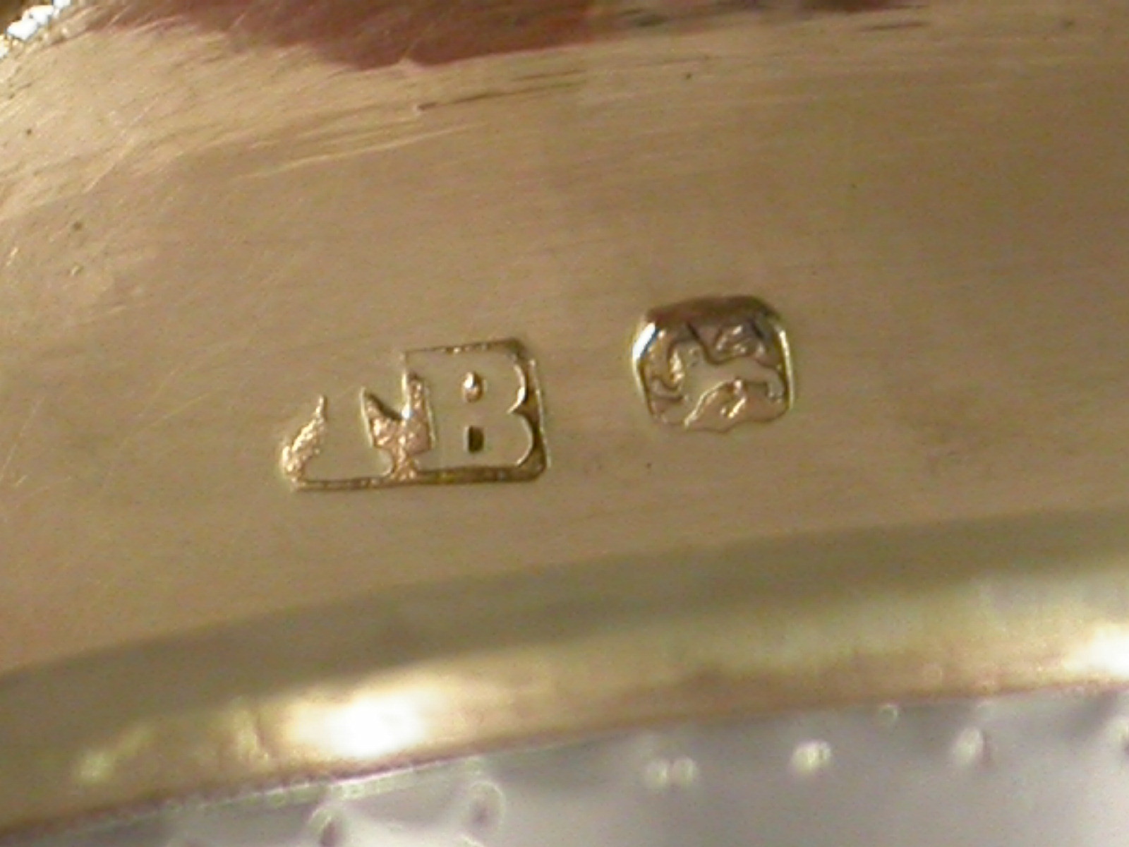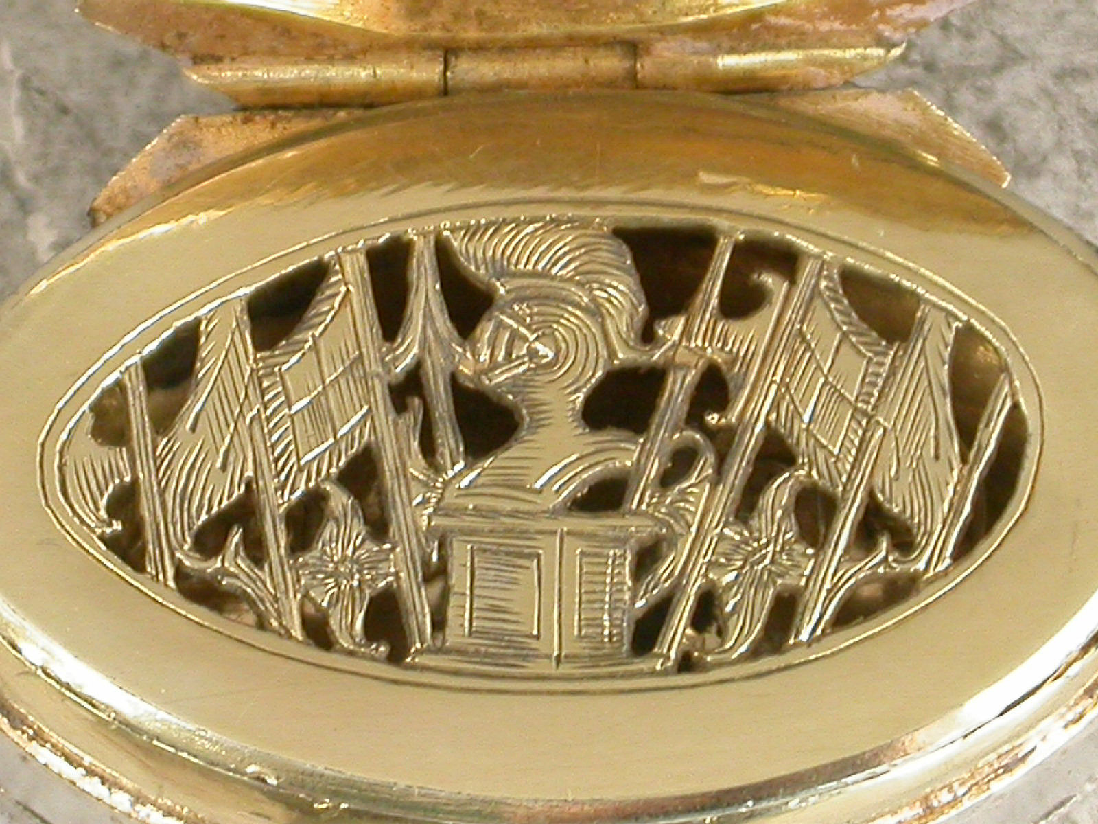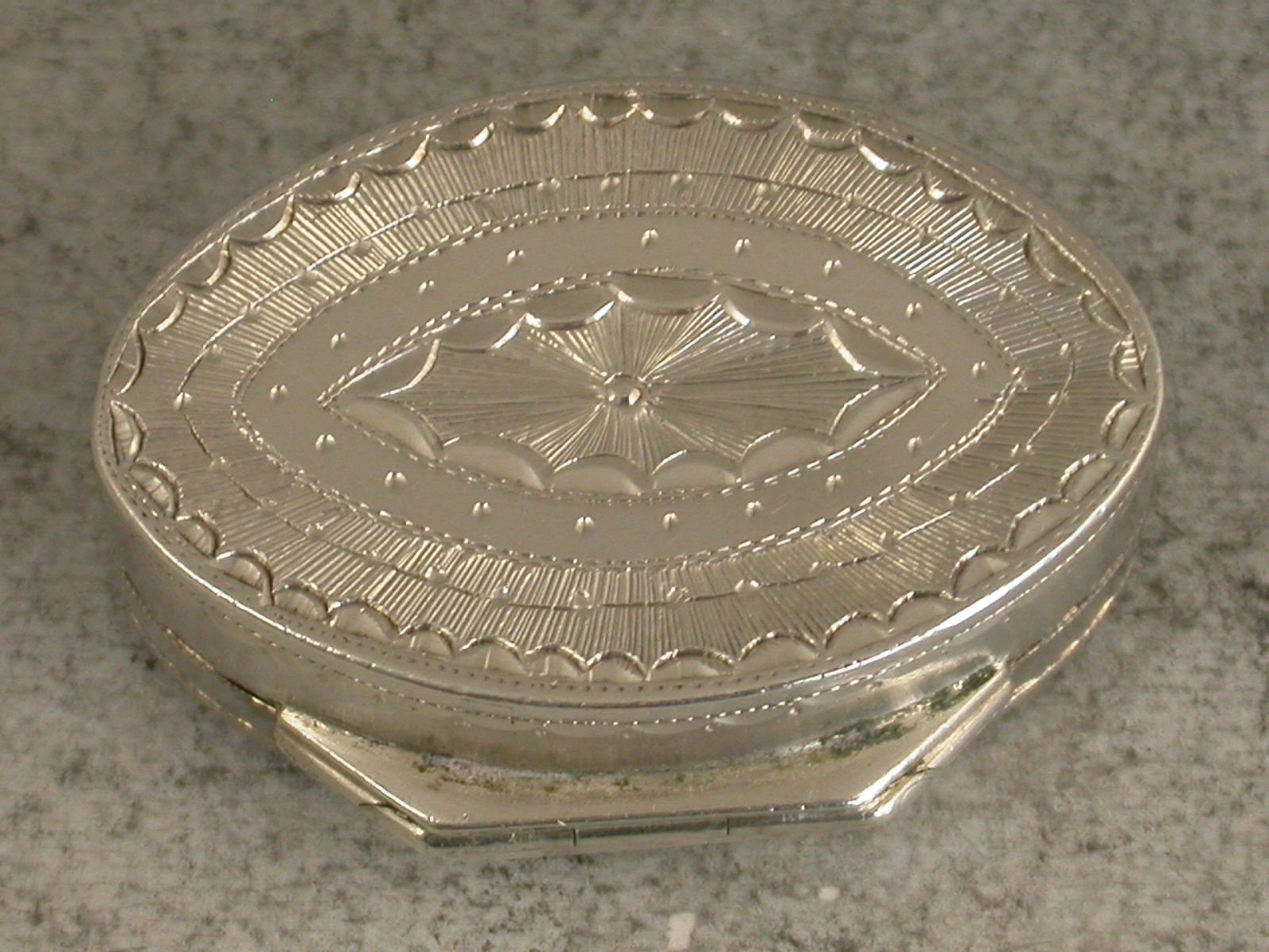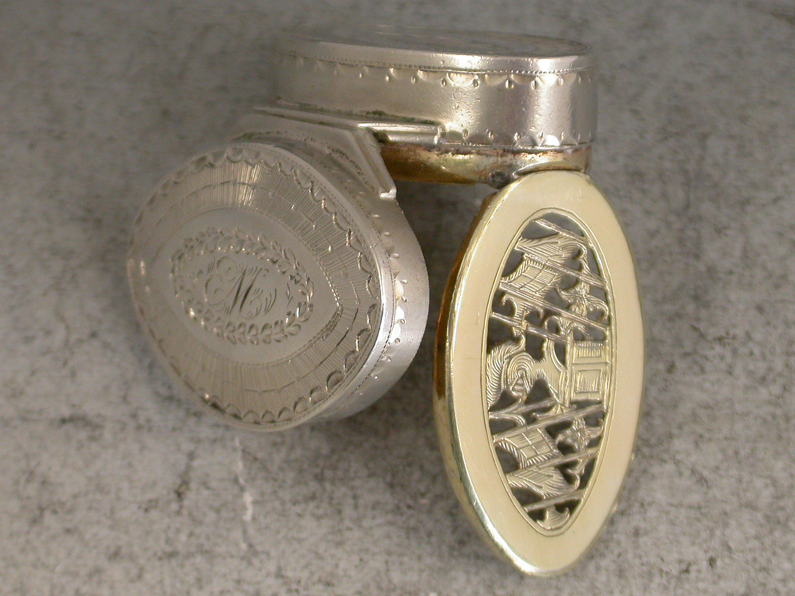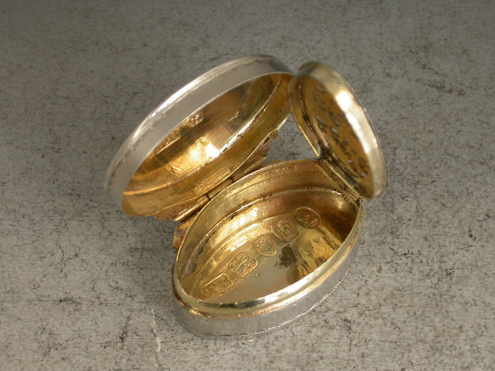 A fine George III silver Vinaigrette of oval or navette shape with stand-away hinge, the base, sides and lid with very crisp bright-cut and prick-dot engraved decoration. The silver gilt interior with pierced grille depicting a Knights helmet on a plinth between flags and battle-axes.