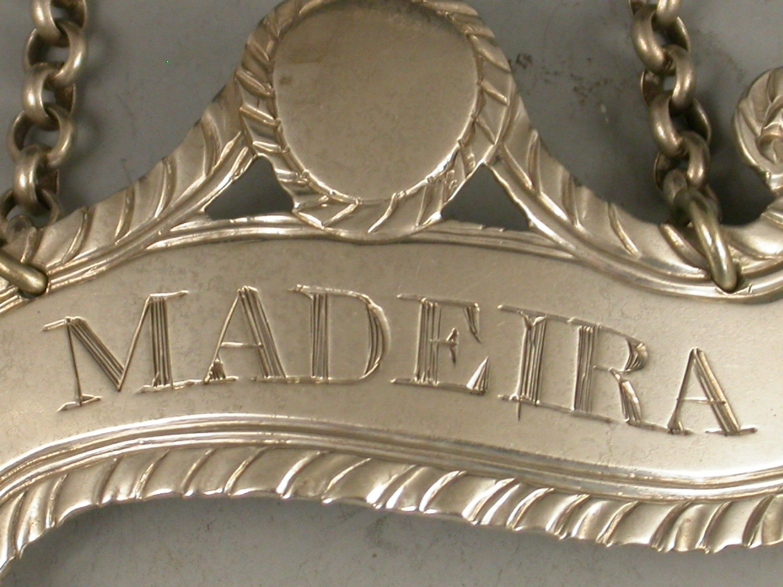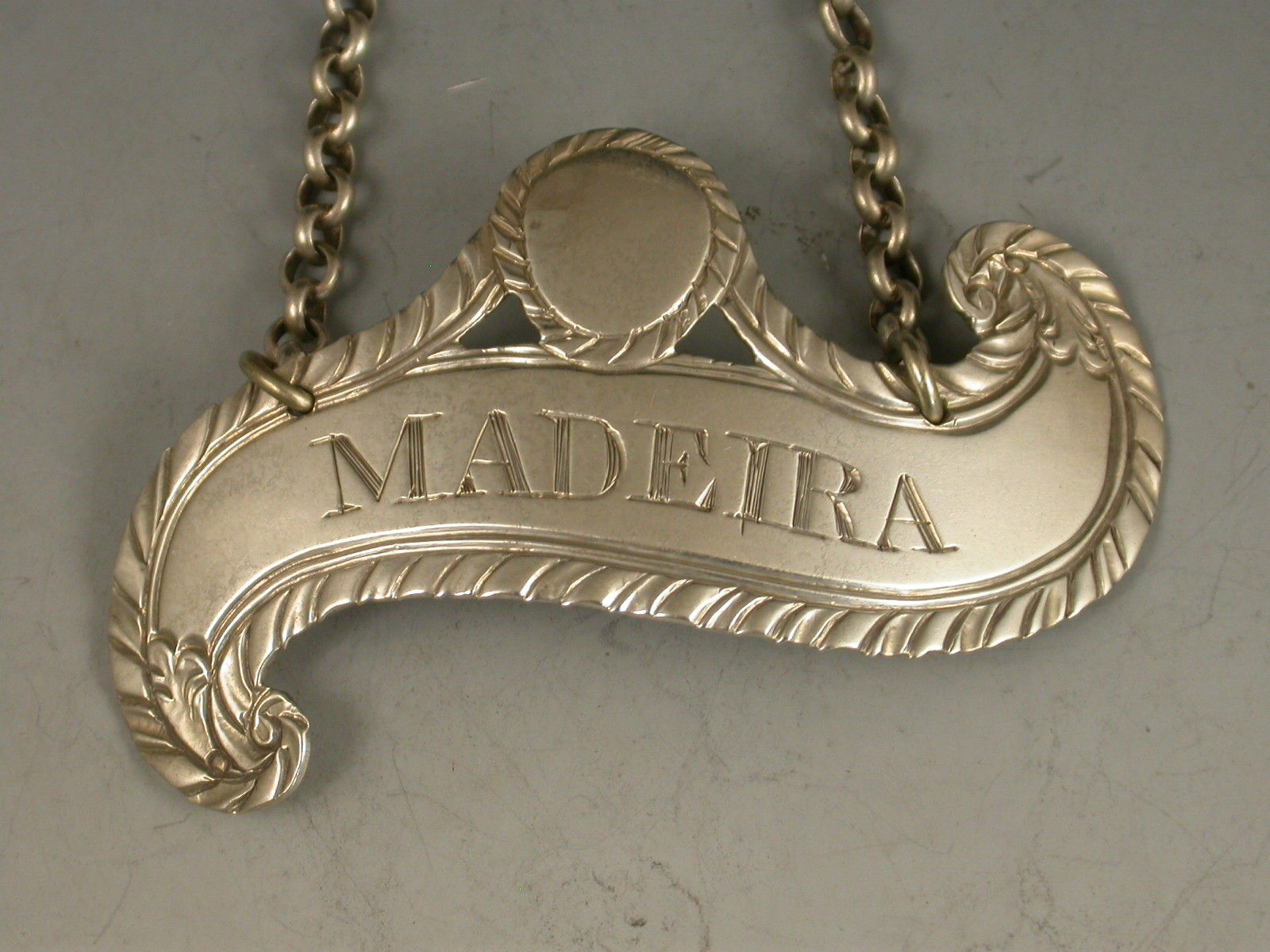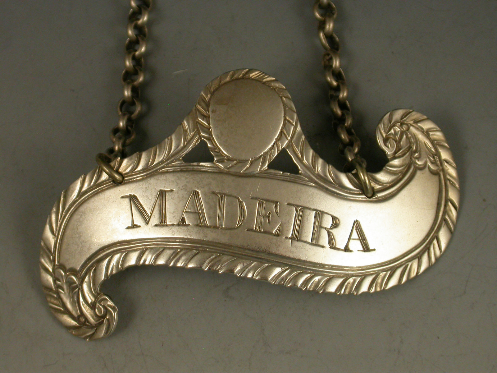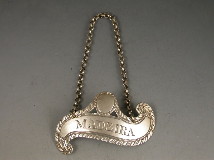 George III Antique Silver Scroll Wine Label 'Madeira'