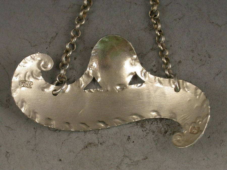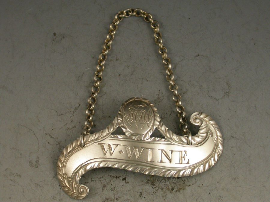 A fine George III silver Wine Label of scroll form with feather edge border, an oval cartouche above engraved with contemporary scrolled initials ""MAW"", incised for W*Wine.