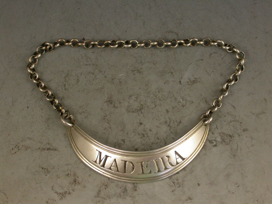 An unusual George III silver Wine Label of shallow crescent or gorget form with double reeded border, incised for Madeira.
