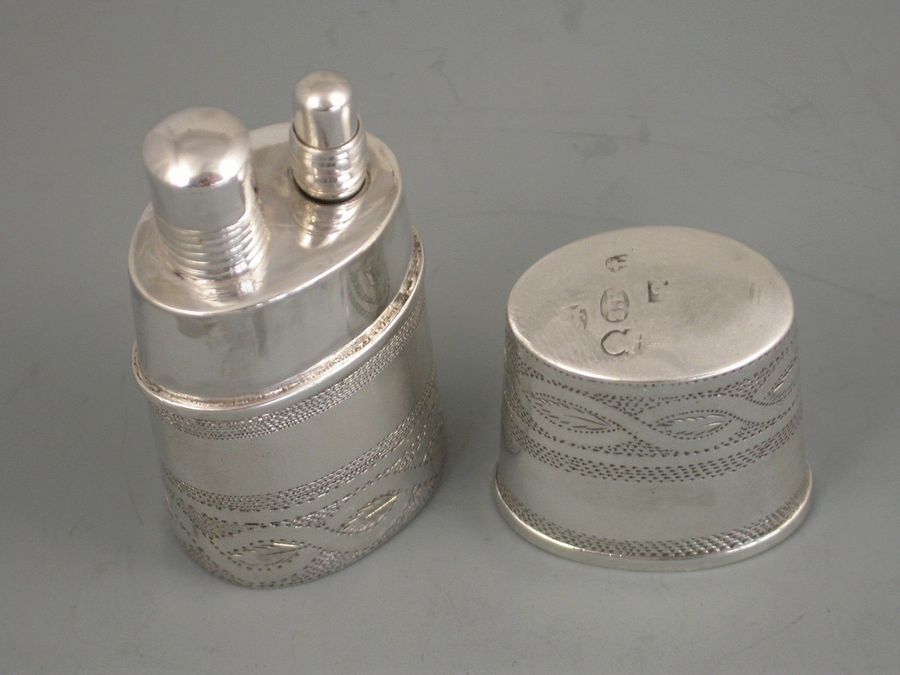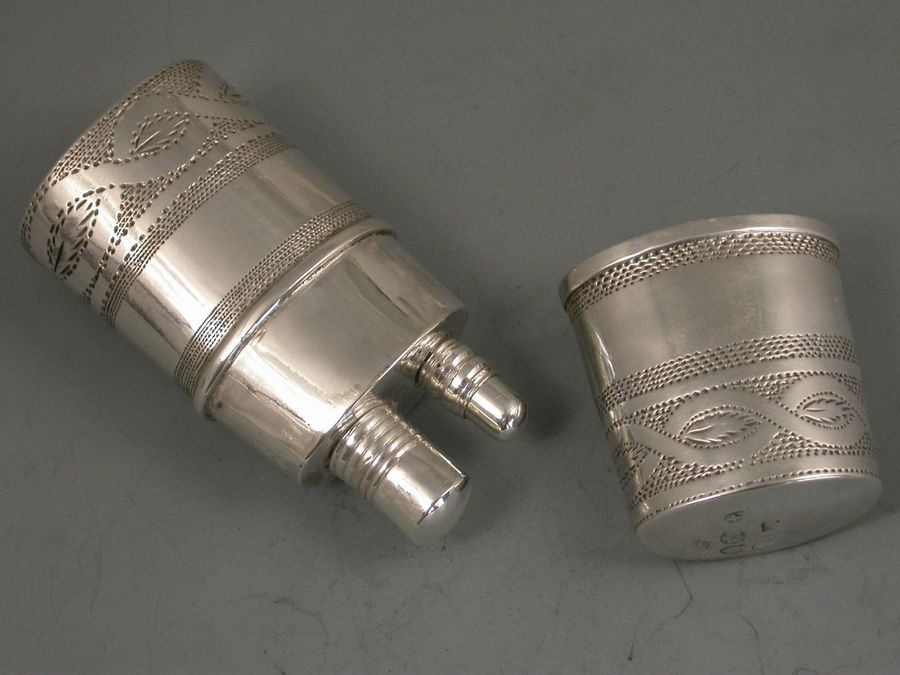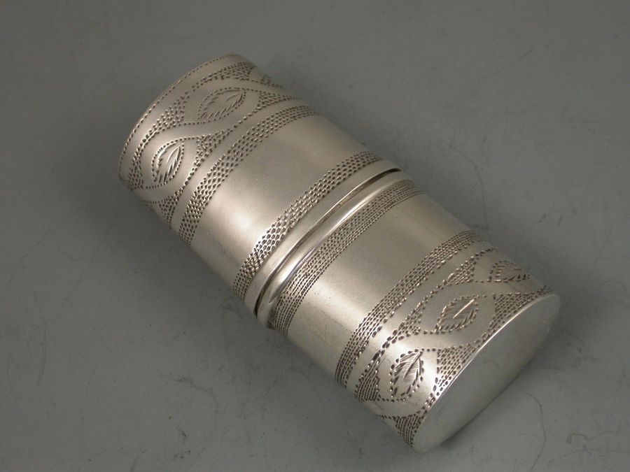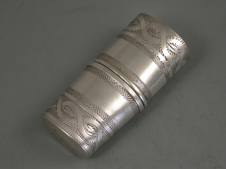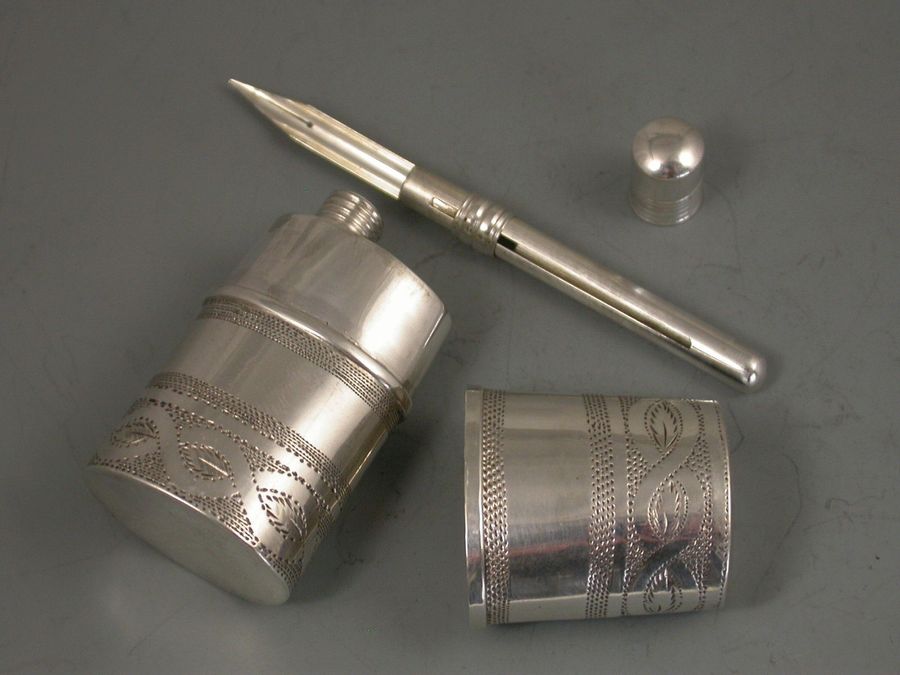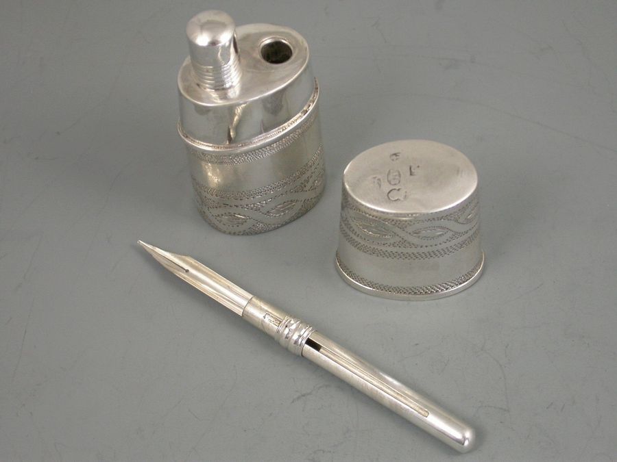 A rare George III Travelling Inkwell and Penner of oval tubular form with bands of bright cut engraved decoration, the inkwell with screw-off cover, the penner with sliding collar.
