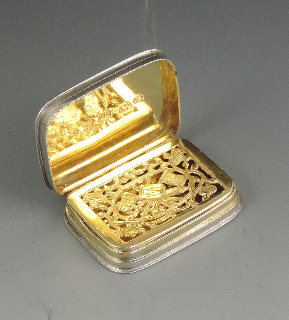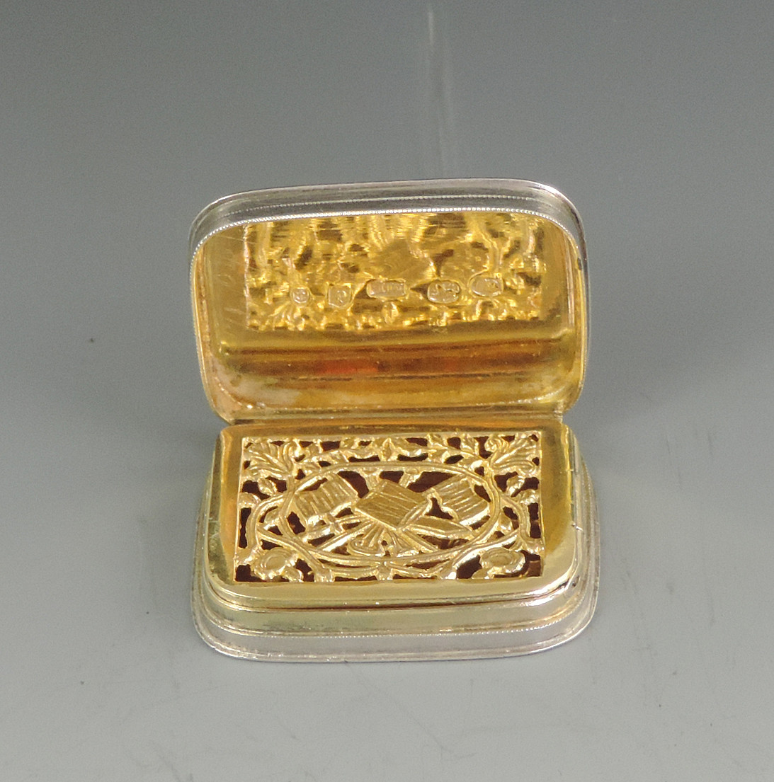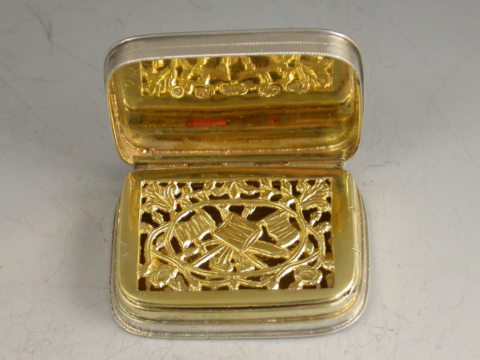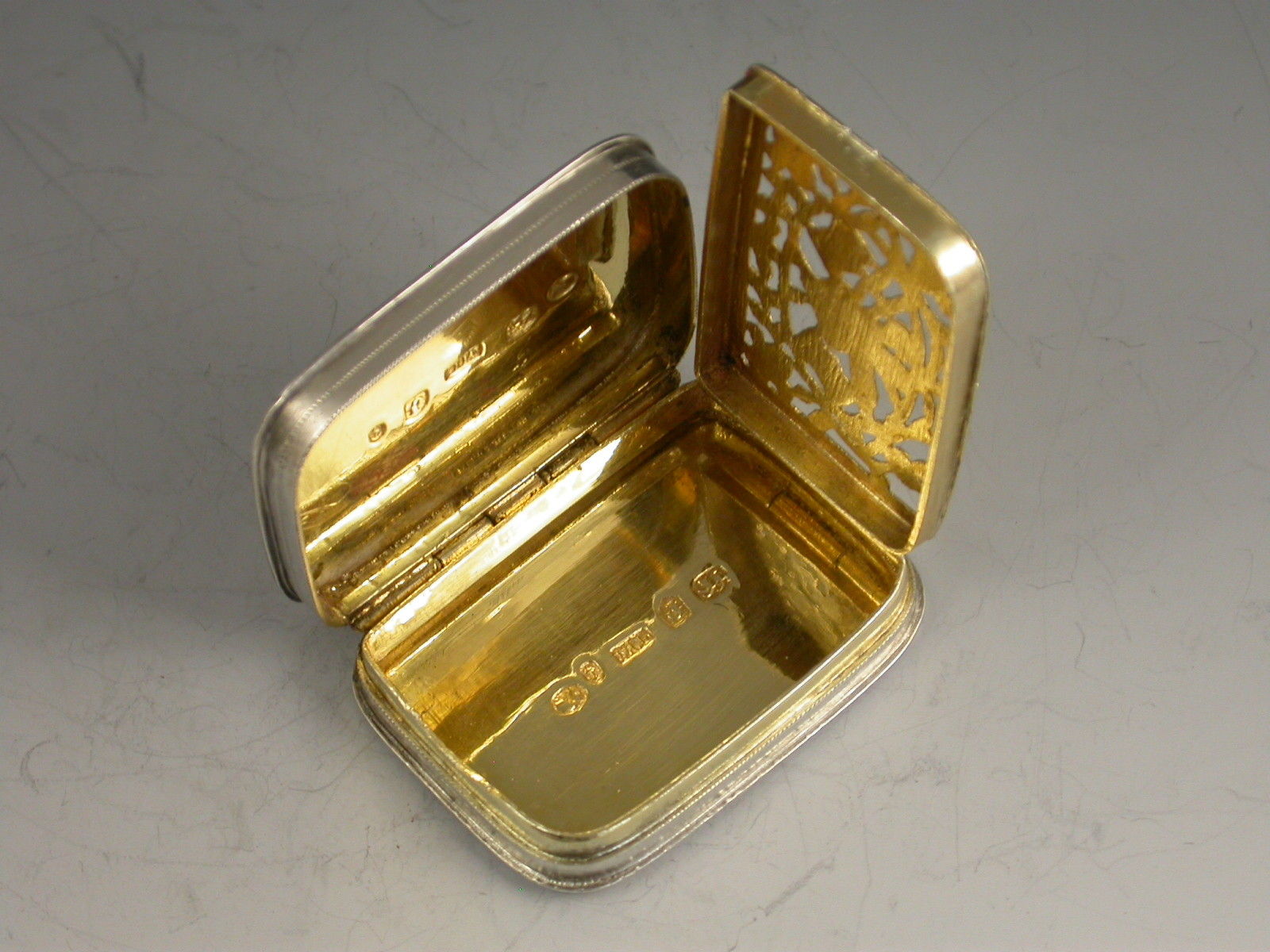 A good George III silver Vinaigrette of plain rounded rectangular form with bright-cut engraved flower decoration to the base and a crest to the lid. The silver gilt interior with finely pierced 'Trophy Grille' consisting of flags, a drum, a sabre, two horns, and two fleur de lys and two roses to the corners.