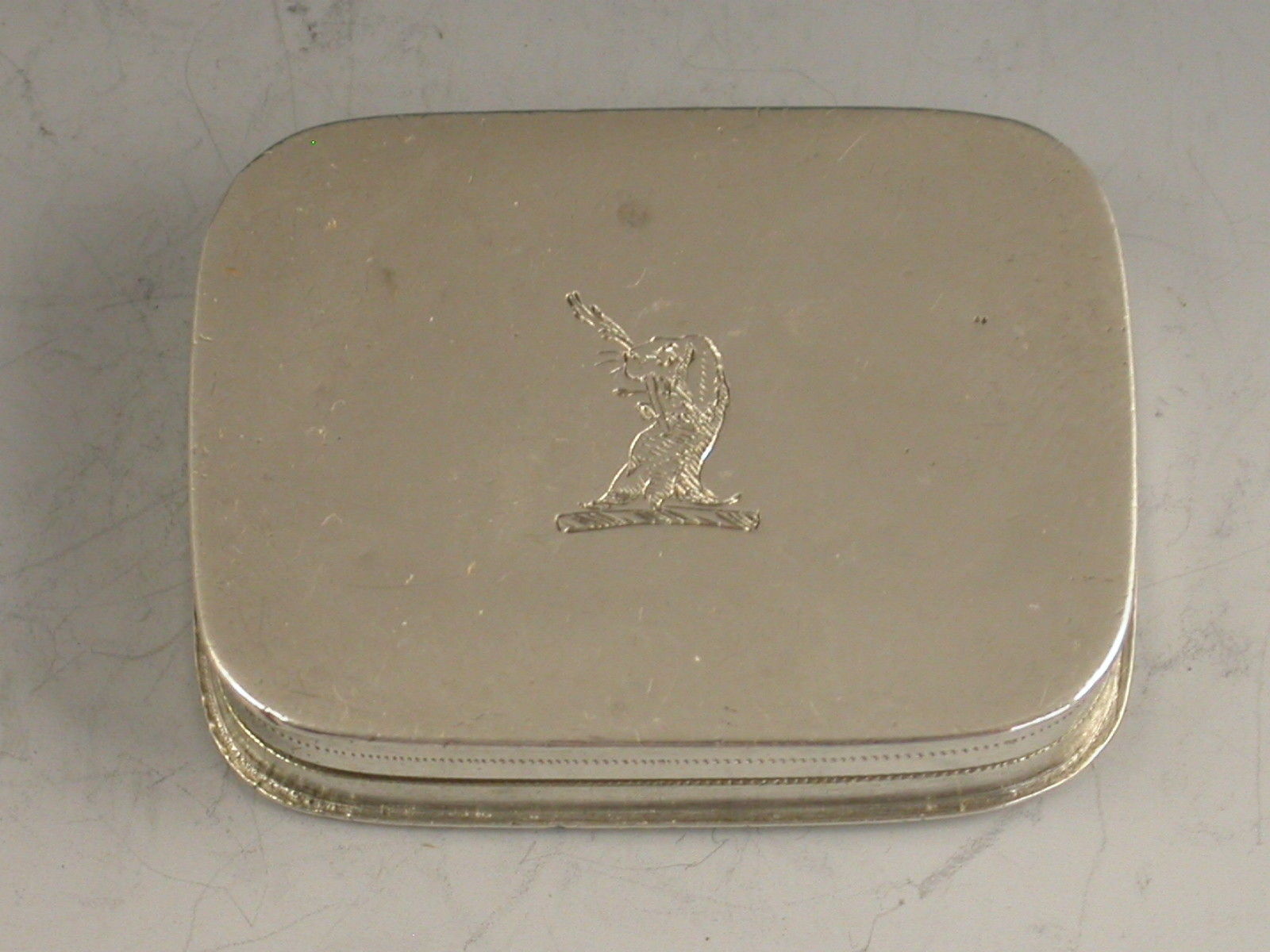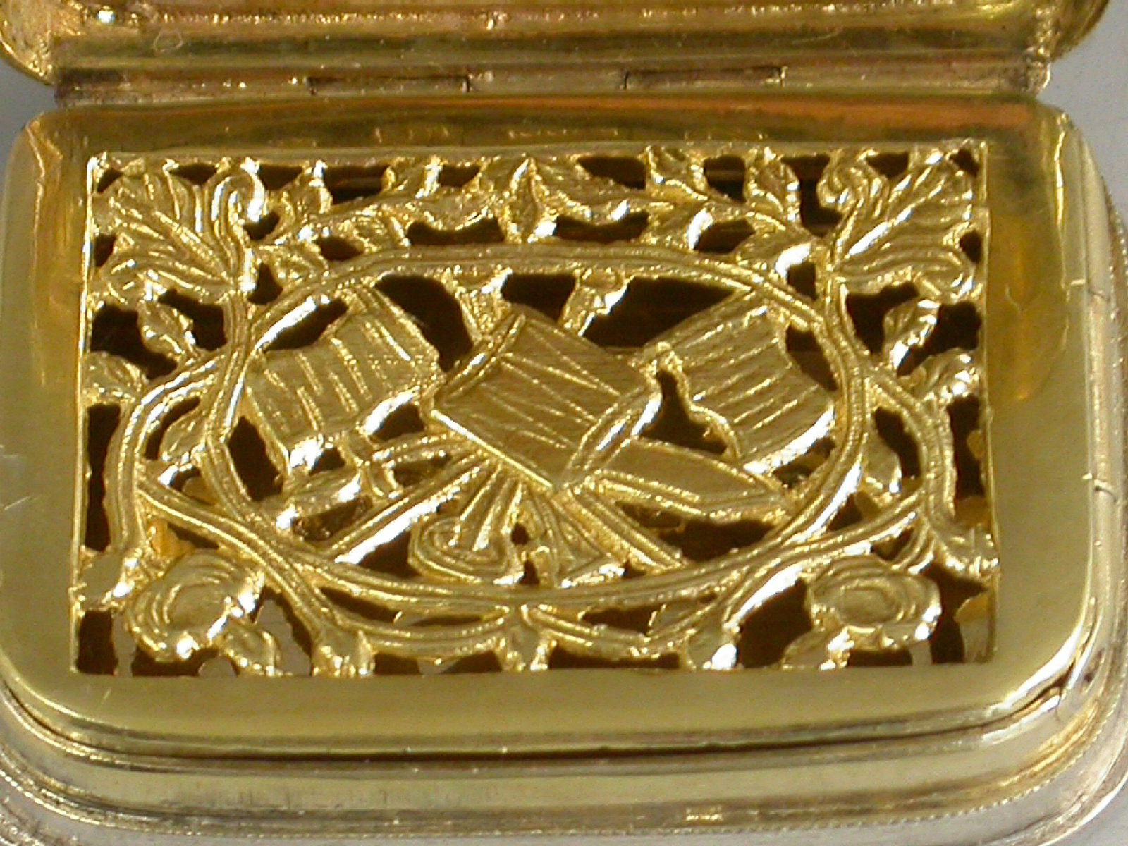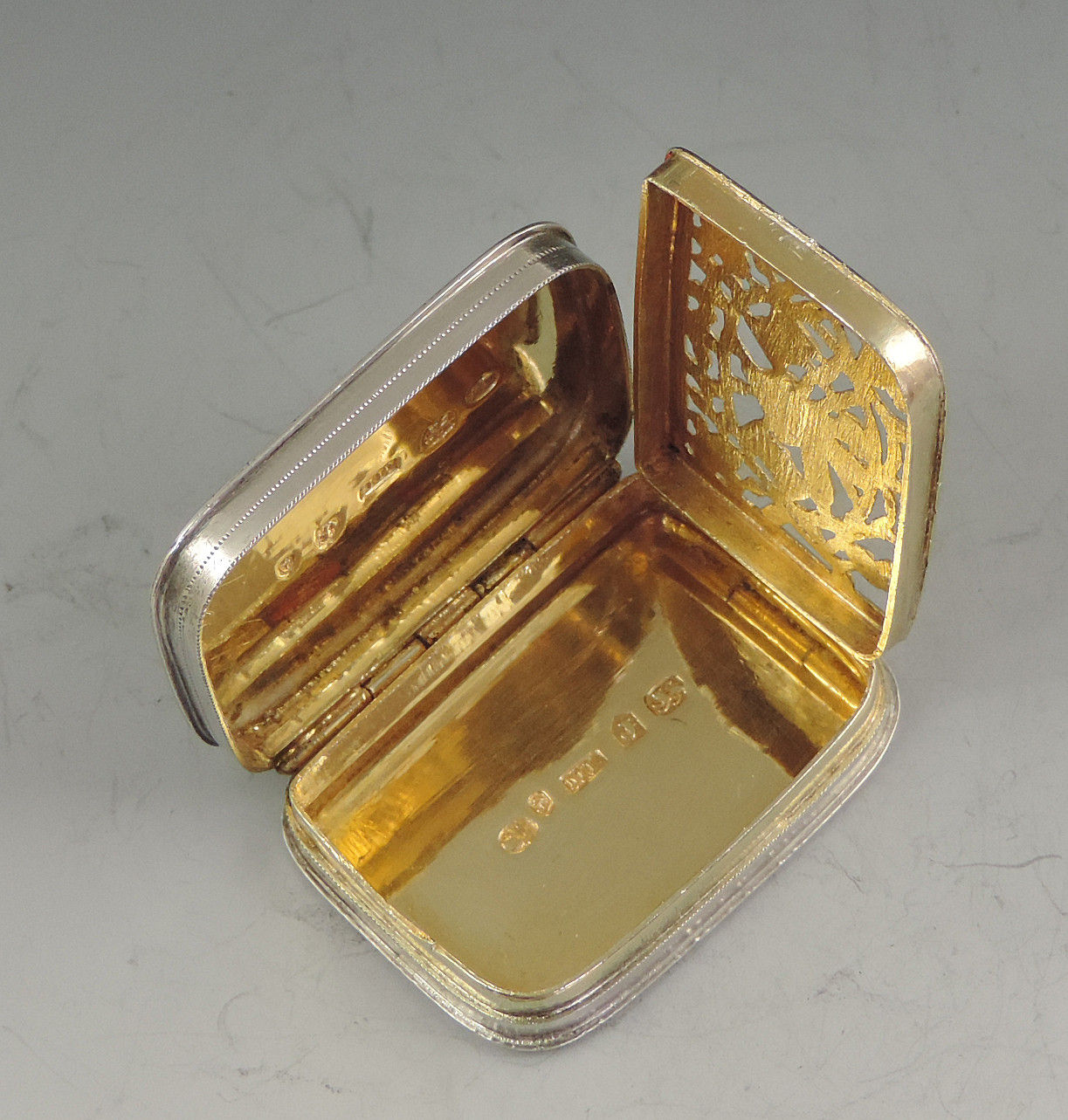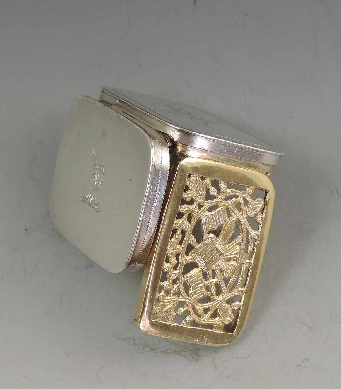 A good George III silver Vinaigrette of plain rounded rectangular form with bright-cut engraved flower decoration to the base and a crest to the lid. The silver gilt interior with finely pierced 'Trophy Grille' consisting of flags, a drum, a sabre, two horns, and two fleur de lys and two roses to the corners.