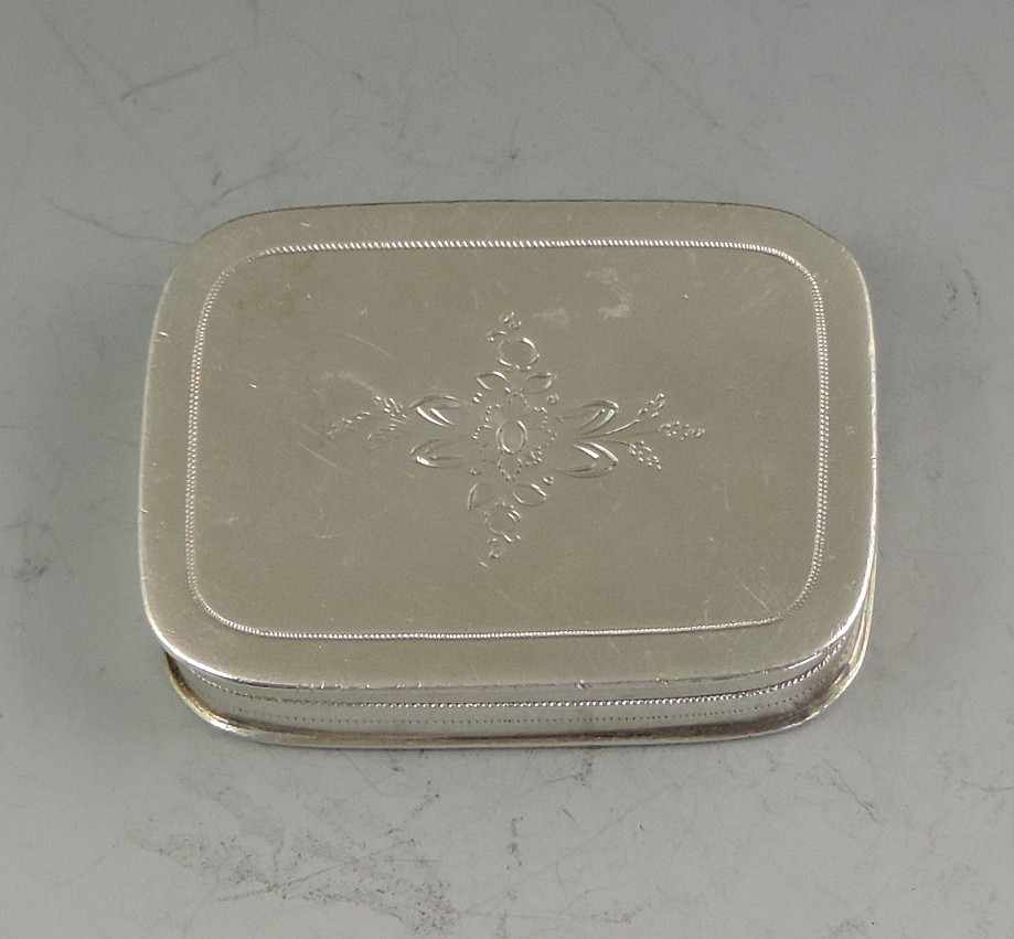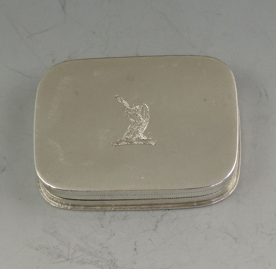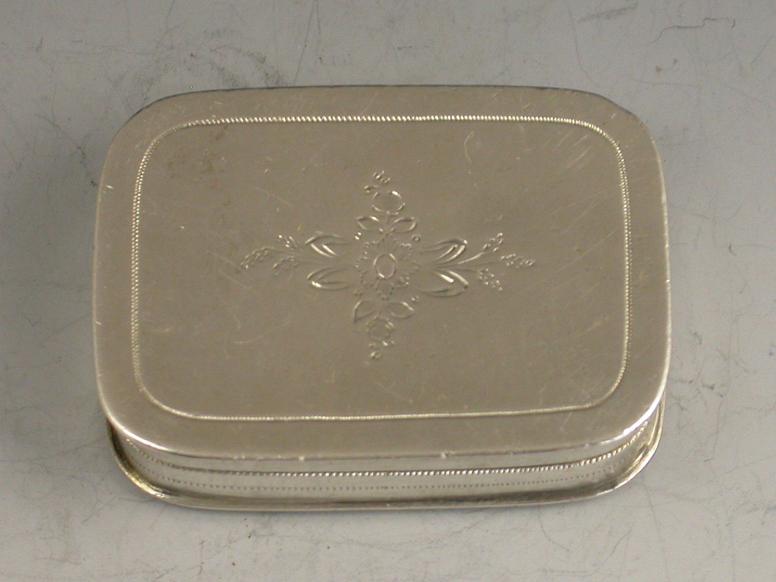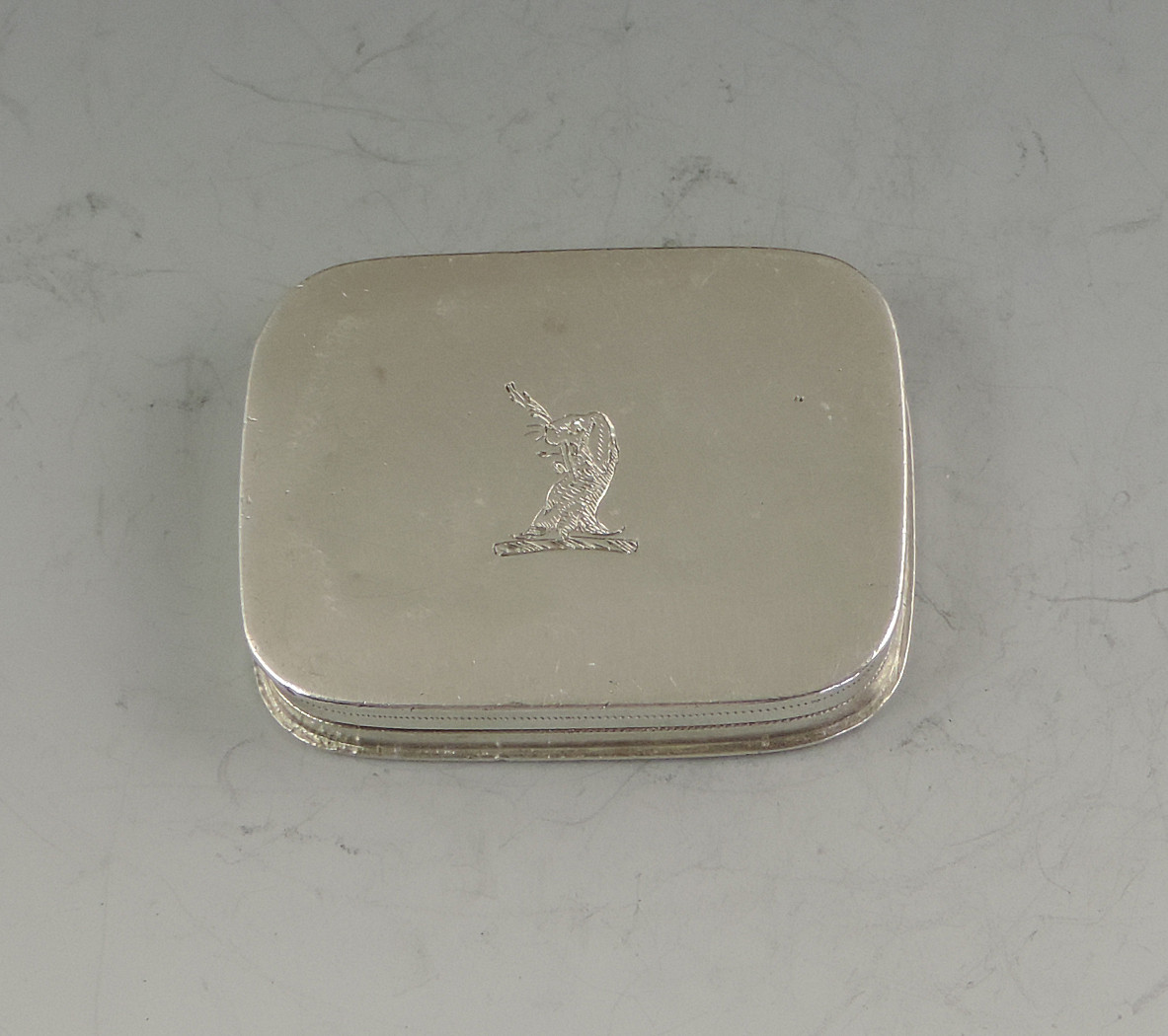 A good George III silver Vinaigrette of plain rounded rectangular form with bright-cut engraved flower decoration to the base and a crest to the lid. The silver gilt interior with finely pierced 'Trophy Grille' consisting of flags, a drum, a sabre, two horns, and two fleur de lys and two roses to the corners.