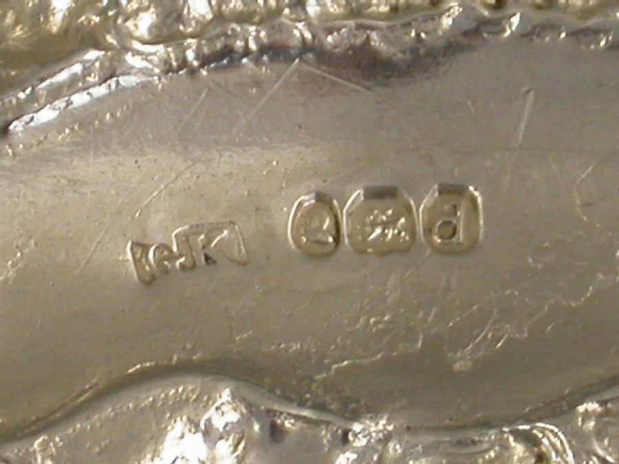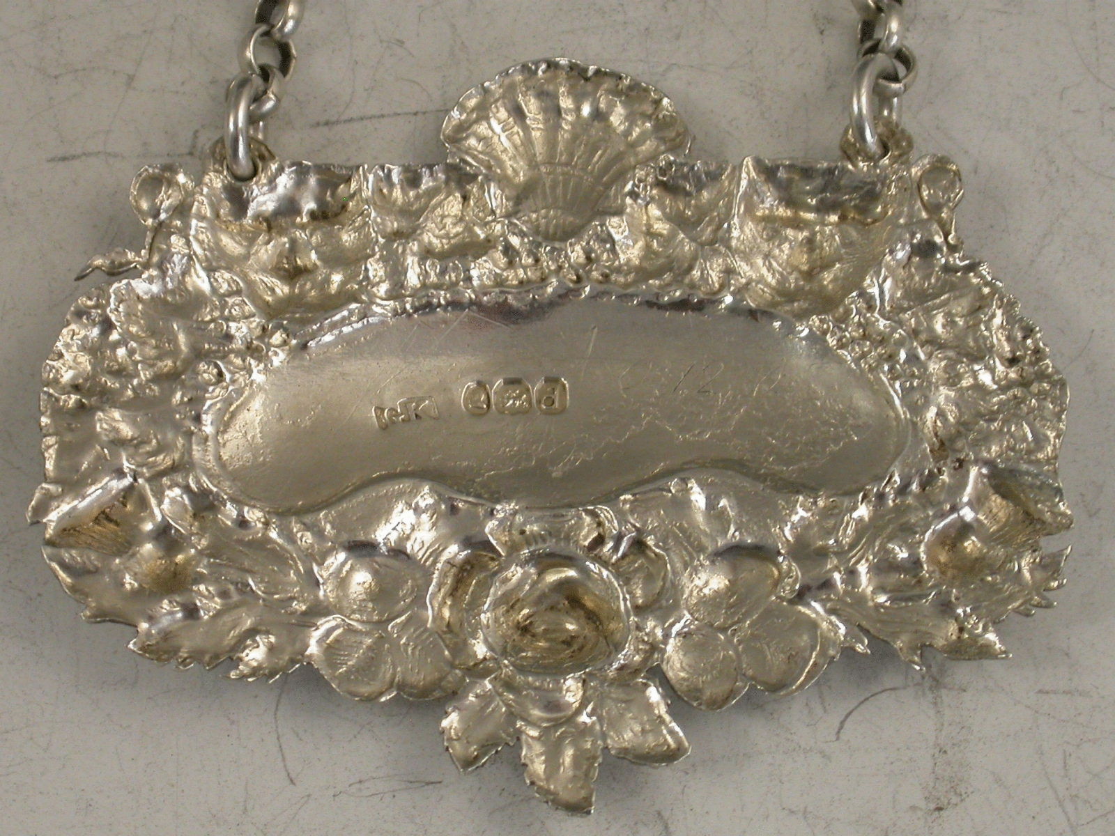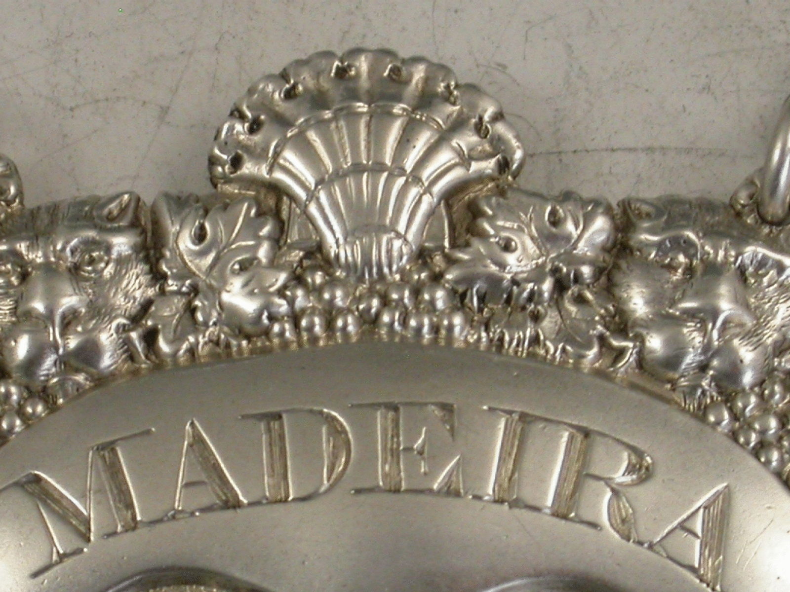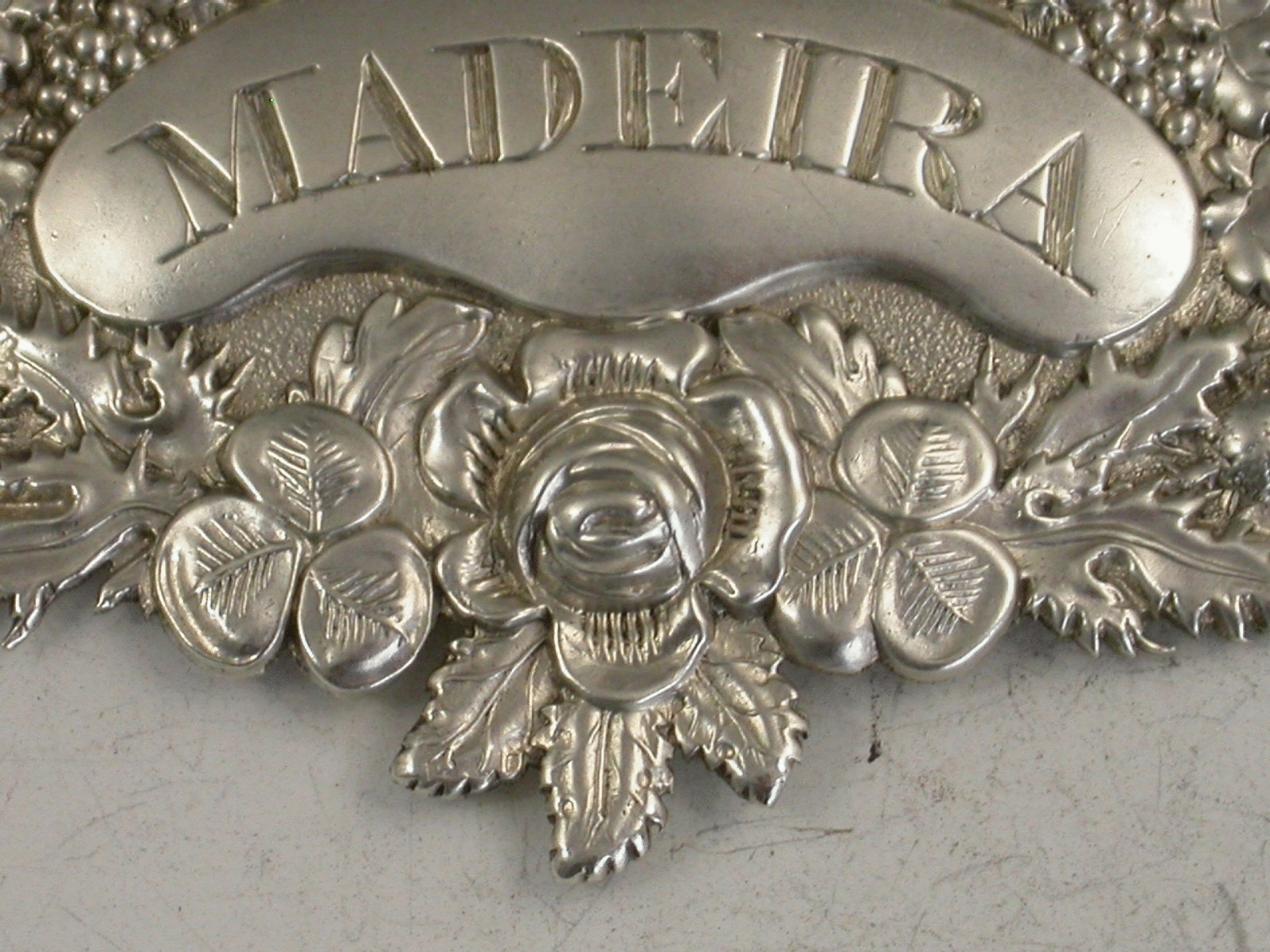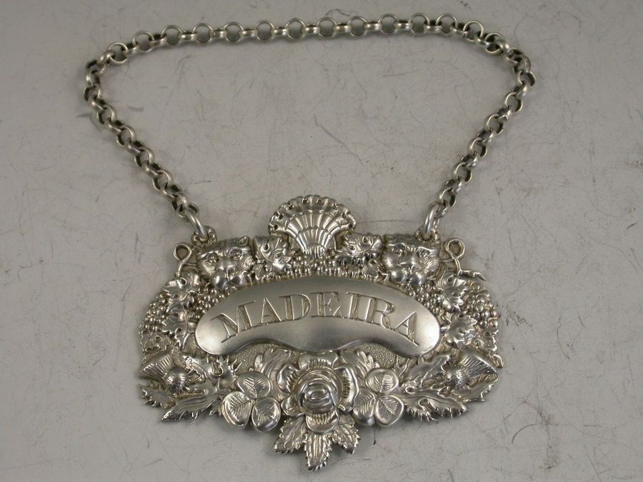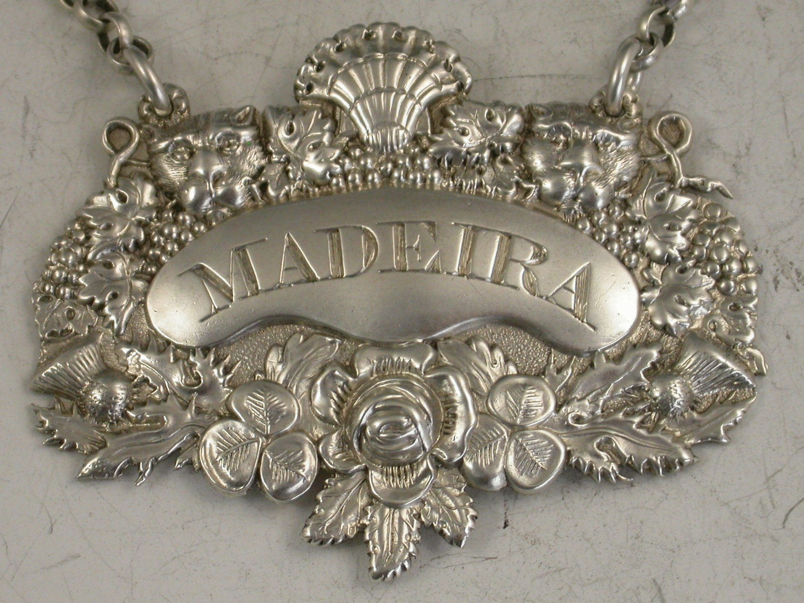 A rare George III die-stamped silver Wine Label of shaped oval form with elaborate decoration depicting the English Rose, the Scottish Thistle and the Irish Shamrock, below a down curved name plate incised for Madeira, two leopards heads amongst vine leaves and grapes centered by a shell above.