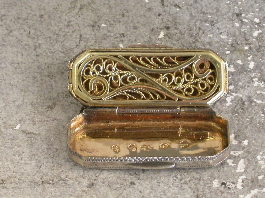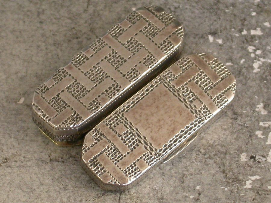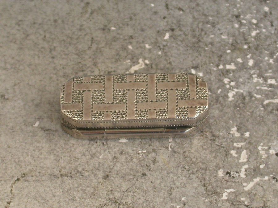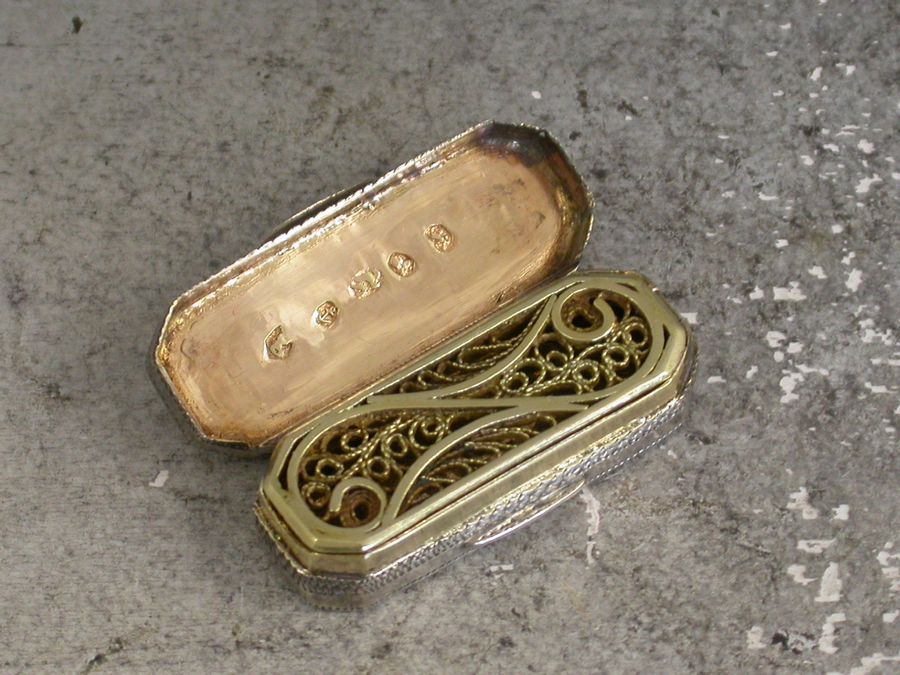 A fine quality George III silver Vinaigrette of small narrow rectangular form with cut -corners, the lid and base engraved with inter-woven lattice type decoration on a matt background. The silver gilt interior with intricate hinged filigree grille.