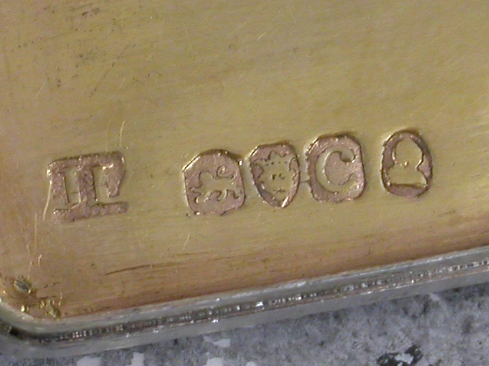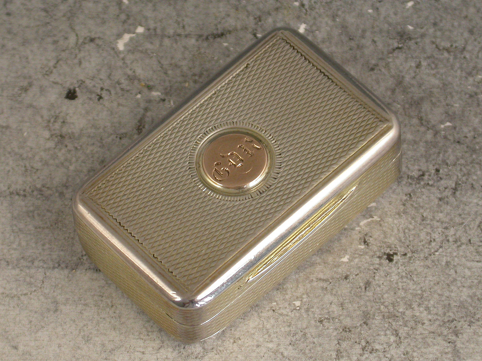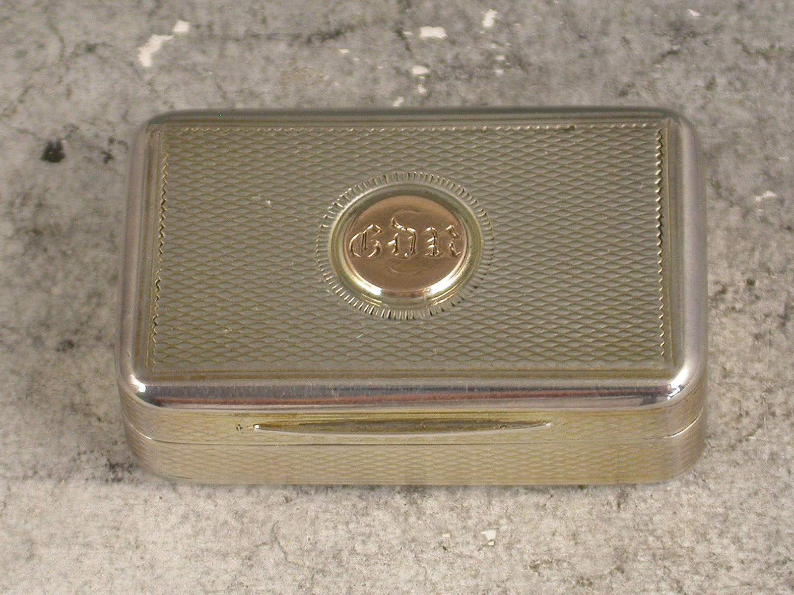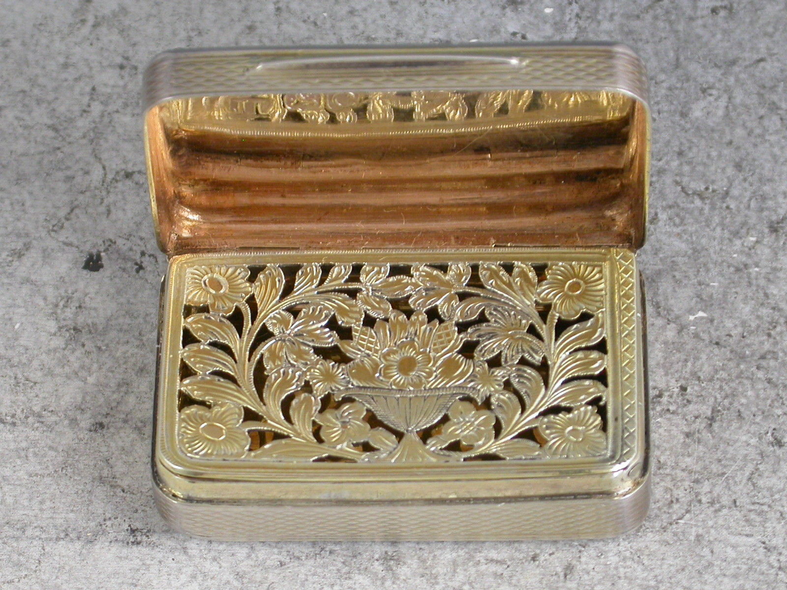 A fine quality George III London made Vinaigrette of rounded oblong form, with all-over engine turned decoration and applied circular gold cartouche to the lid engraved with the initials 'CDR'. The silver gilt interior with very finely pierced grille depicting a vase of flowers amongst other flowering stems