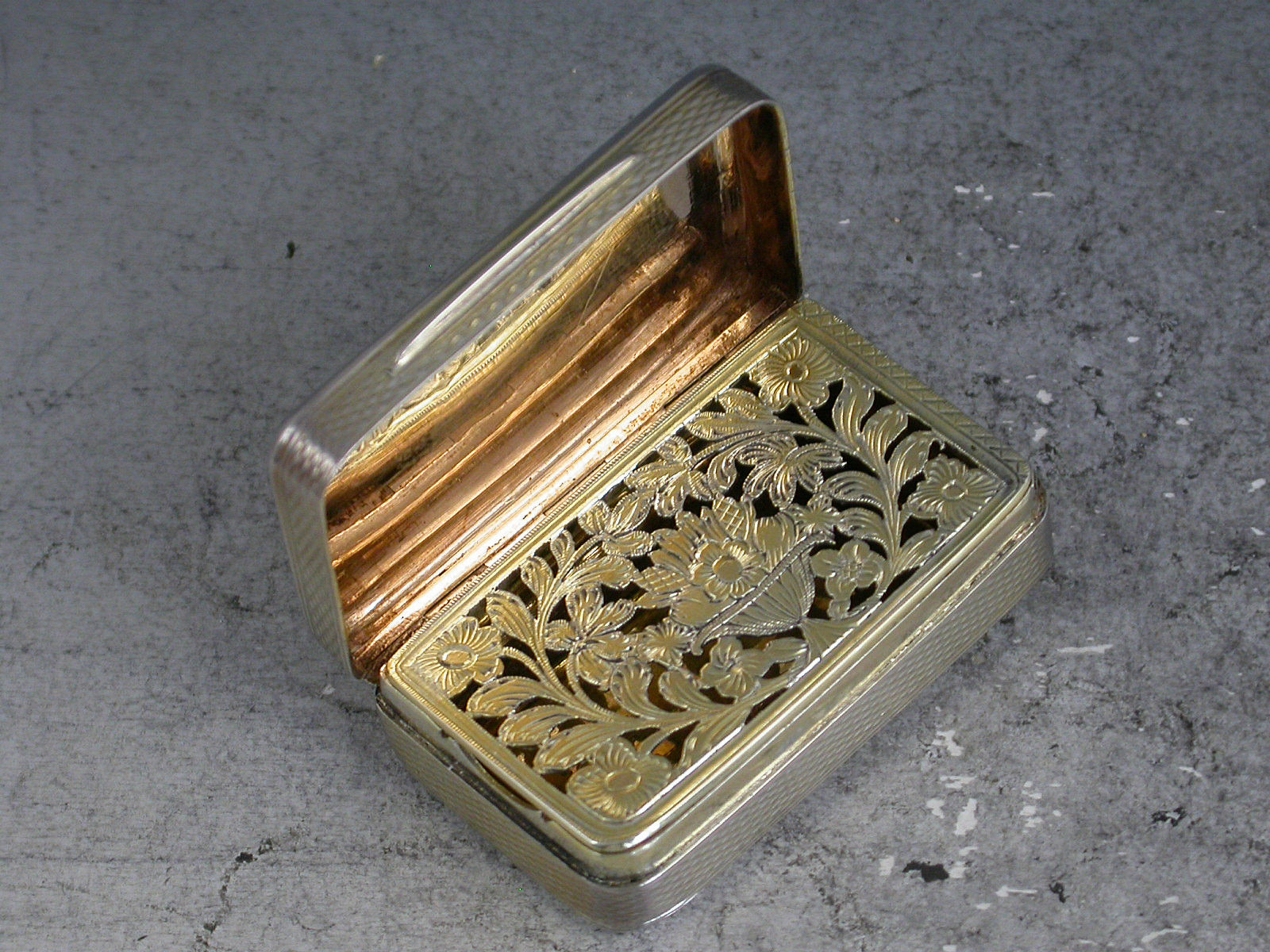 George III Antique Silver Vinaigrette with Gold Cartouche - Vase of Flowers Grille