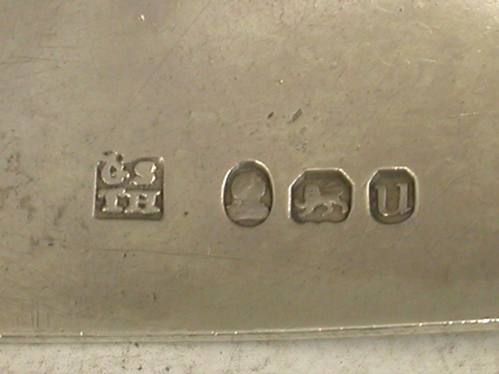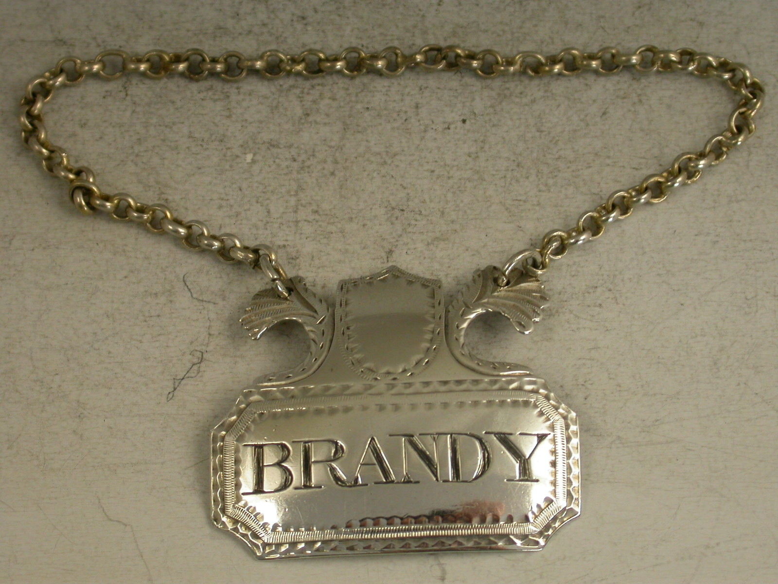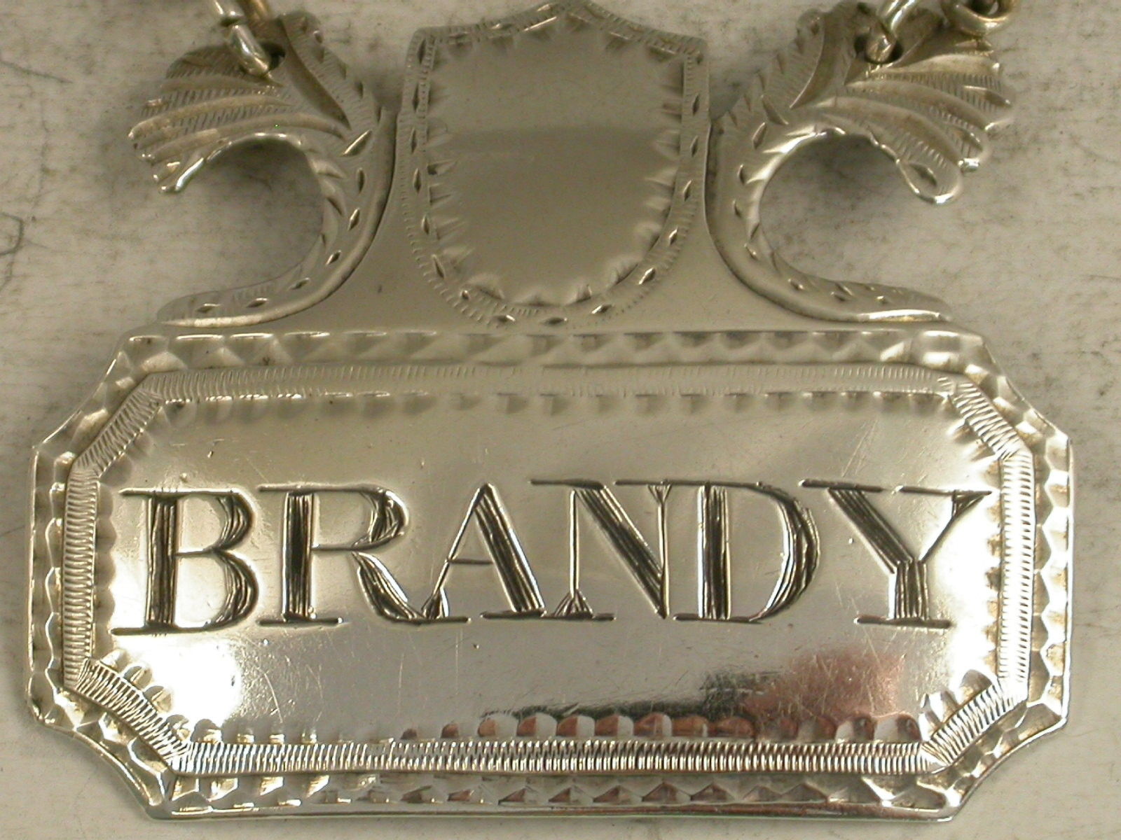 A good George III silver Wine Label of rectangular form with concave corners, a vacant shield shaped surmount supported by two Cornucopias, incised for Brandy within a bright cut engraved border.
