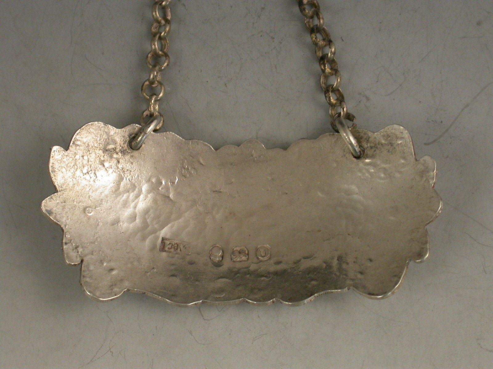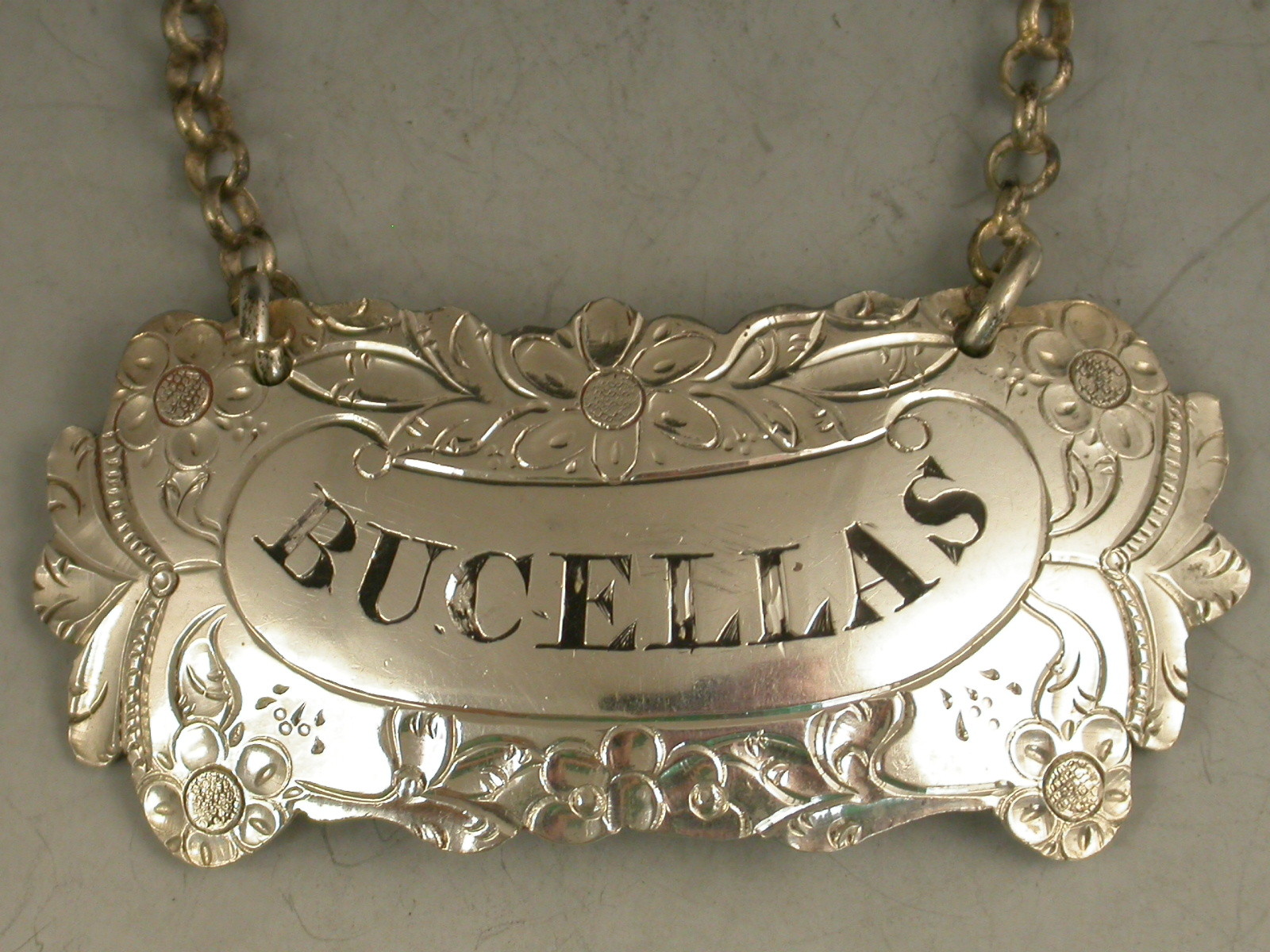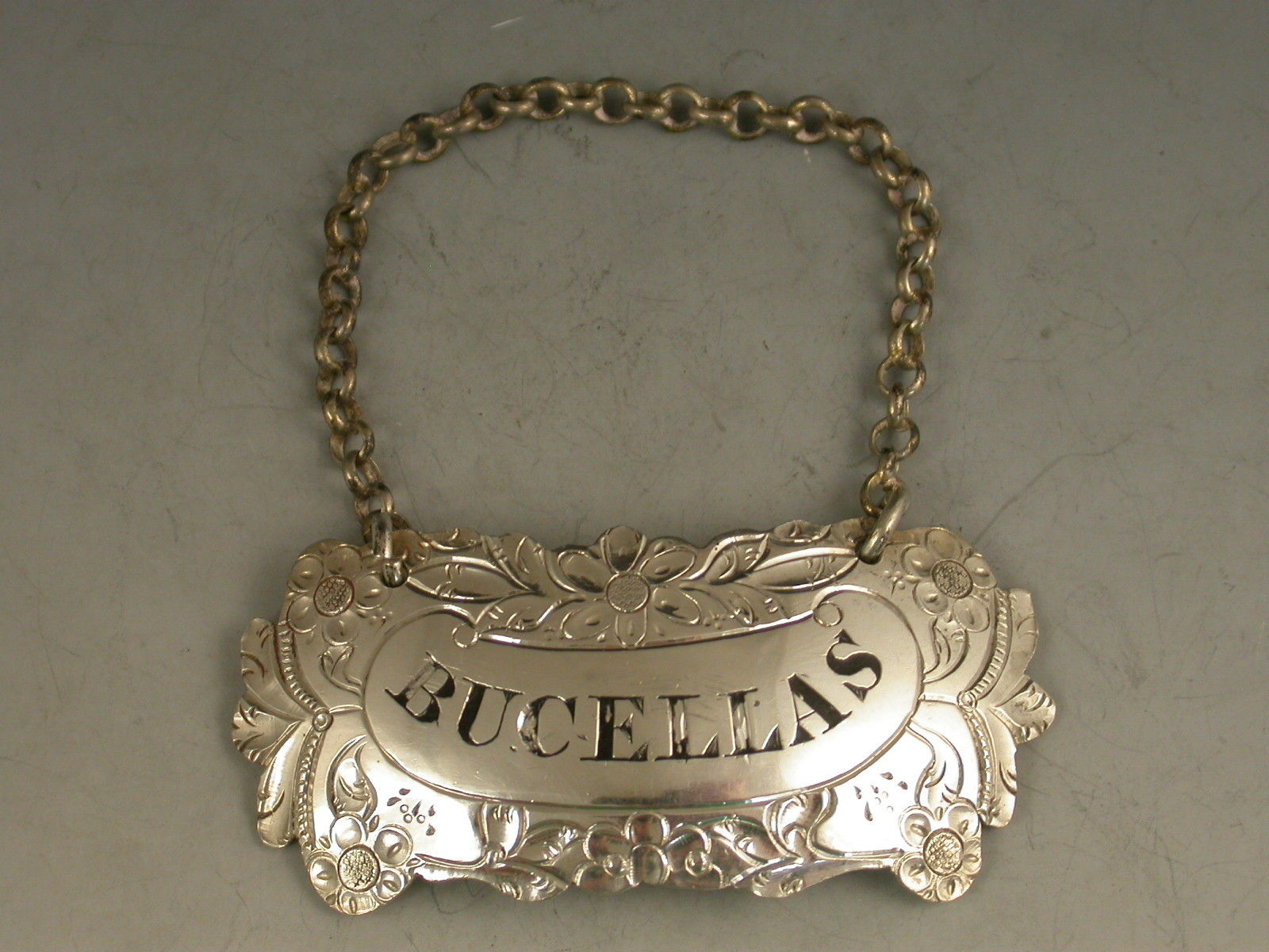 A rare George III silver Wine Label of shaped cartouche form, the border chased with scrolls and flower heads surrounding a scrolled name plate incised for Bucellas.