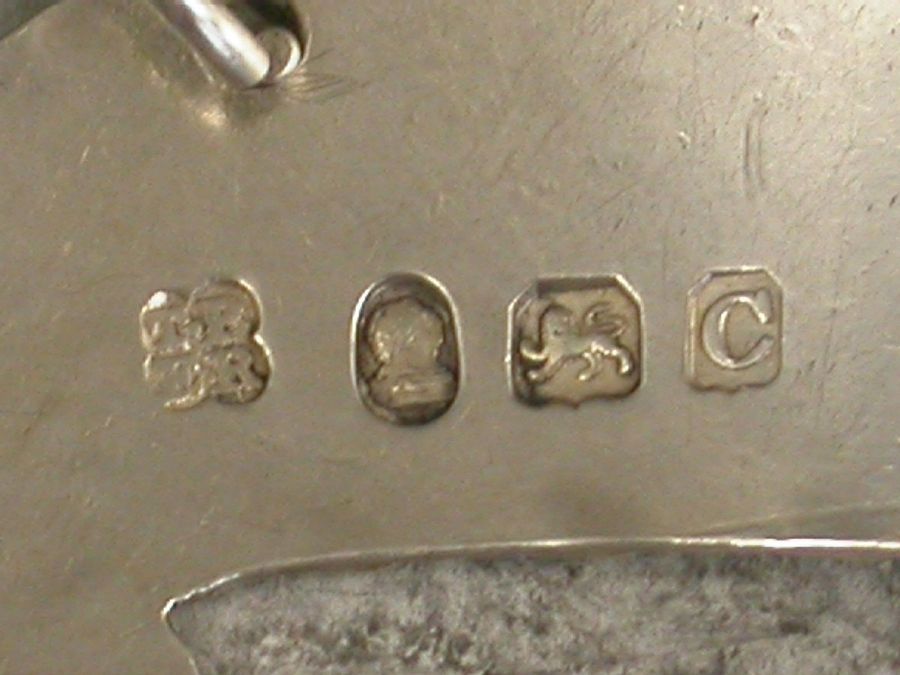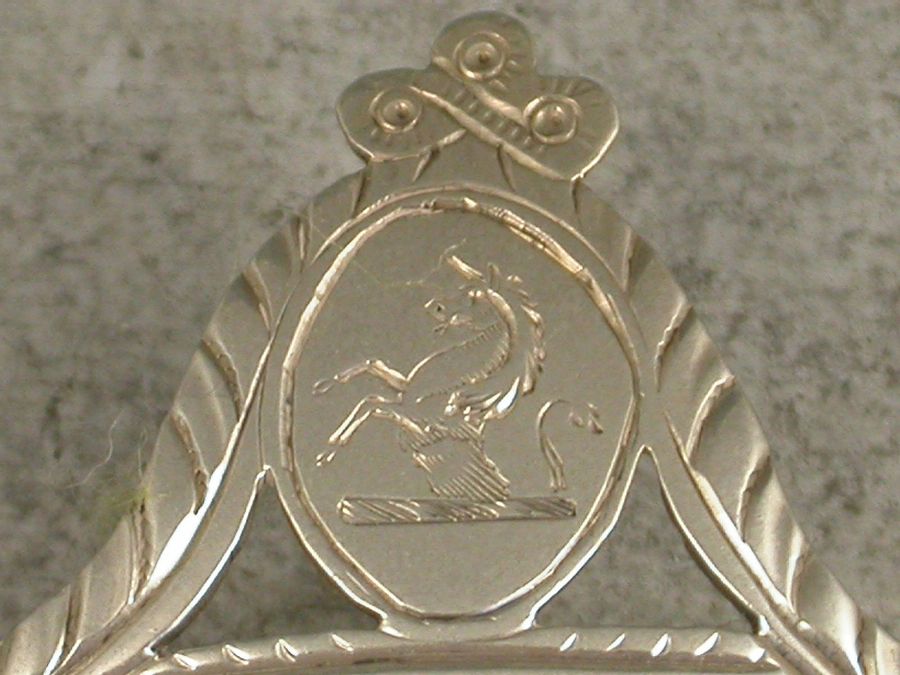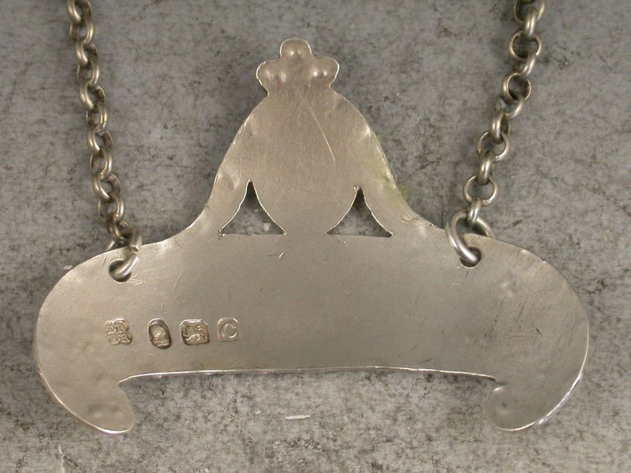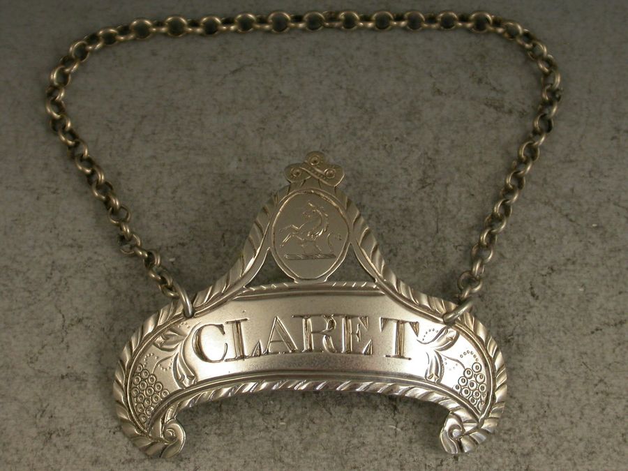 A good George III silver Wine Label of down turned crescent form with oval shield surmount, gadrooned border and bright-cut engraved floral devices to each end, incised for Claret. The cartouche engraved with a crest depicting a rampant Unicorn.