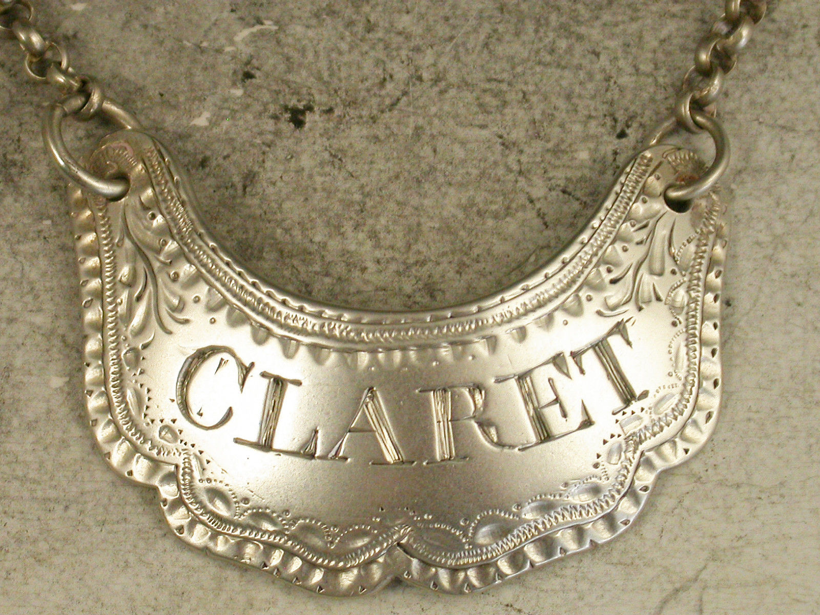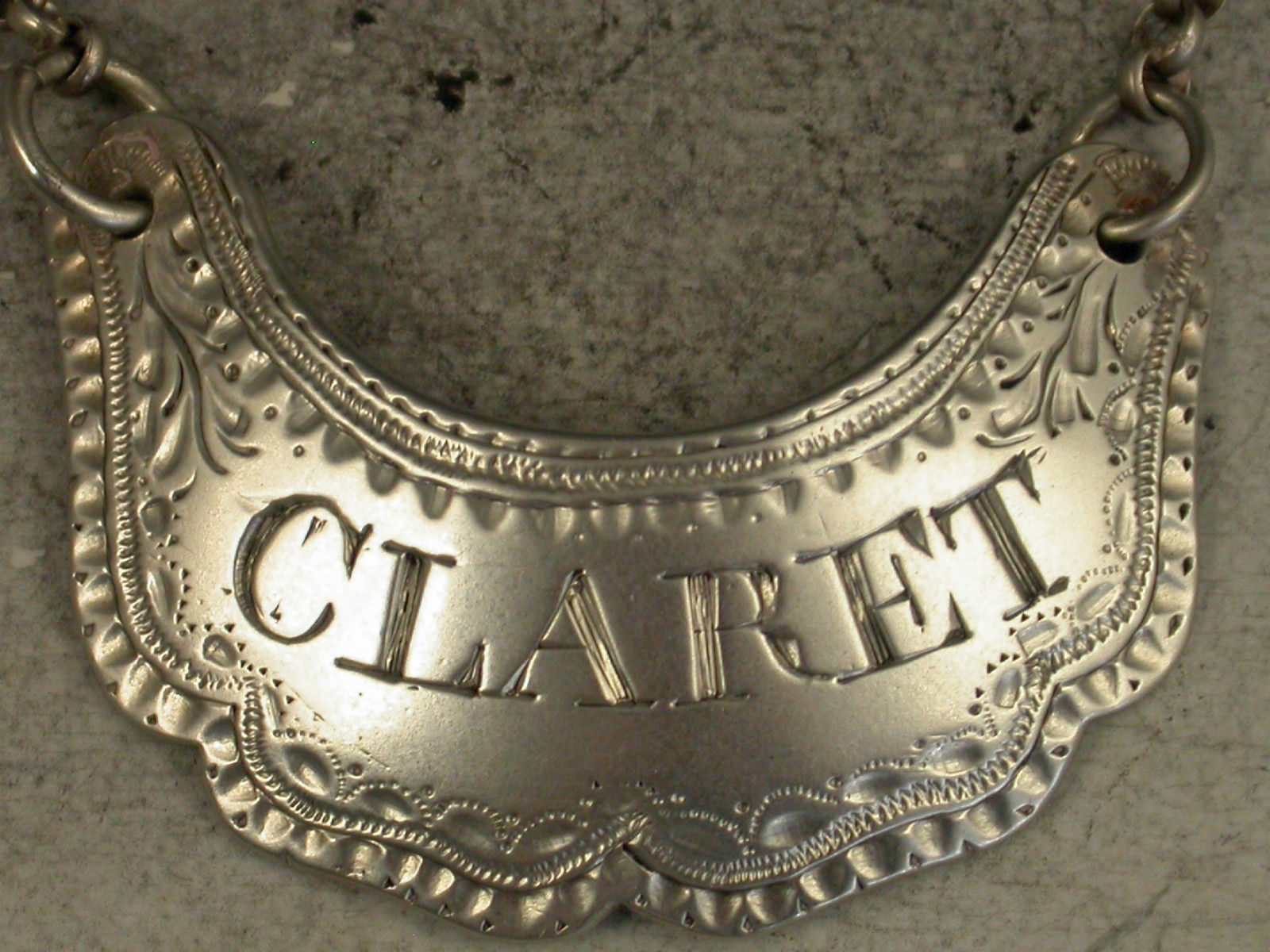 An unusual George III silver Wine Label of shaped crescent form with wavy lower edge and bright cut engraved and wriggle work decorated border, incised for Claret. The reverse engraved with contemporary initials 'H.L.'