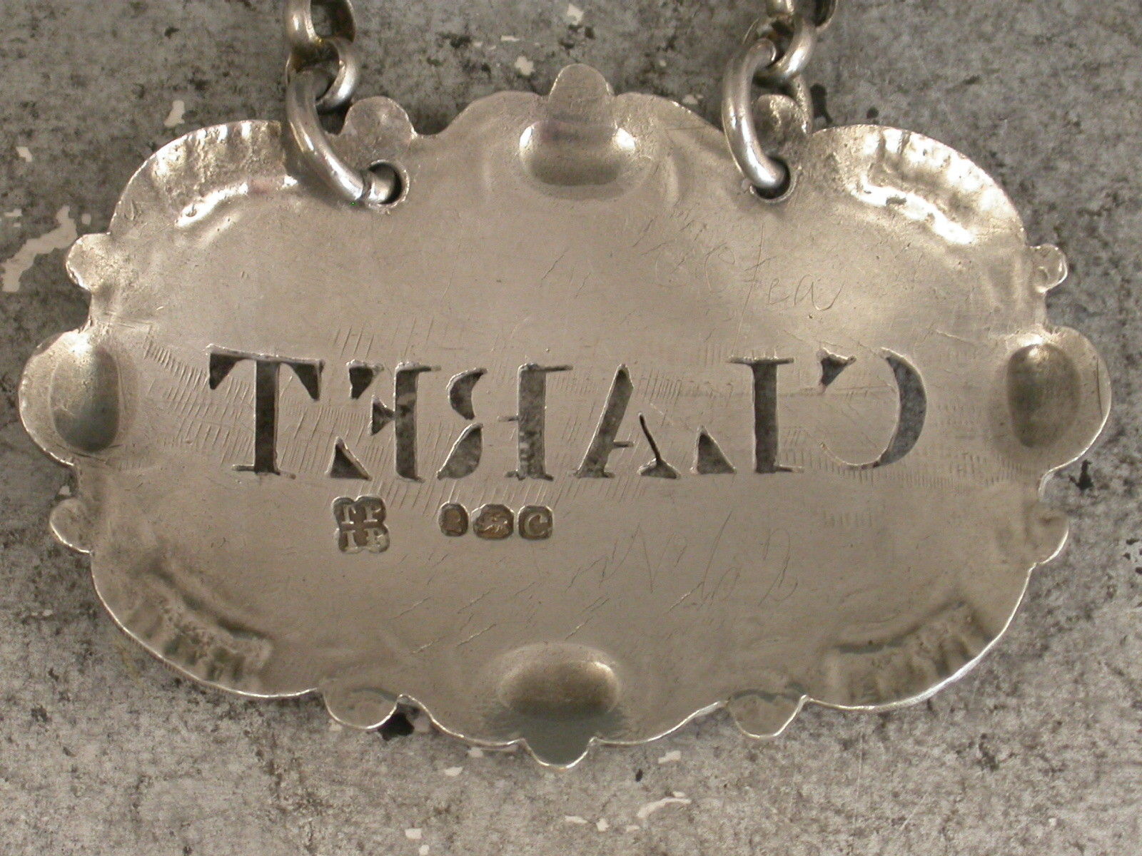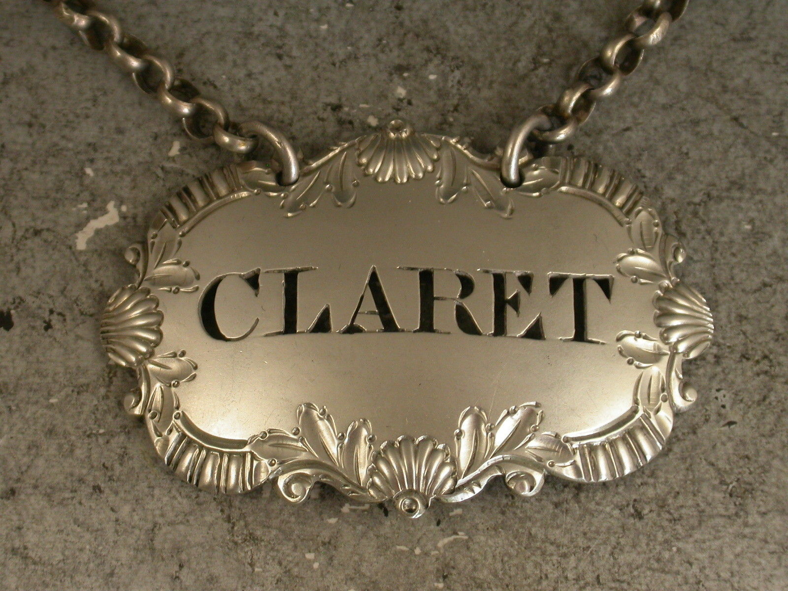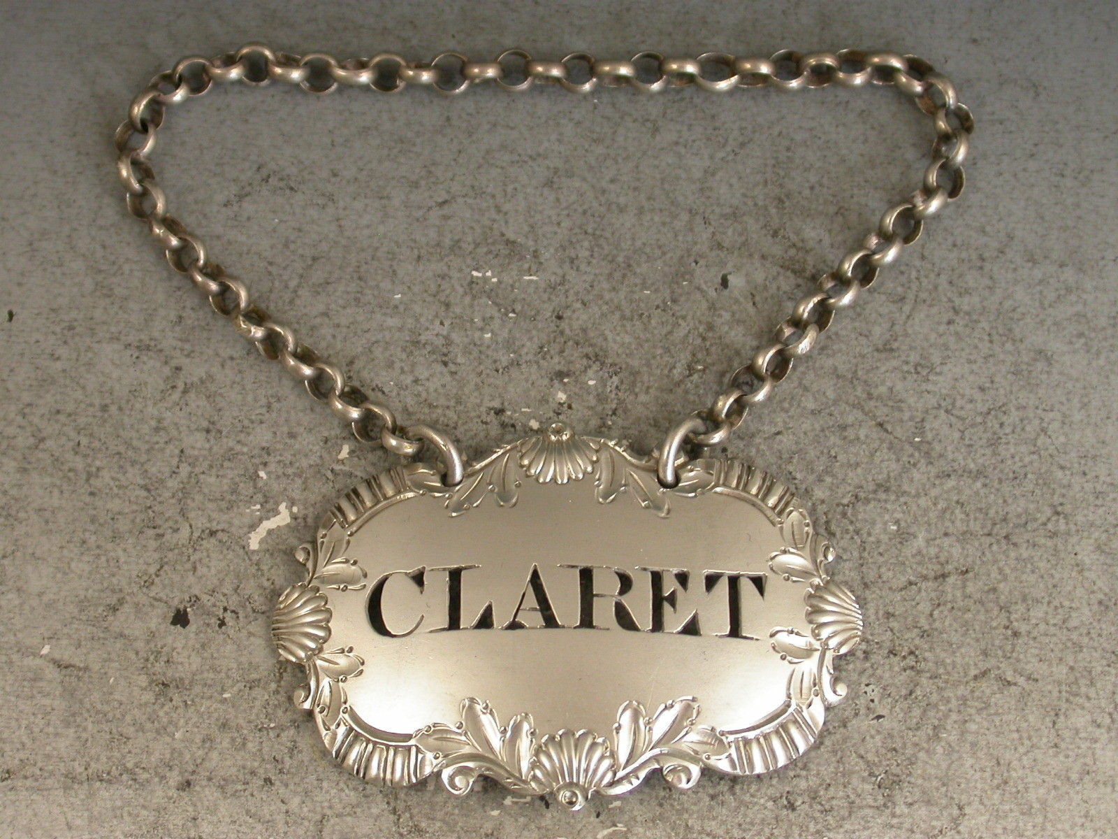 A good George III silver Wine Label of shaped oval form with gadrooned edge interspersed with shells and scrolled leaves, pierced for Claret.
