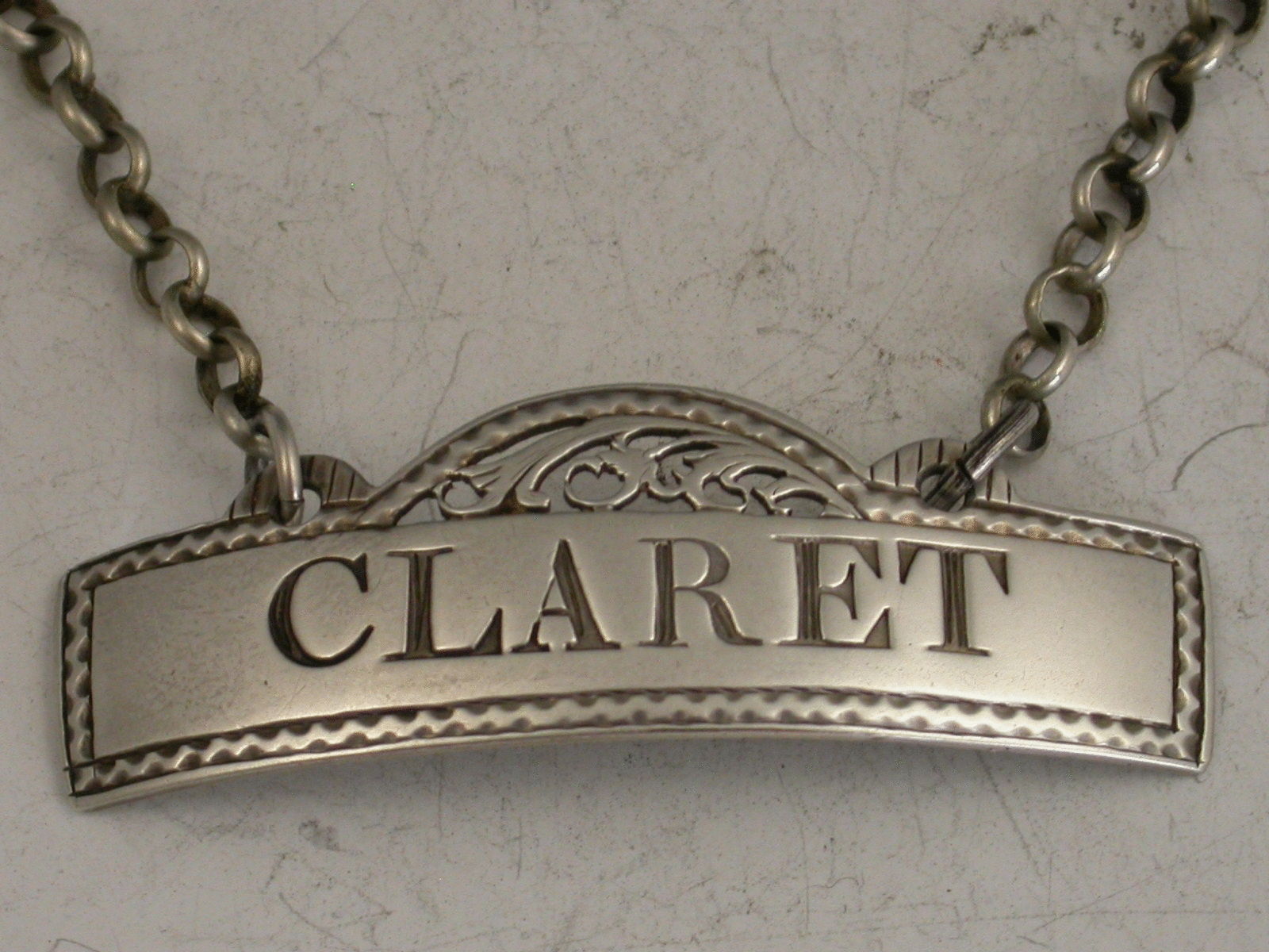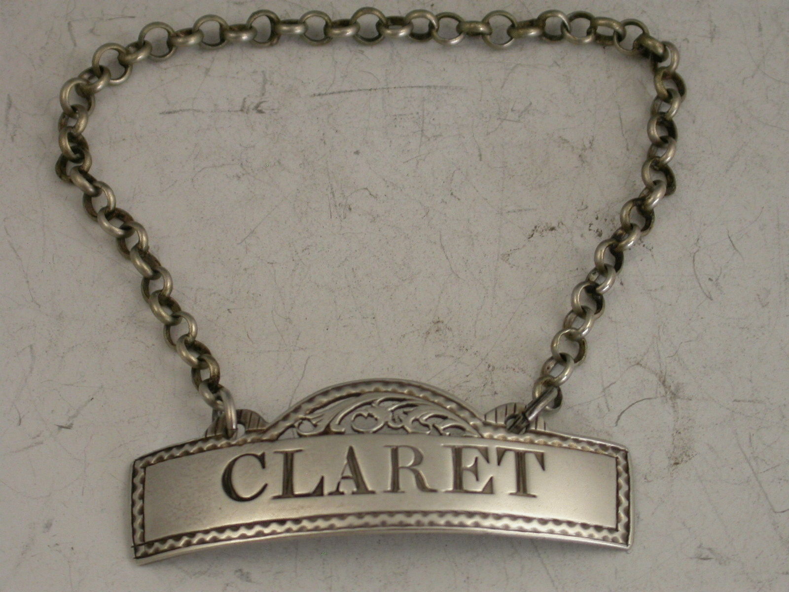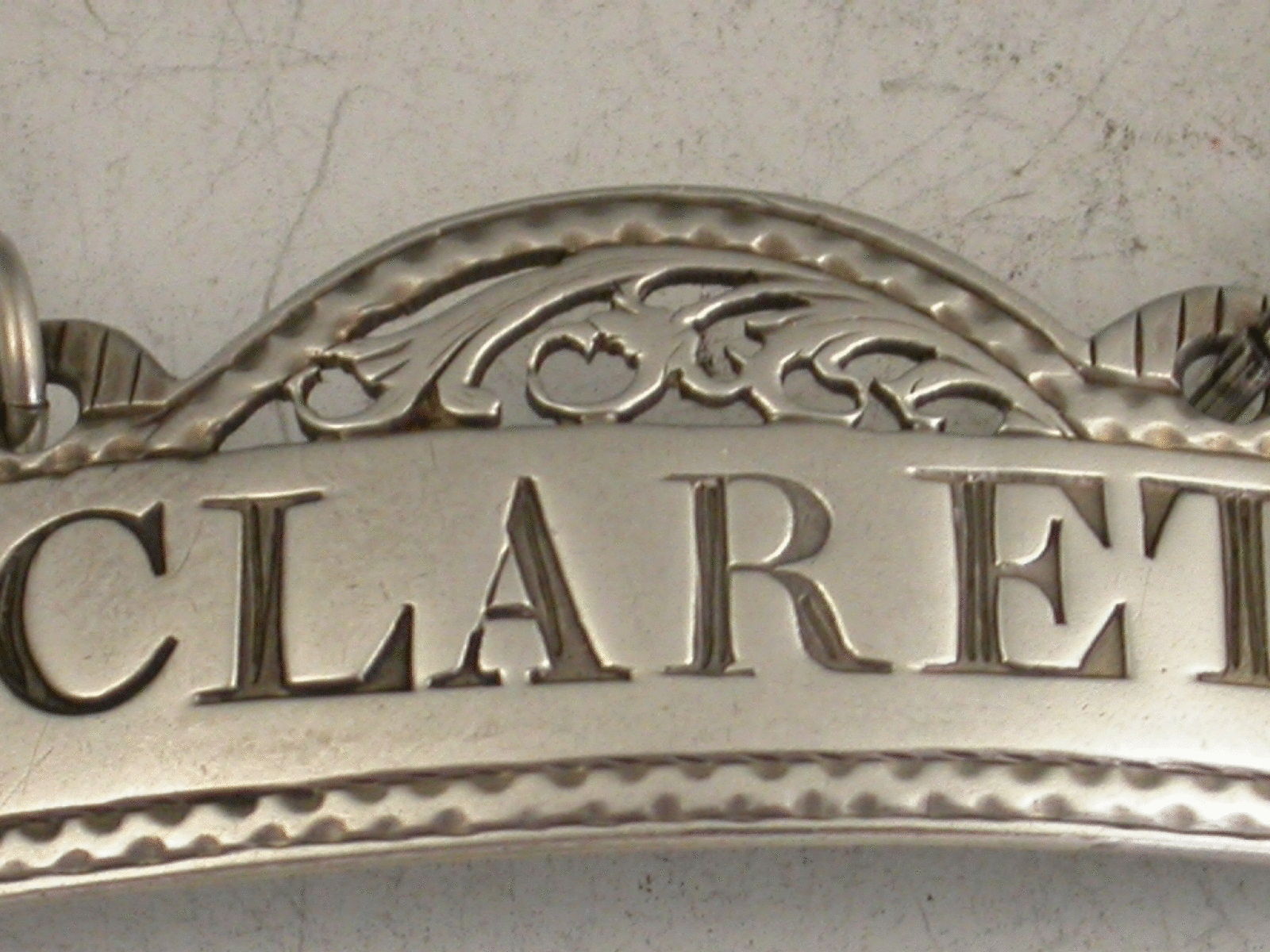 A good George III 18th century silver Wine Label of pierced fret-domed rectangular form with feather edged border, incised for Claret.