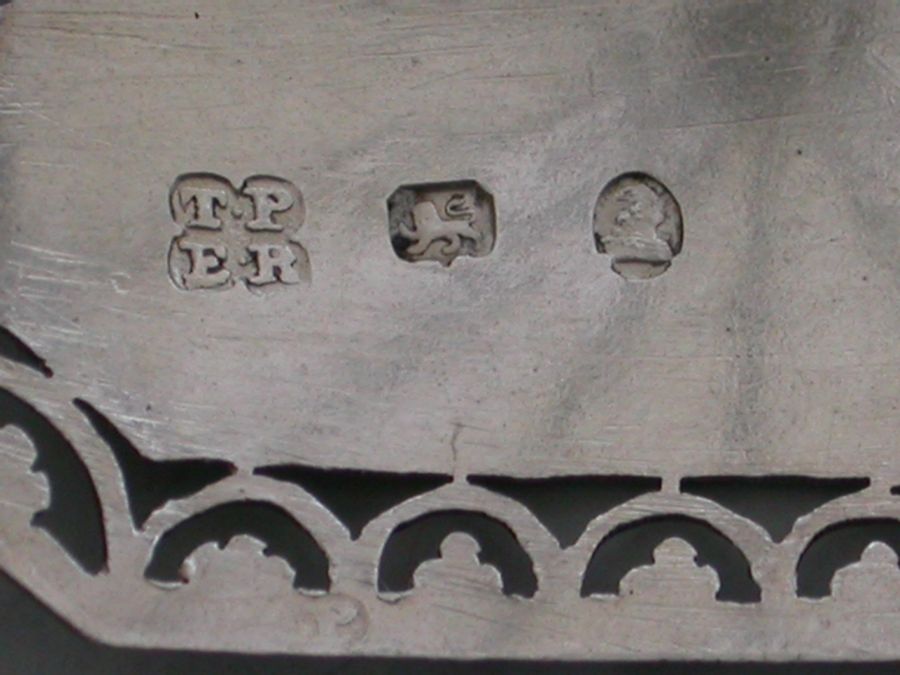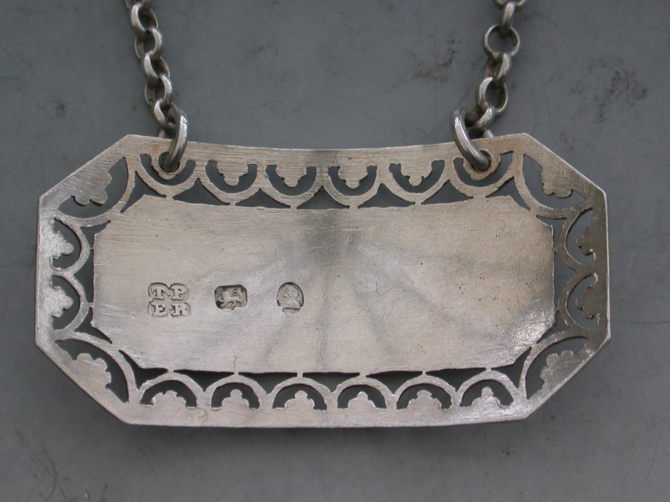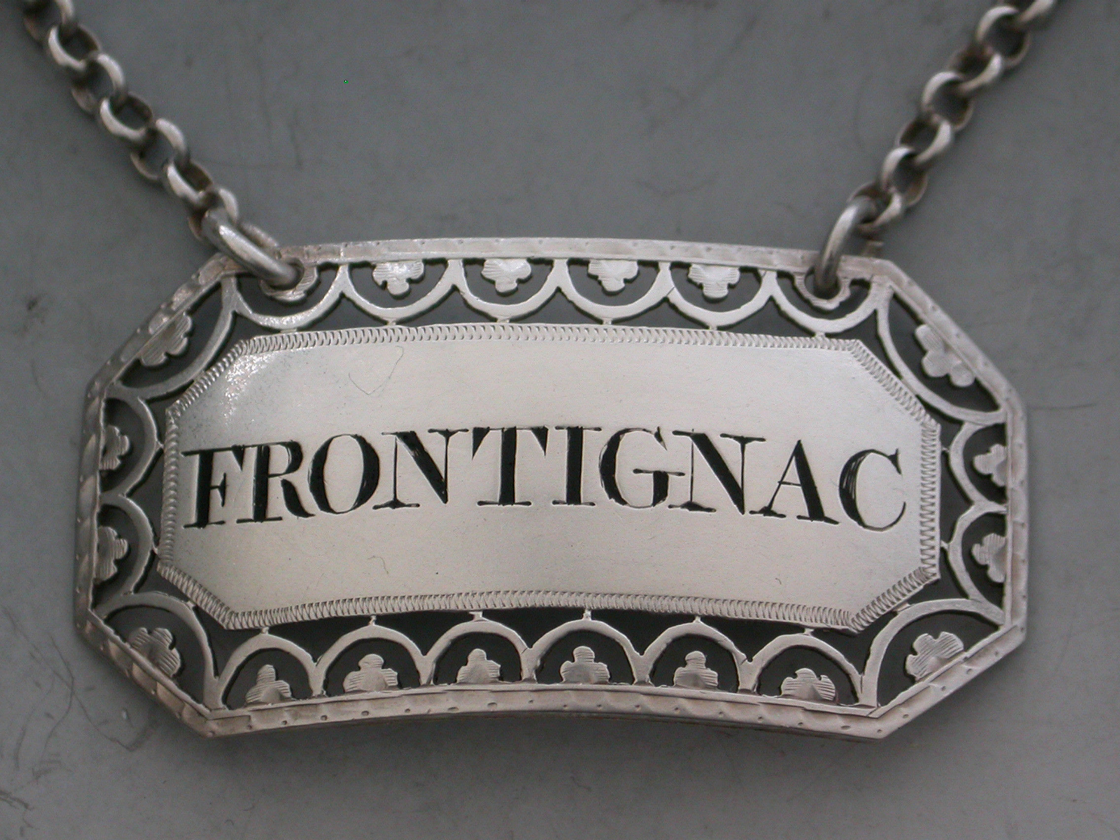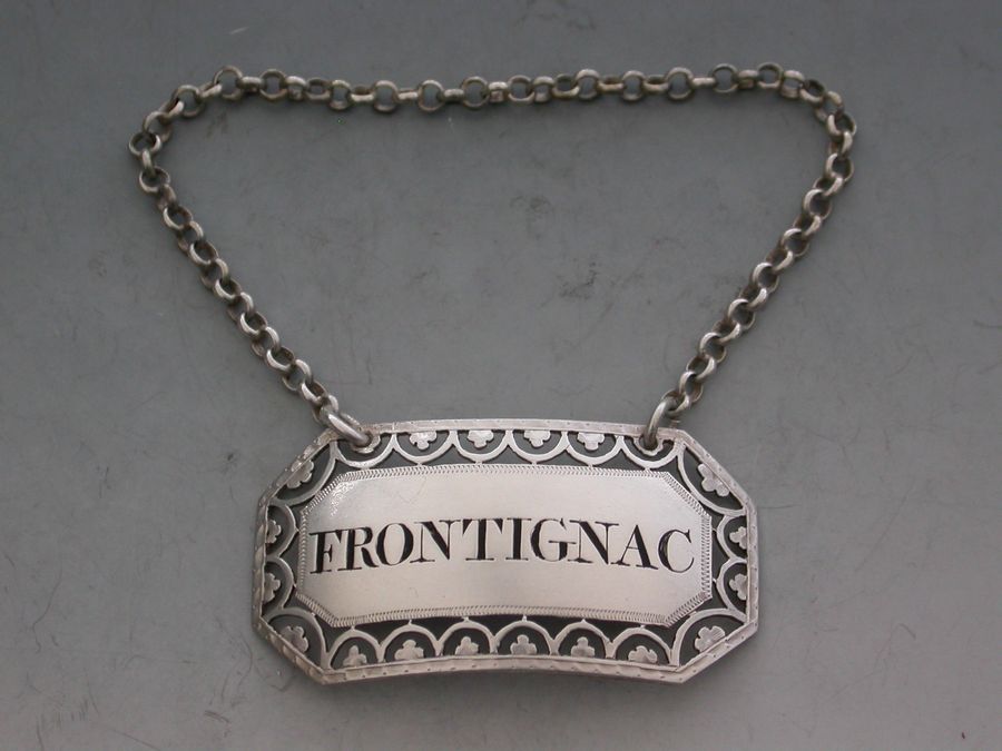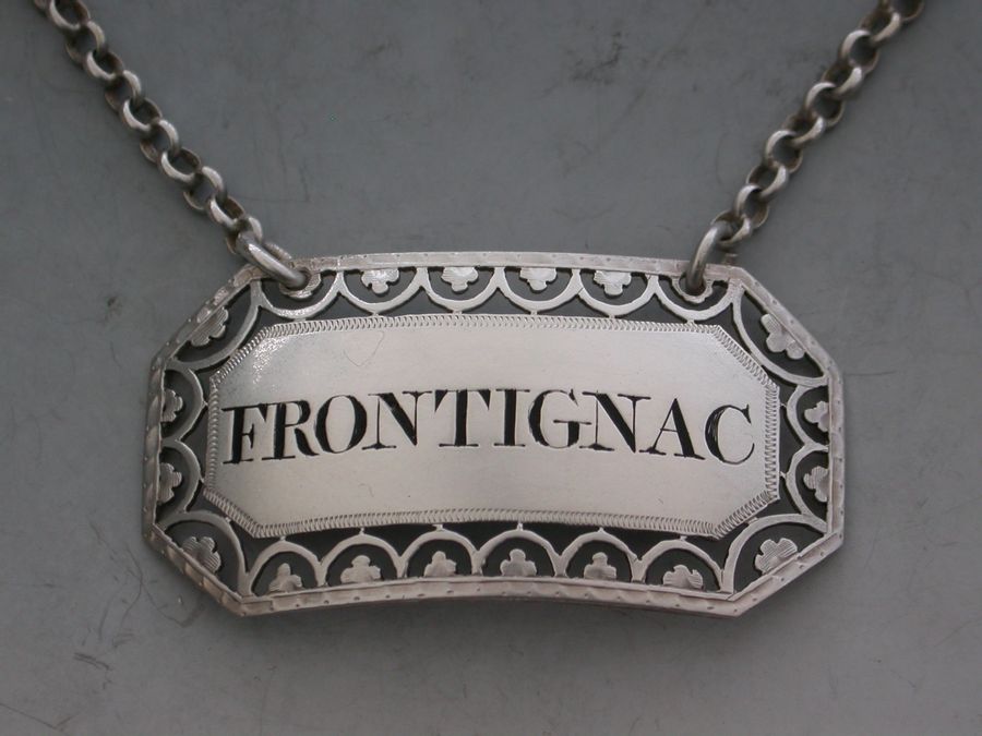 A fine George III silver Wine Label of rectangular form with cut-corners, intricately pierced and bright-cut engraved border of hoops and trefoils, incised and niello filled for Frontignac.