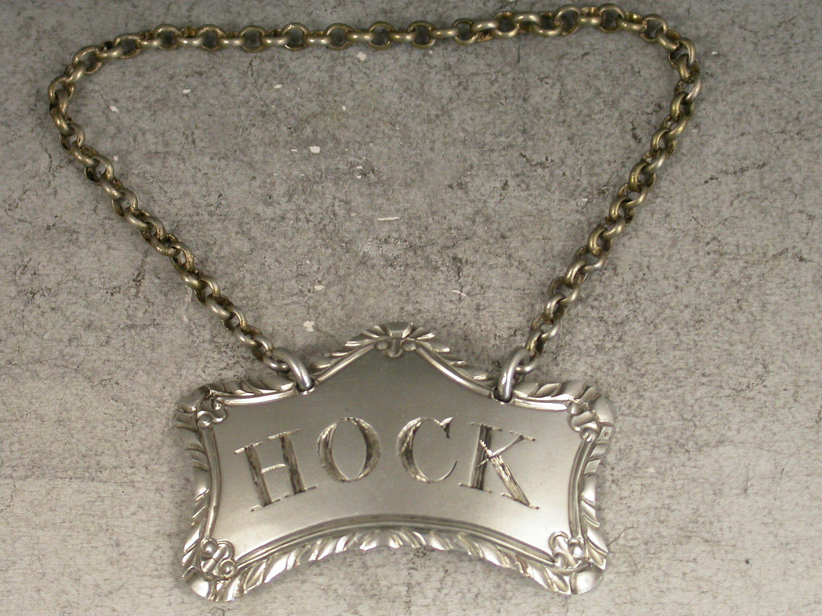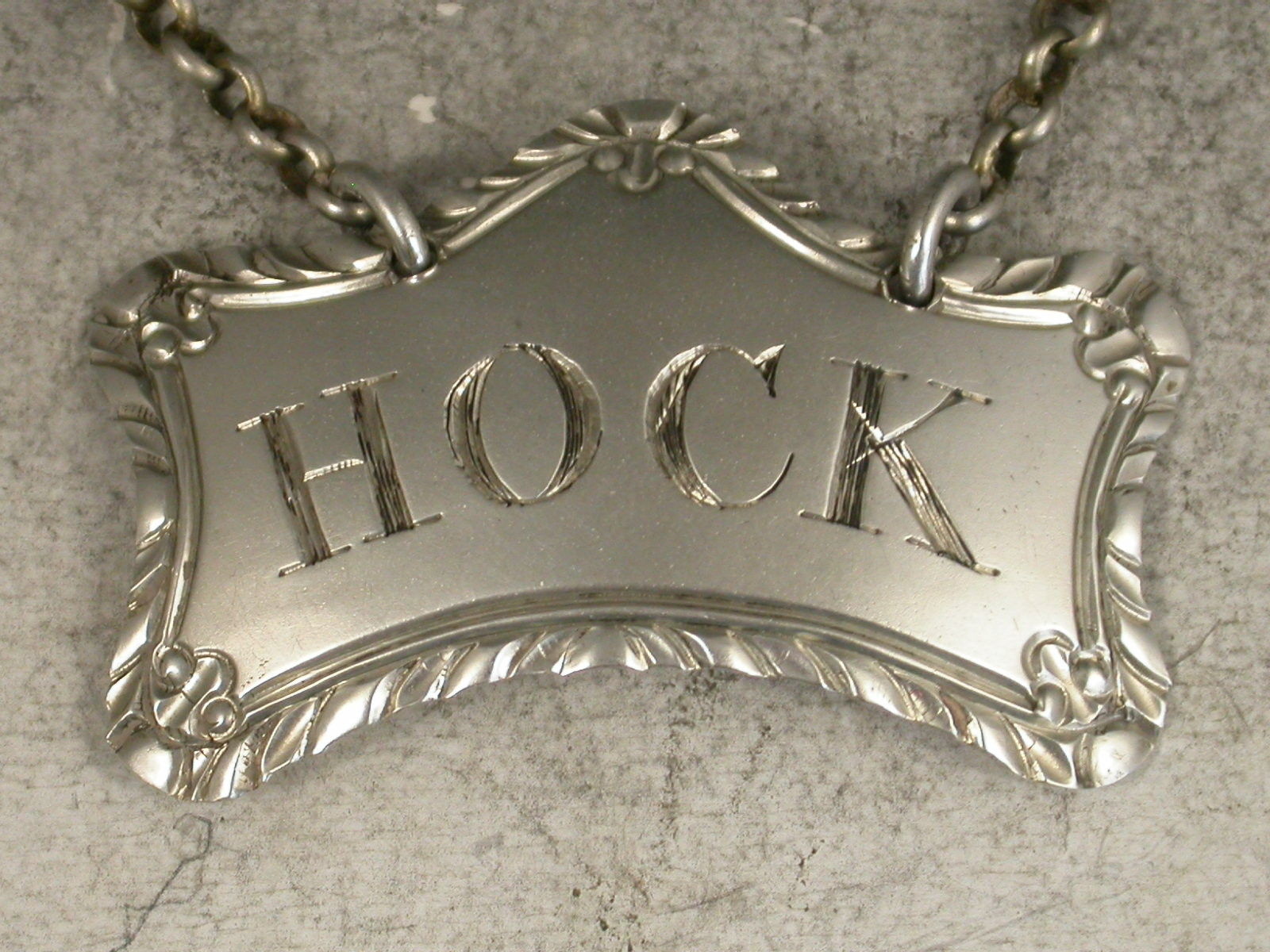 A fine early George III silver Wine Label of domed cushion shape with feather edge border and floral device at each corner, incised for Hock.