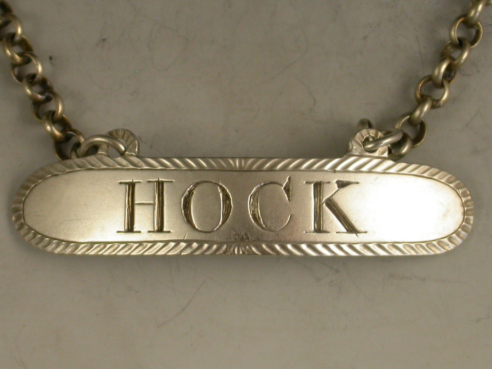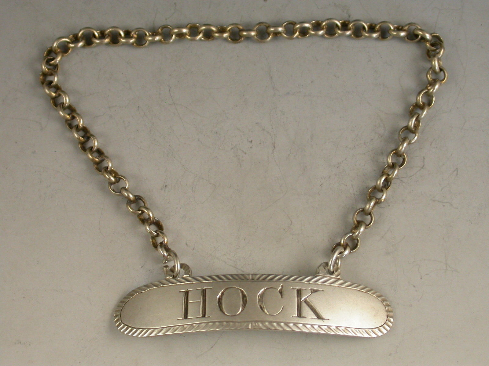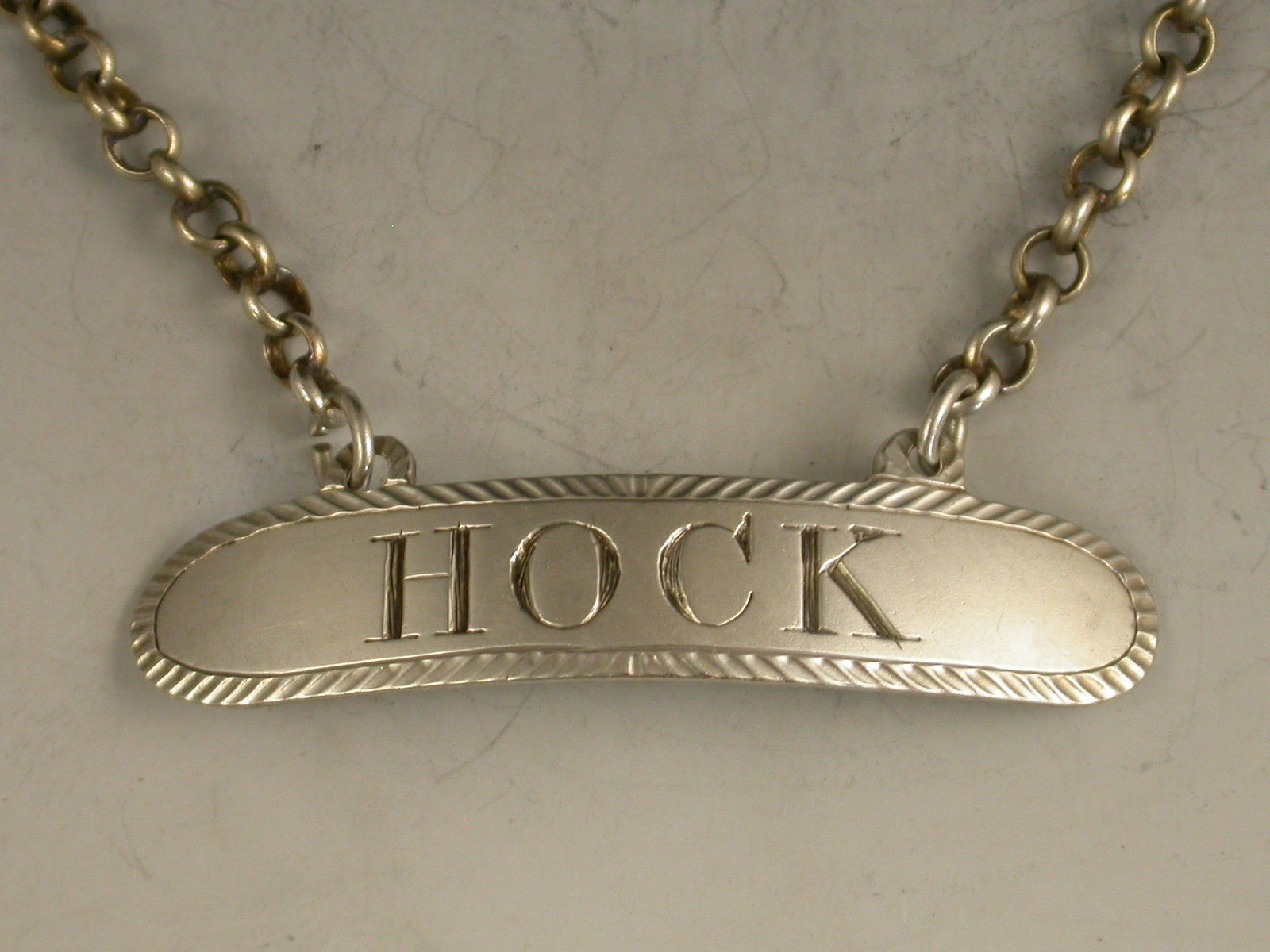 An unusual George III silver Wine Label of narrow rectangular form with feather edge border, rounded ends and raised eyelets, incised for Hock.