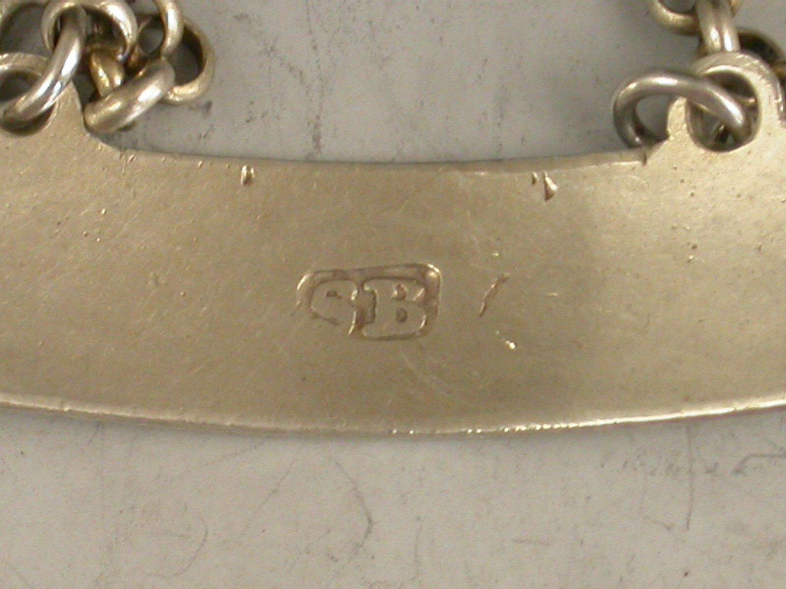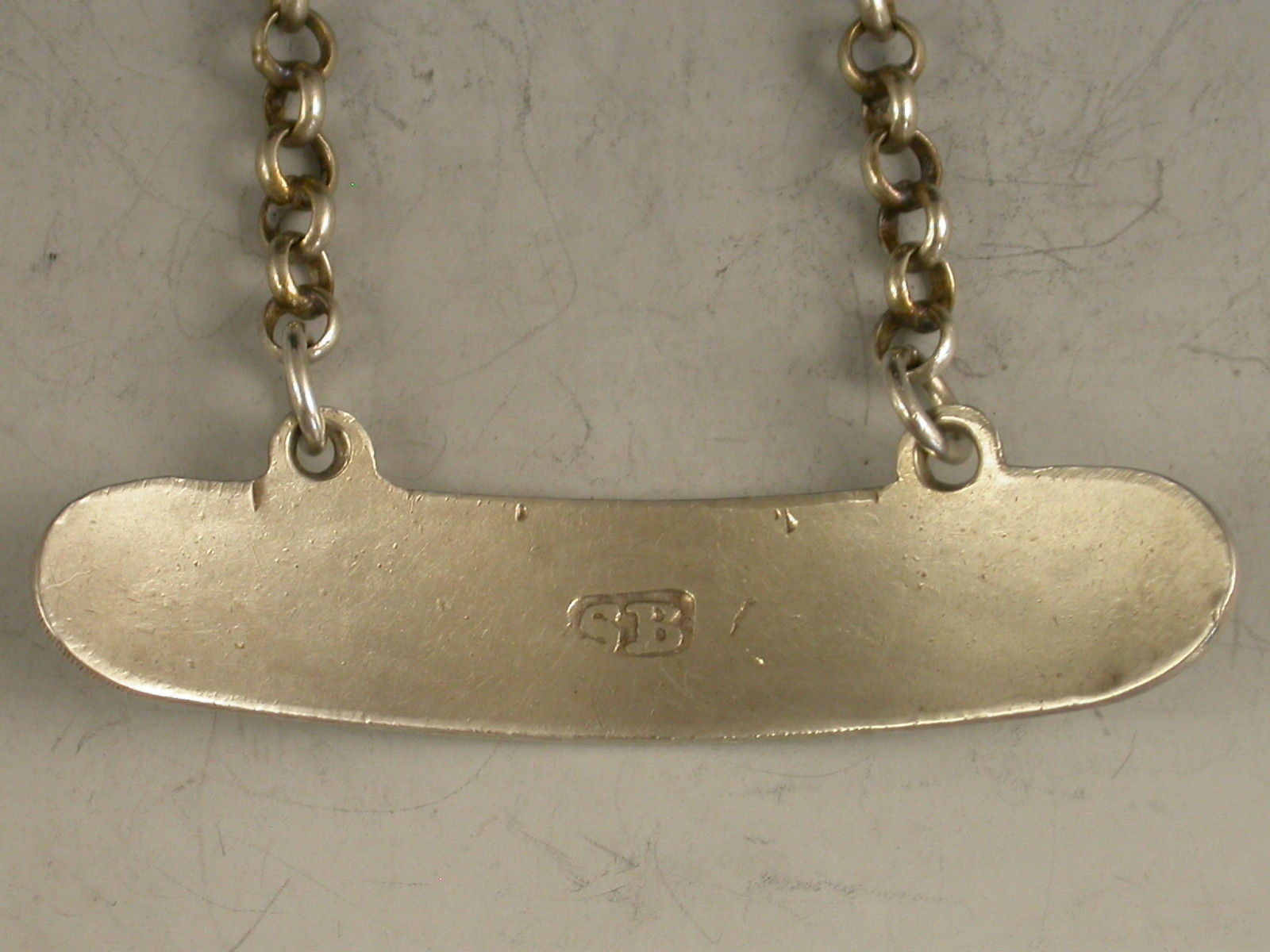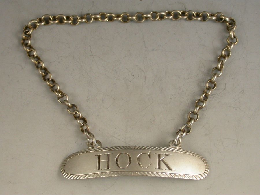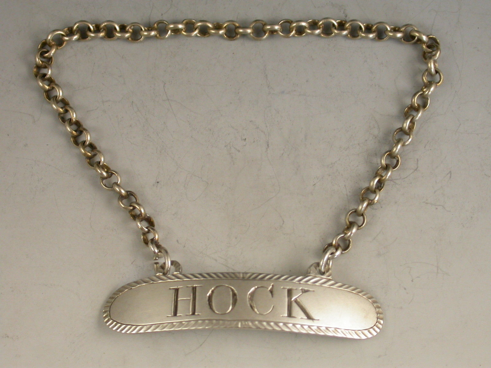 An unusual George III silver Wine Label of narrow rectangular form with feather edge border, rounded ends and raised eyelets, incised for Hock.