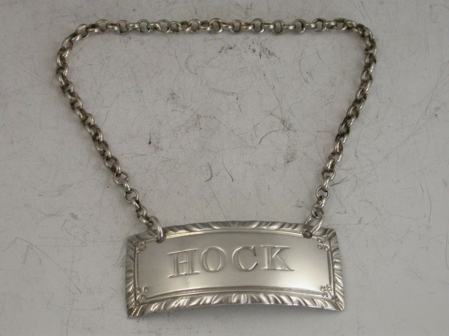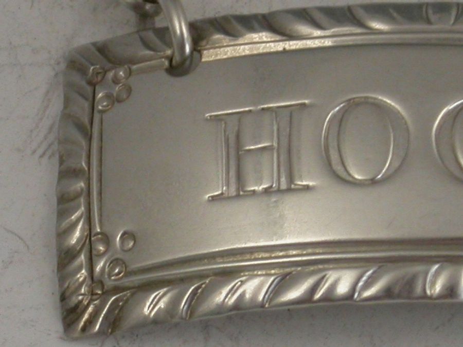 A good George III 18th century silver Wine Label of rectangular form with gadrooned border, a floral device to each corner.