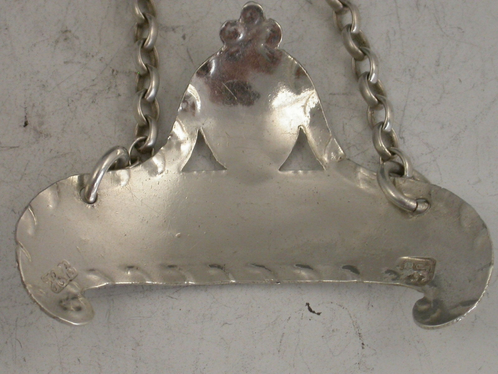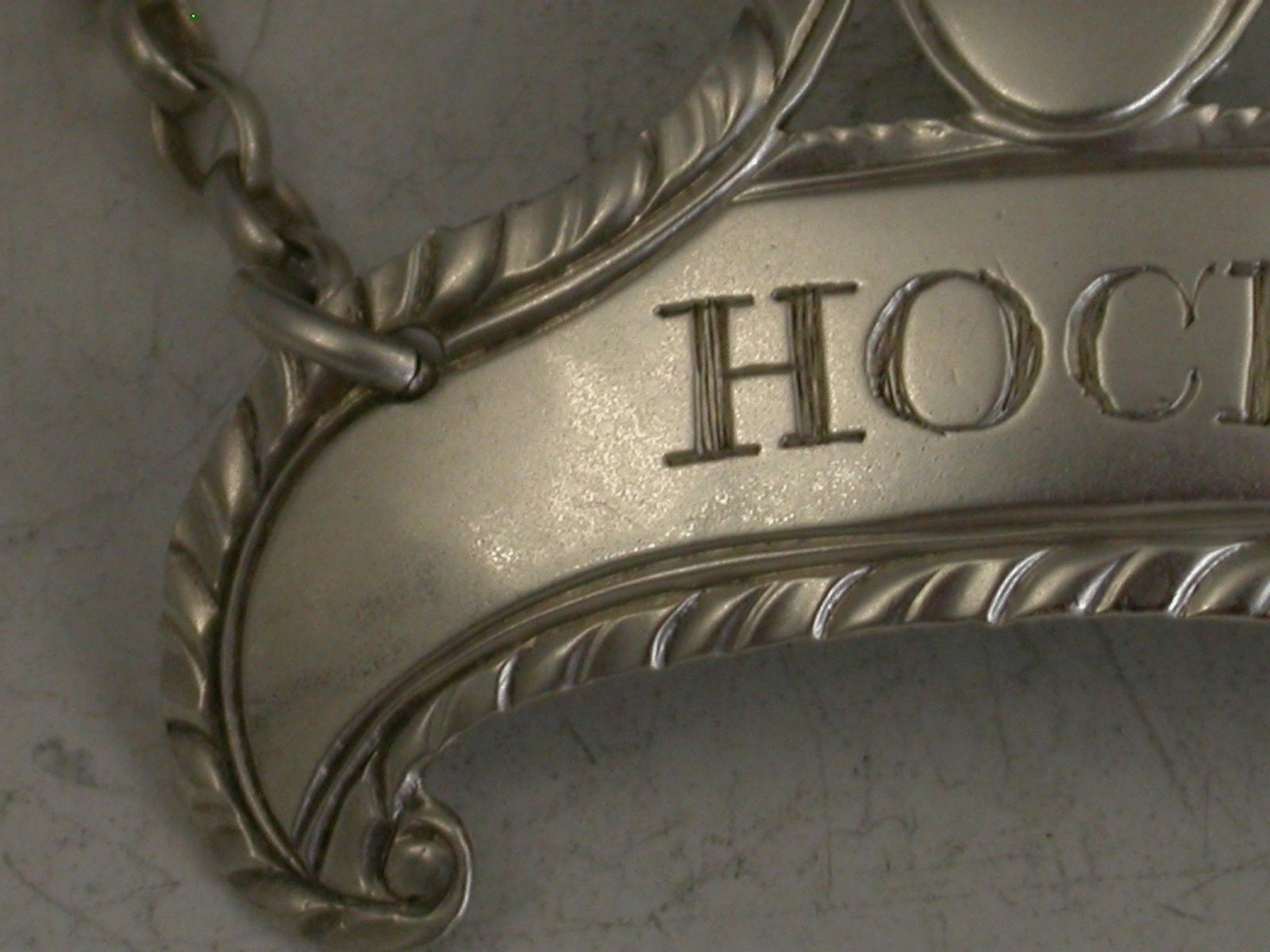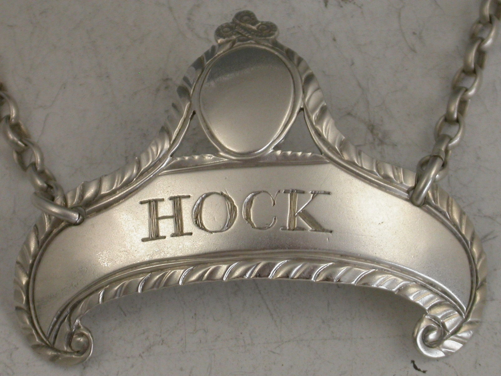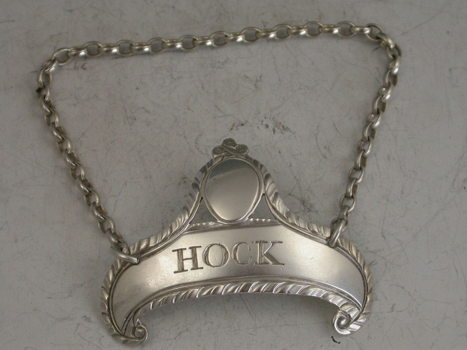 A good George III silver Wine Label of down turned crescent form with vacant shield surmount supported by swags, gadrooned border, incised for Hock.