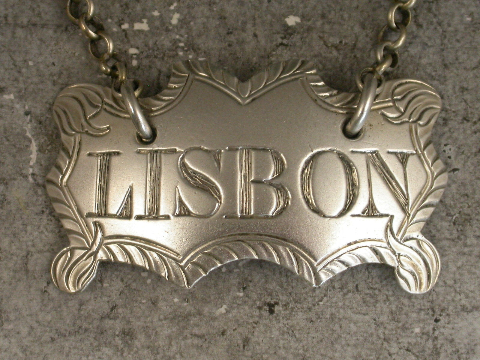 A rare George III silver Wine Label of shaped rectangular form with gadrooned border and chased leaf decoration to the corners, incised for Lisbon.