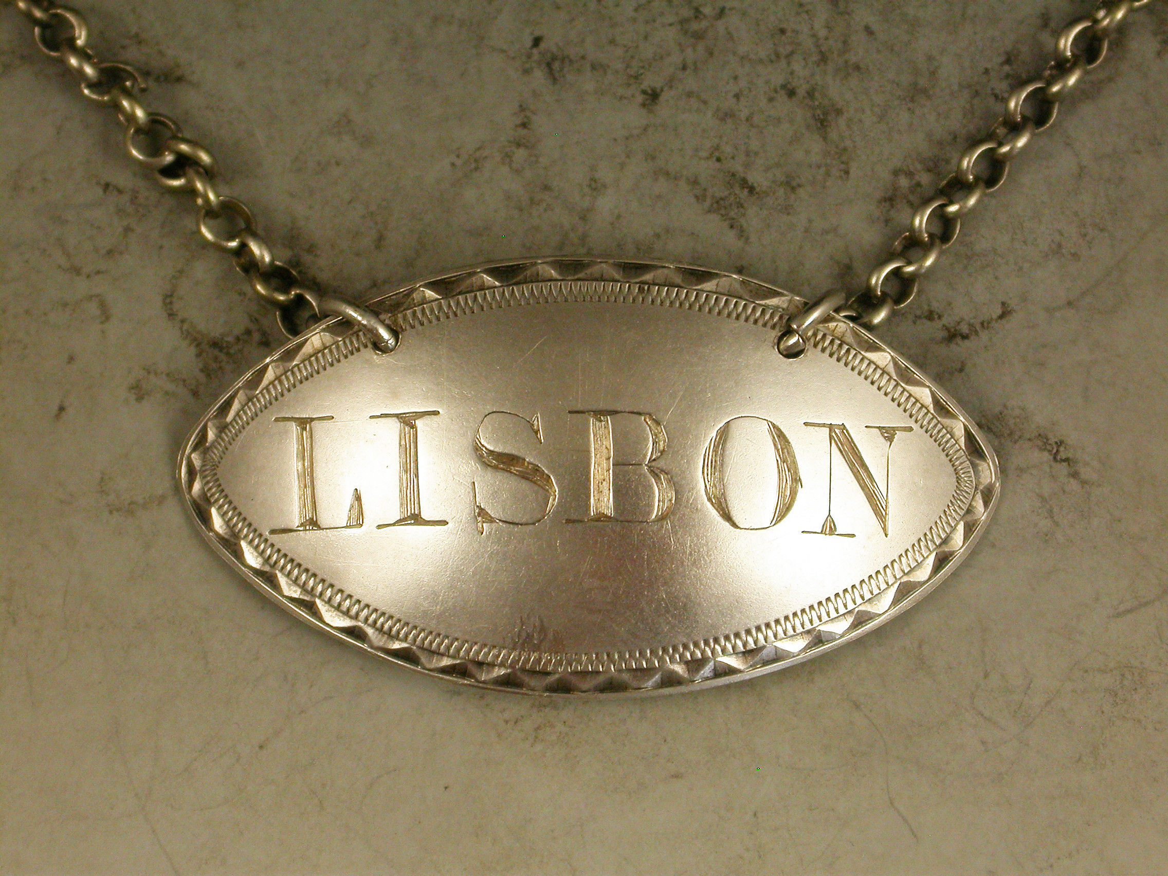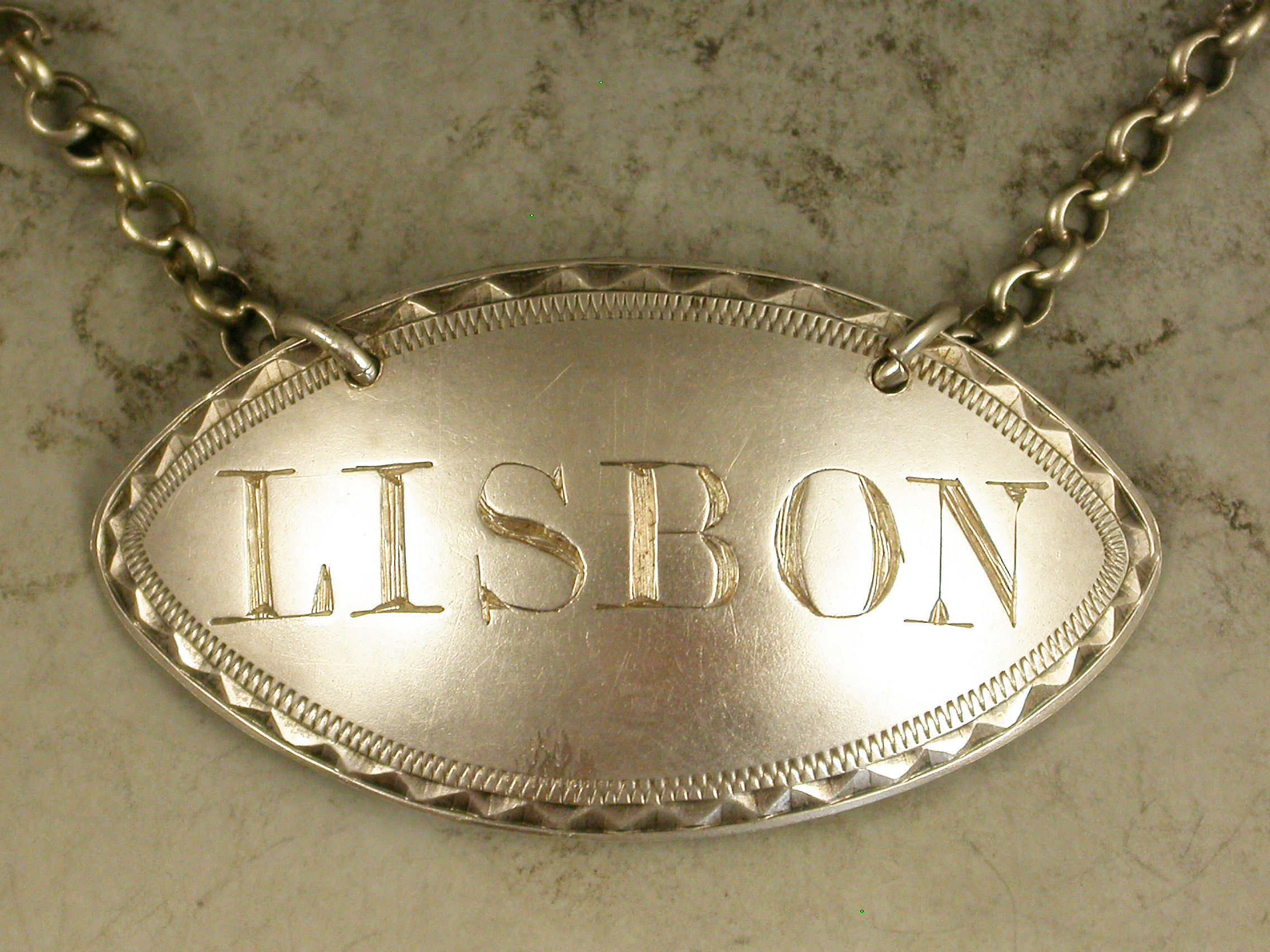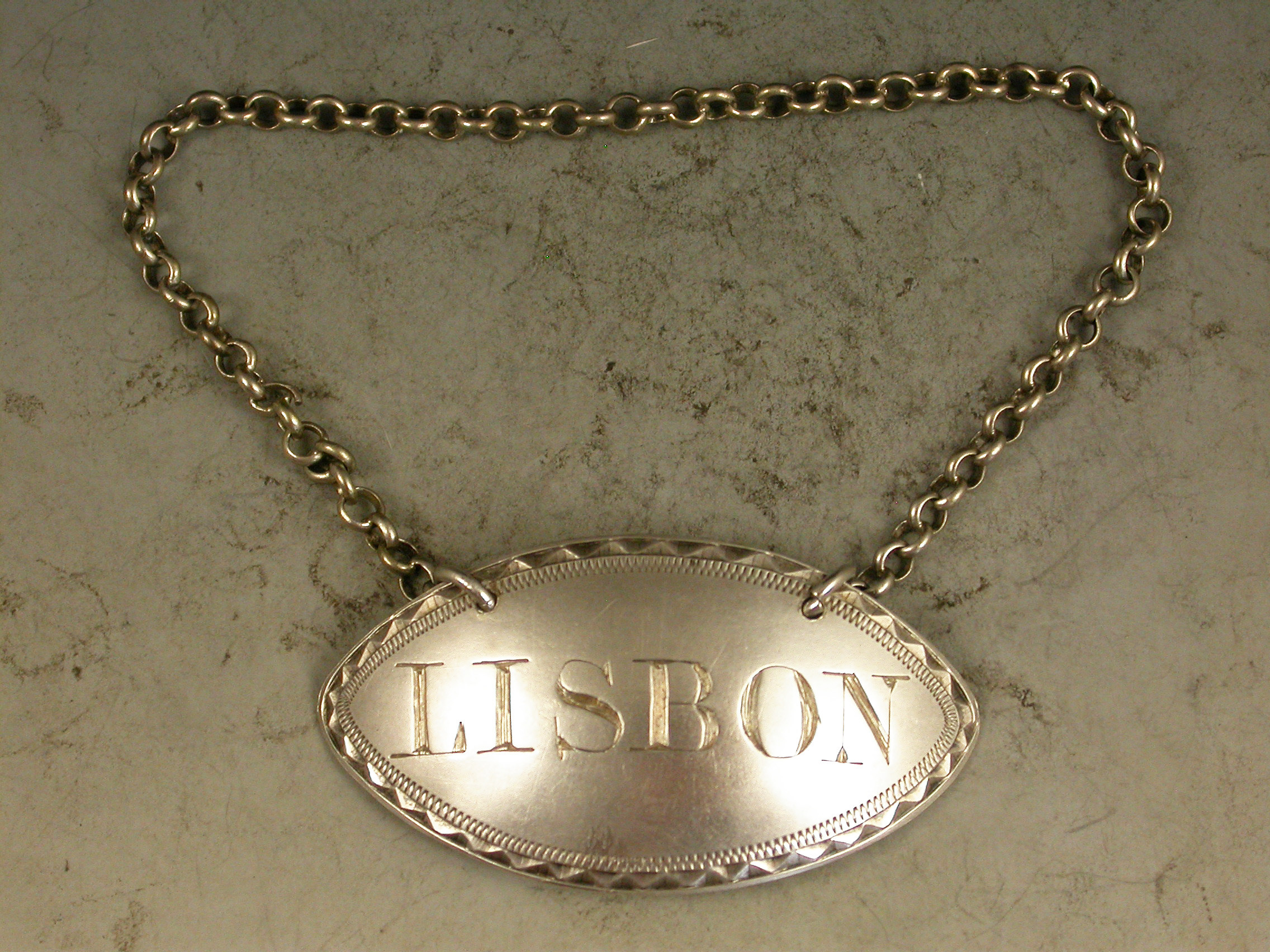 A good quality George III 18th century silver Wine Label of eye shape with bright-cut engraved border, incised for Lisbon.