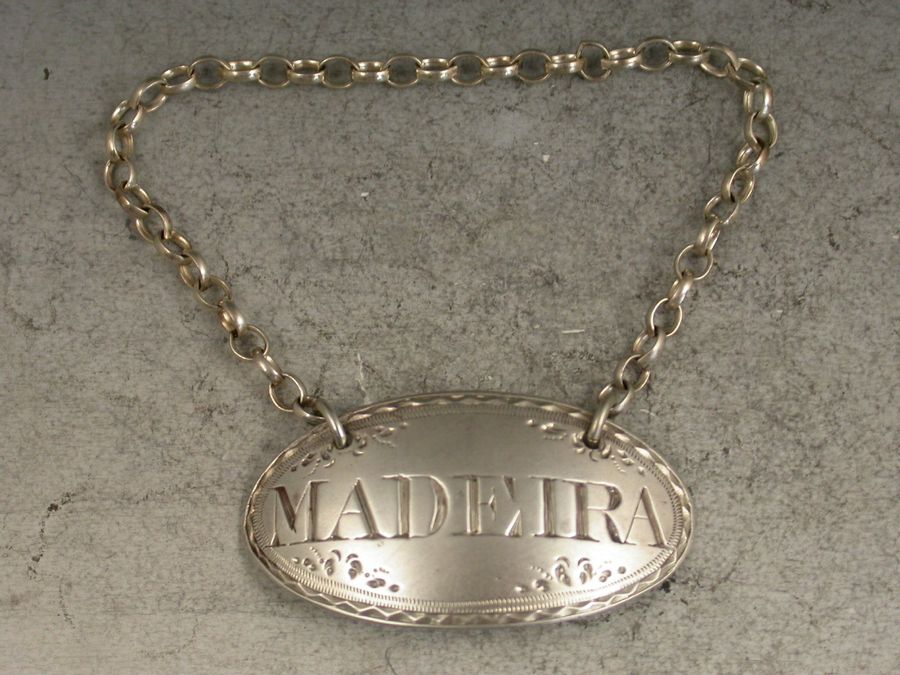 A good George III silver Wine Label of eye shape with bright-cut engraved decoration to the border and four floral devices to each corner, incised for Madeira.