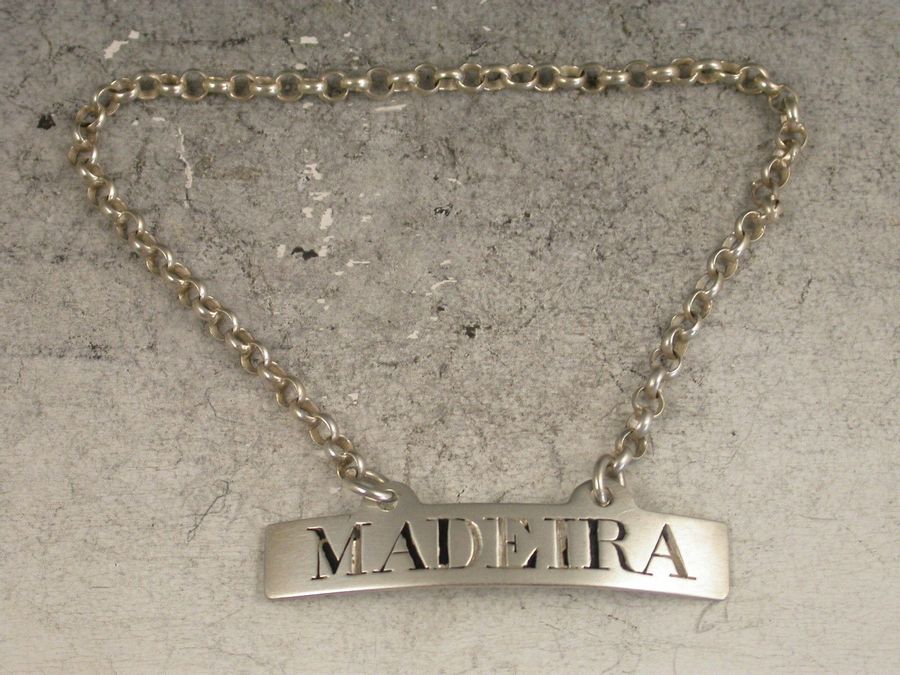 An early George III silver Wine Label of plain curved narrow rectangular form with raised eyelets, incised and niello filled for Madeira.
