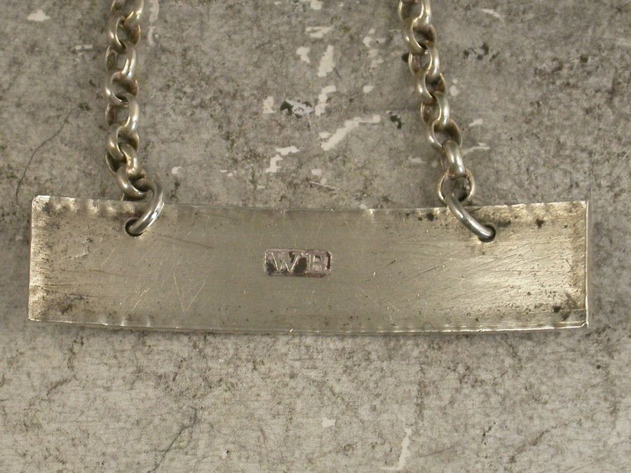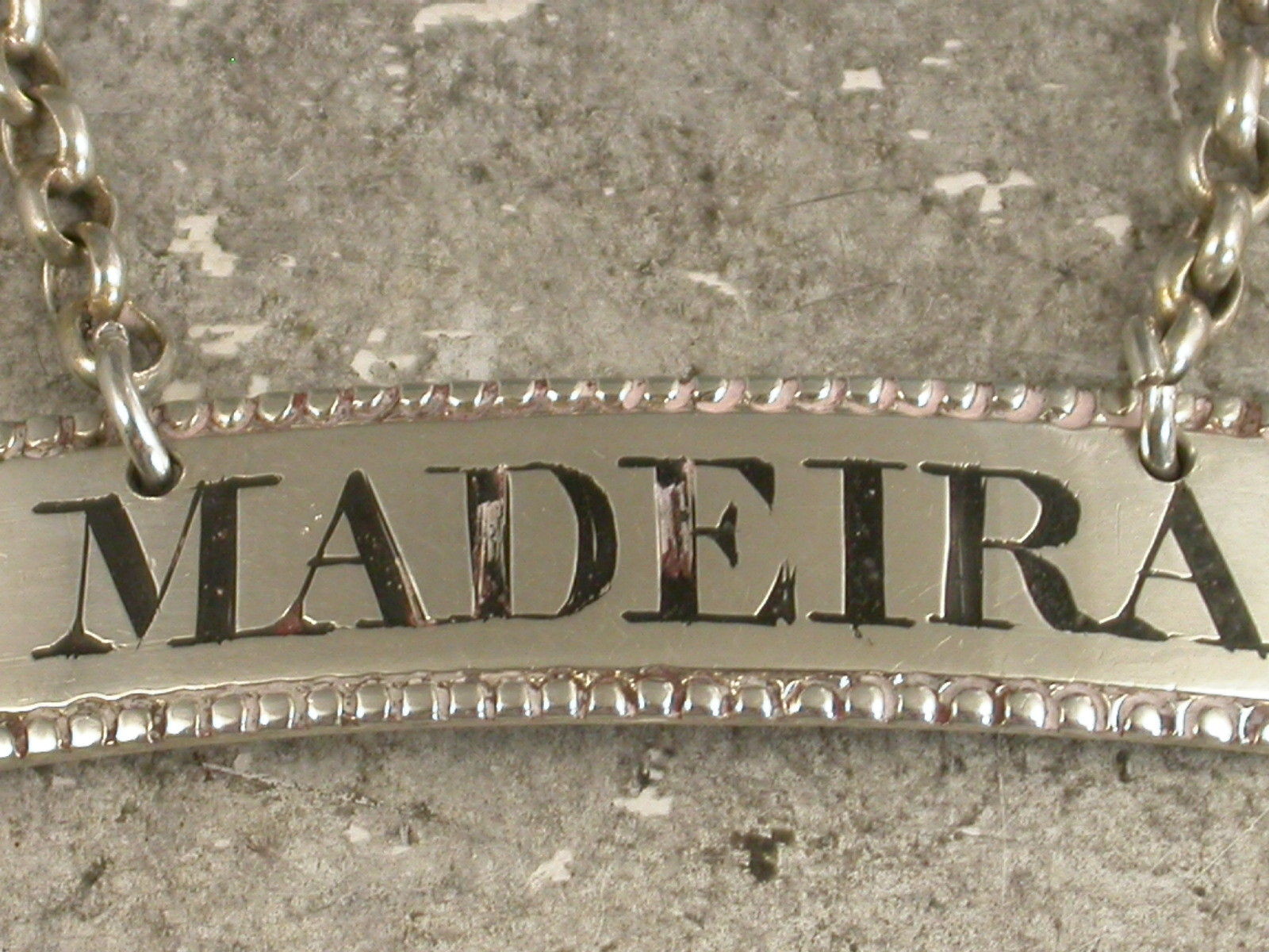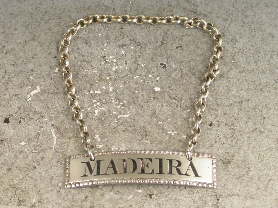 A good George III 18th century silver Wine Label of narrow rectangular form with bead edge border, incised and niello filled for Madeira.