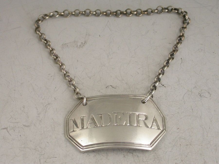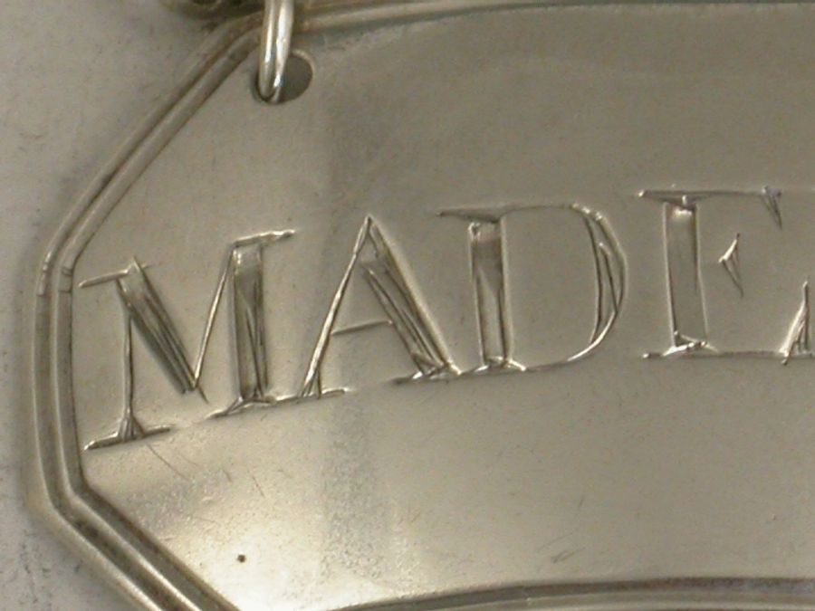 A George III silver Wine Label of cut-cornered rectangular form with double thread border, incised for Madeira.