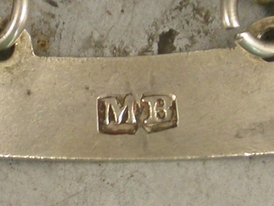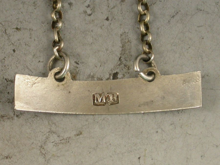 A good George III 18th century silver Wine Label of plain curved narrow rectangular form with raised eyelets, incised and niello filled for Mountain.