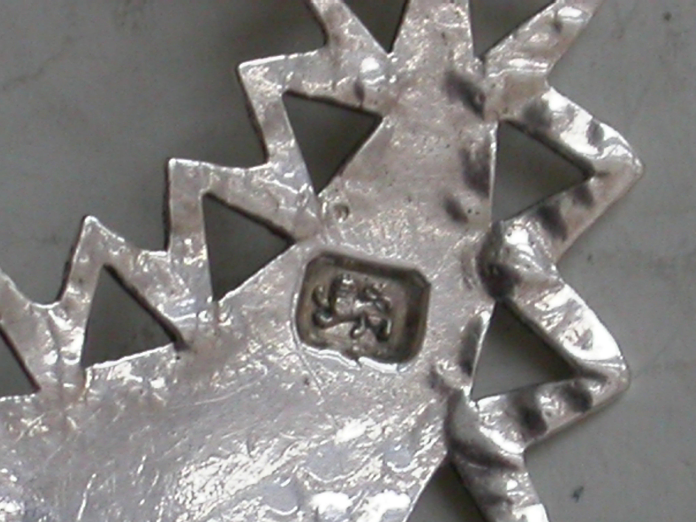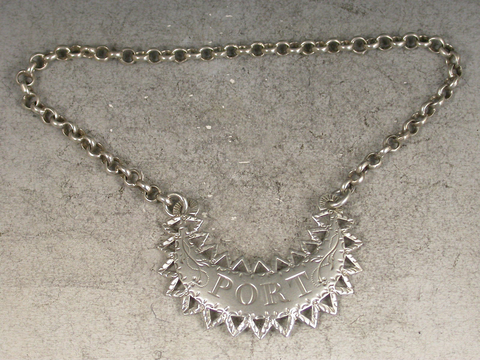 A fine and rare George III 18th century silver Wine Label of crescent form with pierced and engraved zig-zag border, incised for Port.