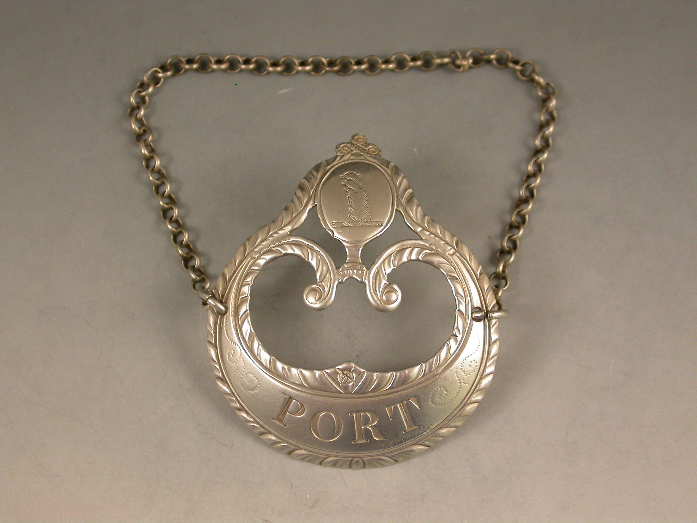A good George III 18th century silver Wine Label of enclosed crescent form with oval cartouche above engraved with a crest and supported by swags, with tied ribbon surmount and feather edge borders, incised for Port.