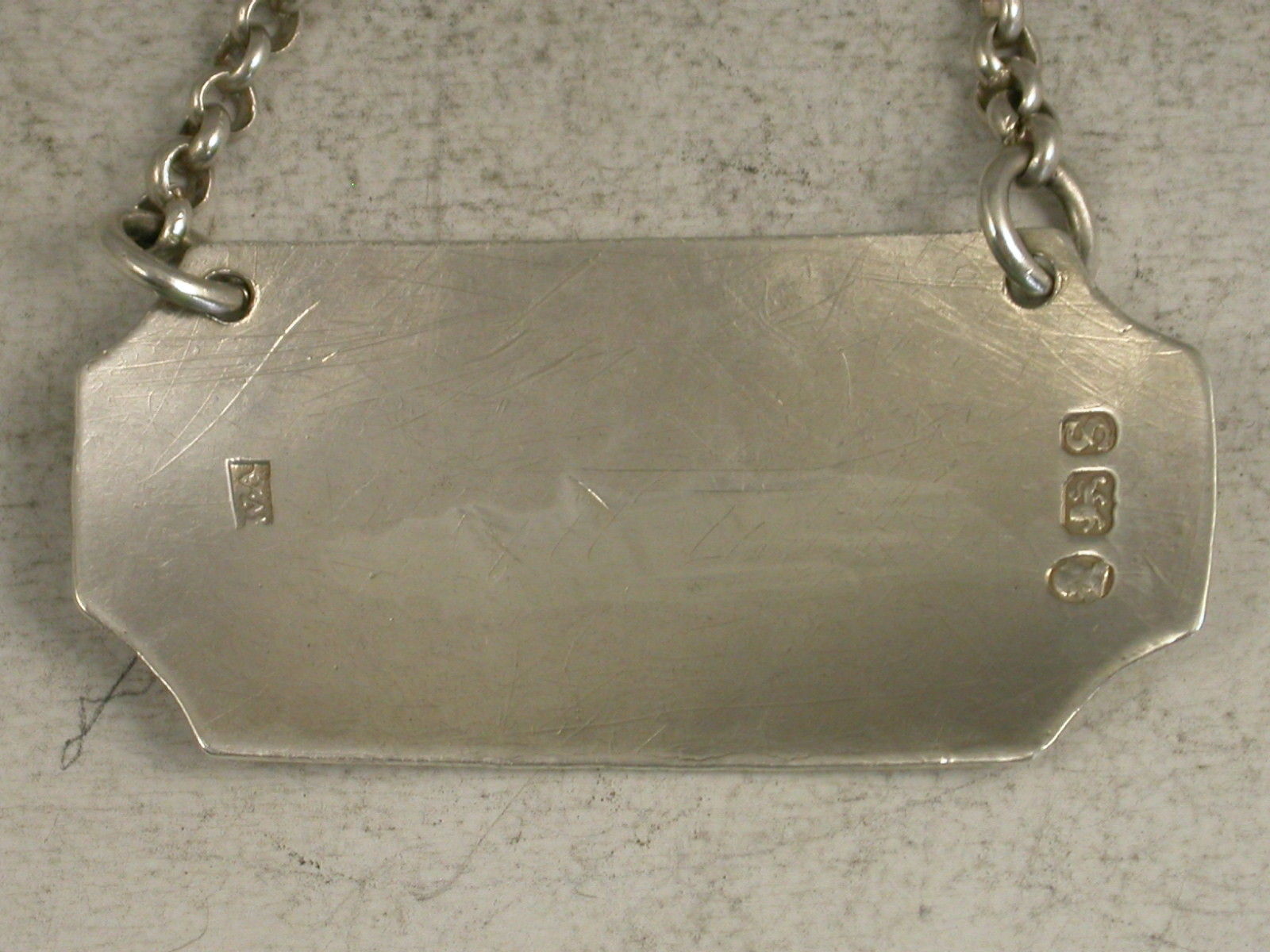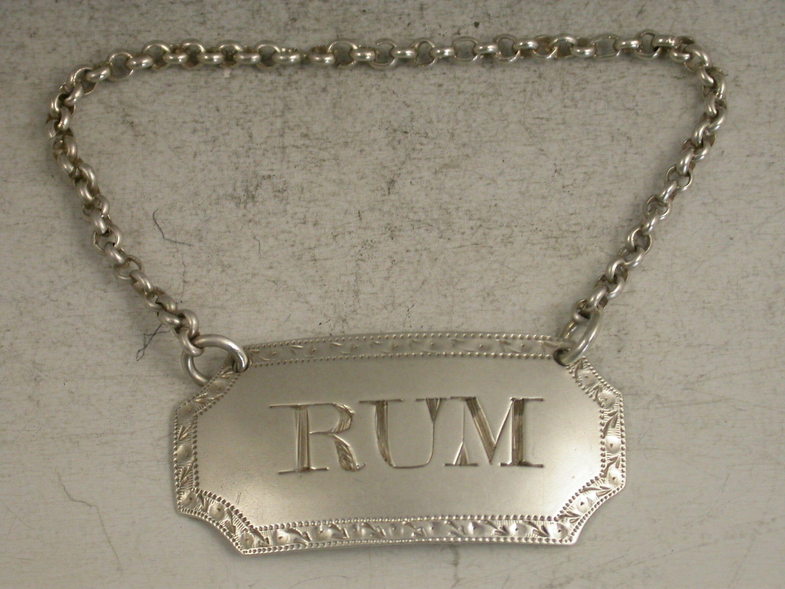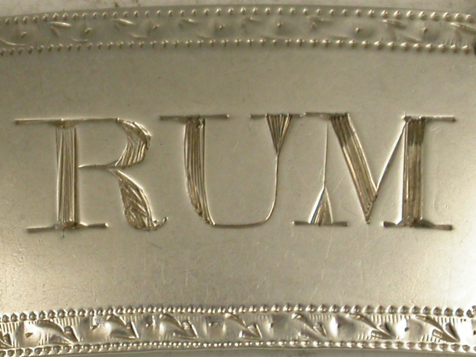 A George III silver Wine Label of rectangular form with concave corners and bright-cut engraved border incised for Rum.