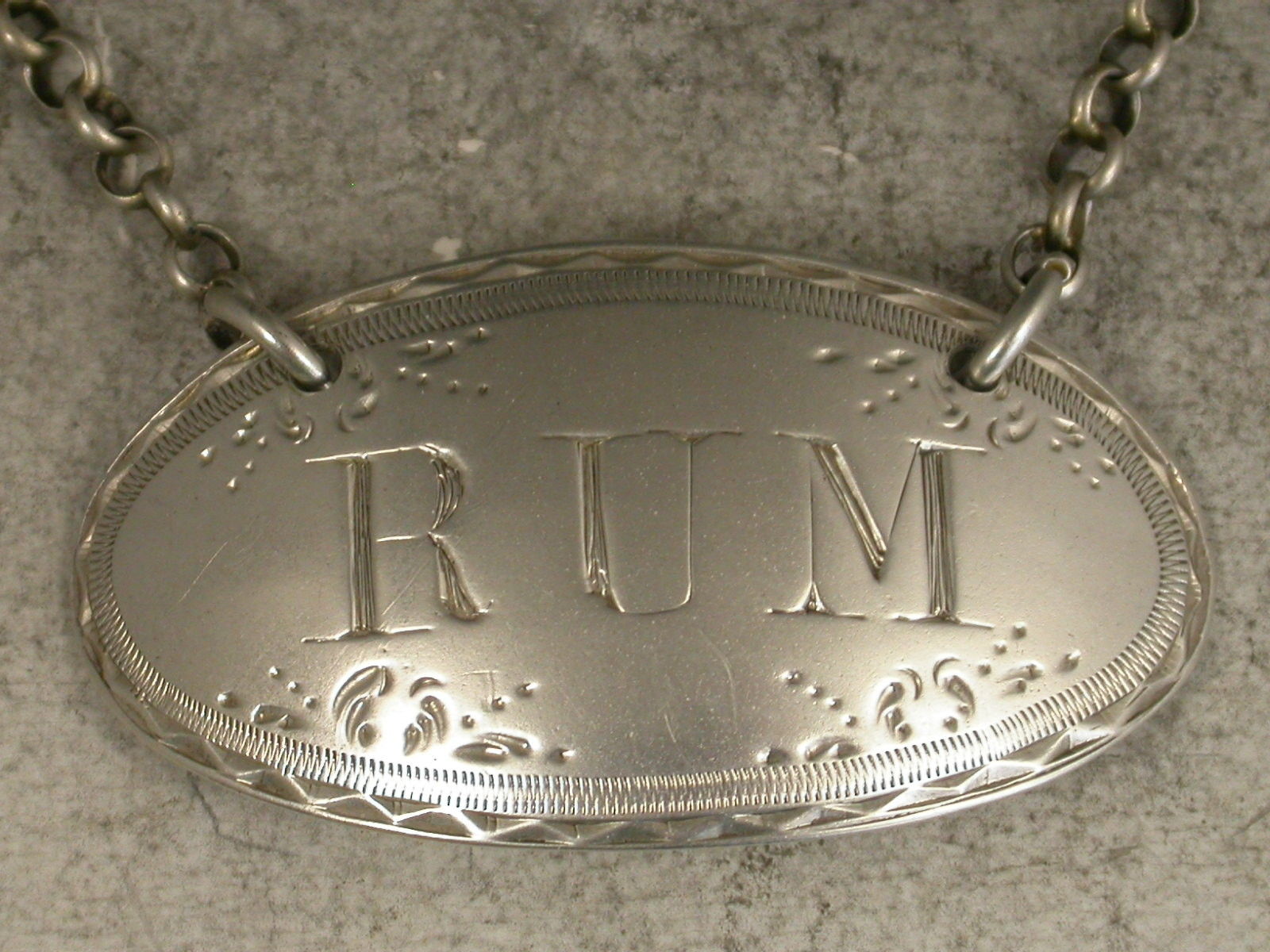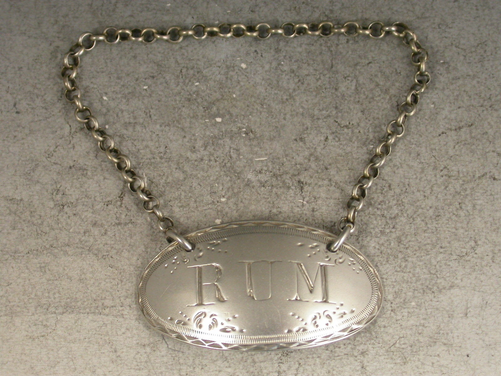 A good George III silver Wine Label of oval form with bright-cut engraved border and four sprigs of leafage, incised for Rum.