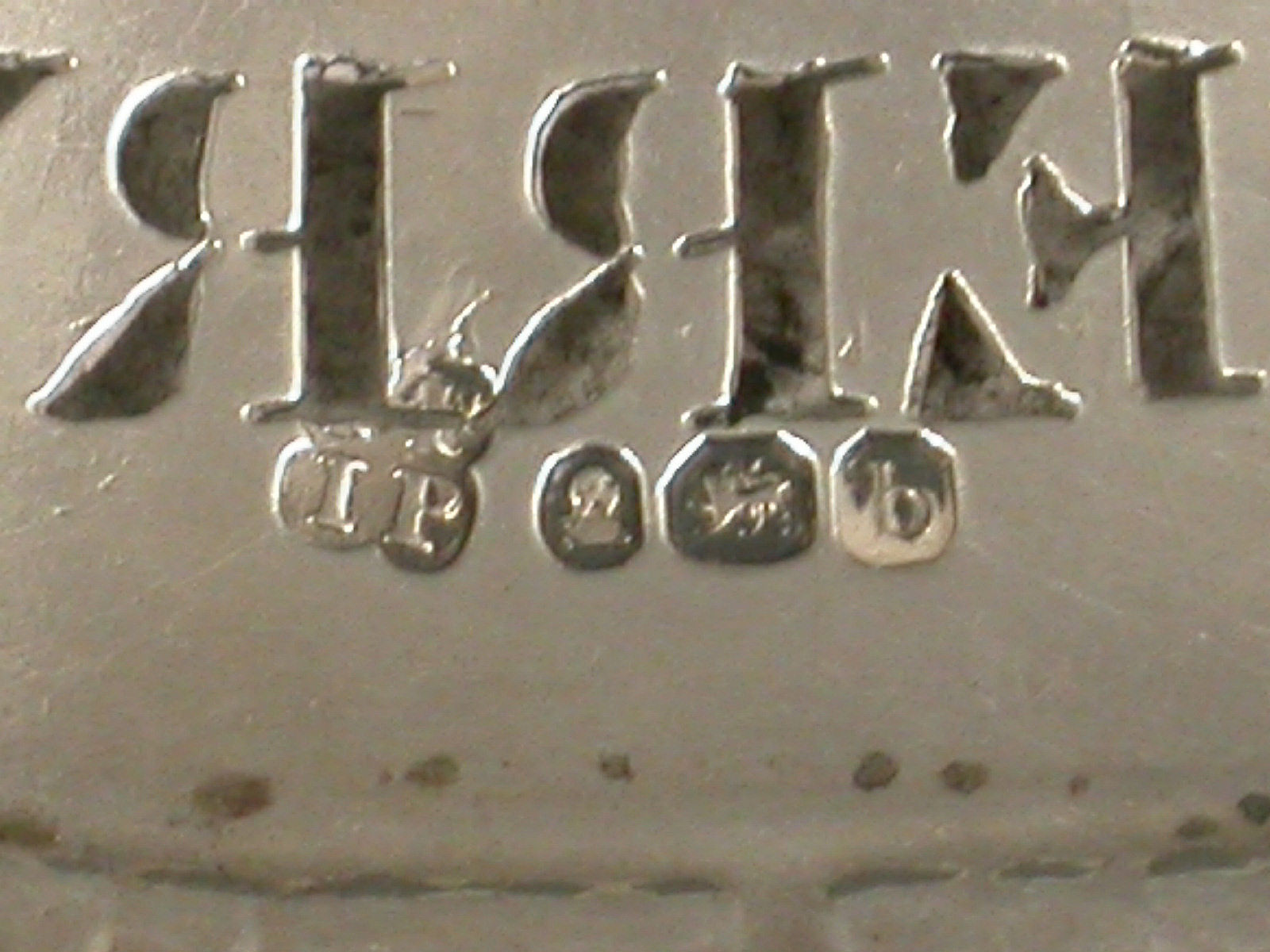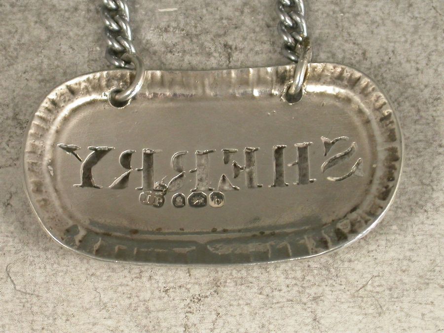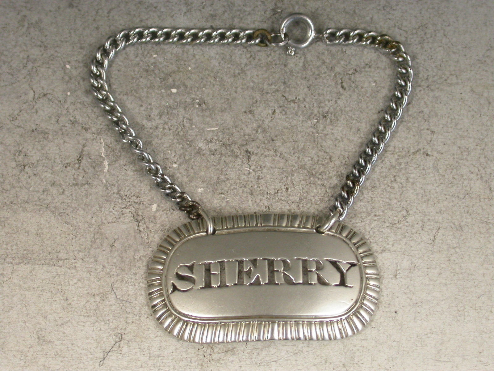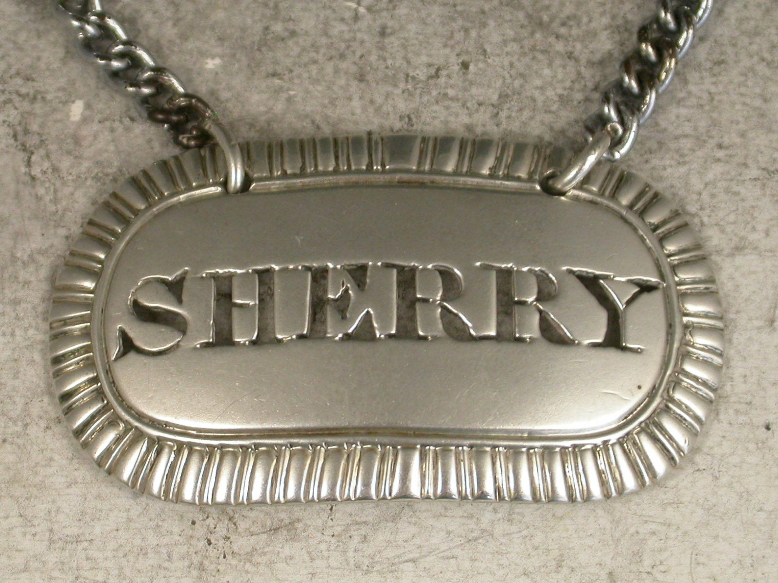 A George III silver Wine Label of oval form with gadrooned border, pierced for Sherry.