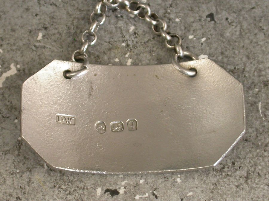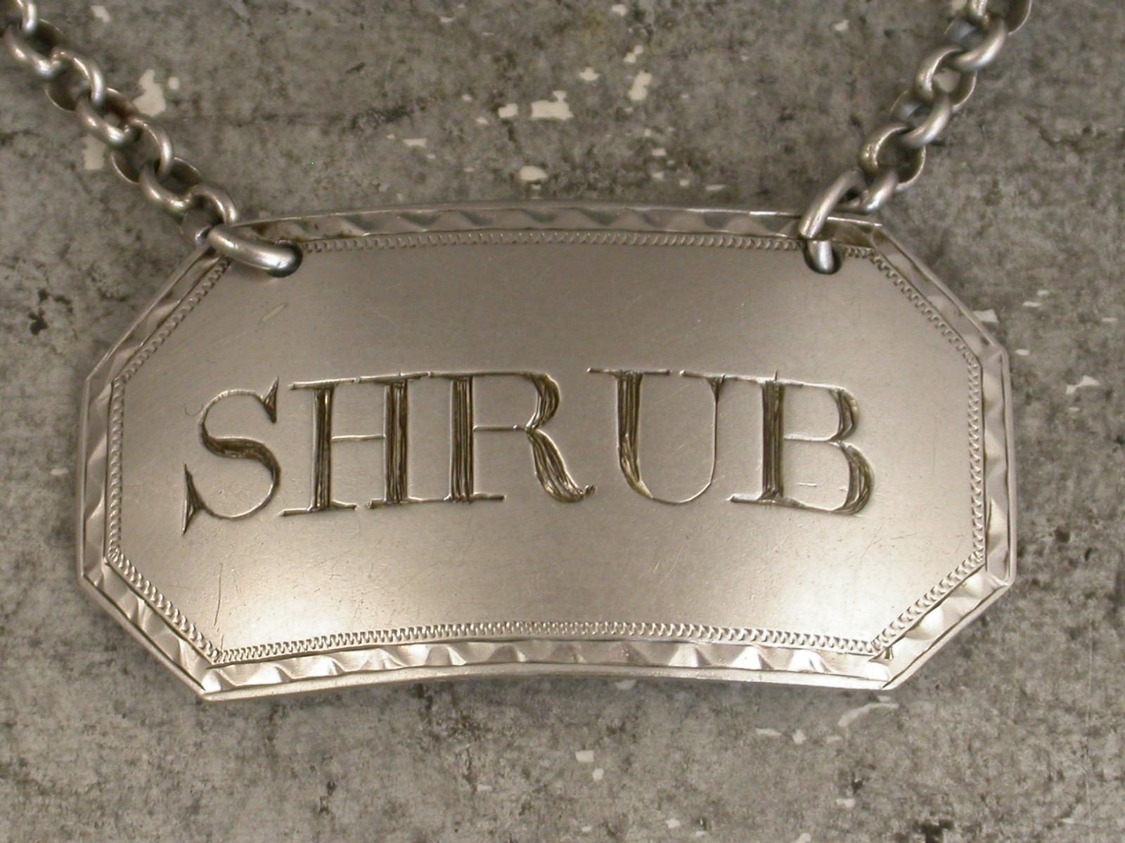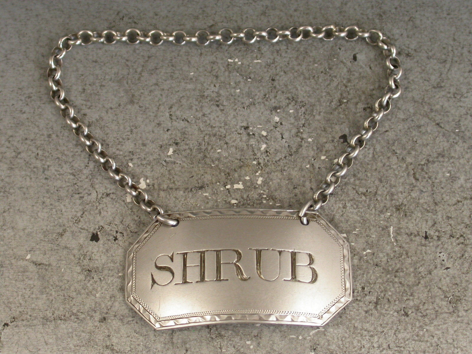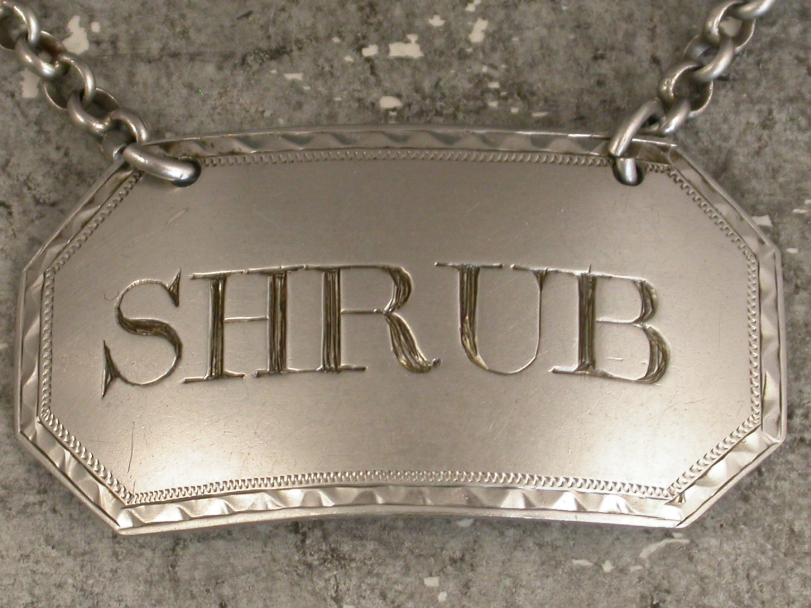 A fine George III silver Wine Label of cut-cornered rectangular form with bright cut engraved decoration to the border, incised for Shrub.