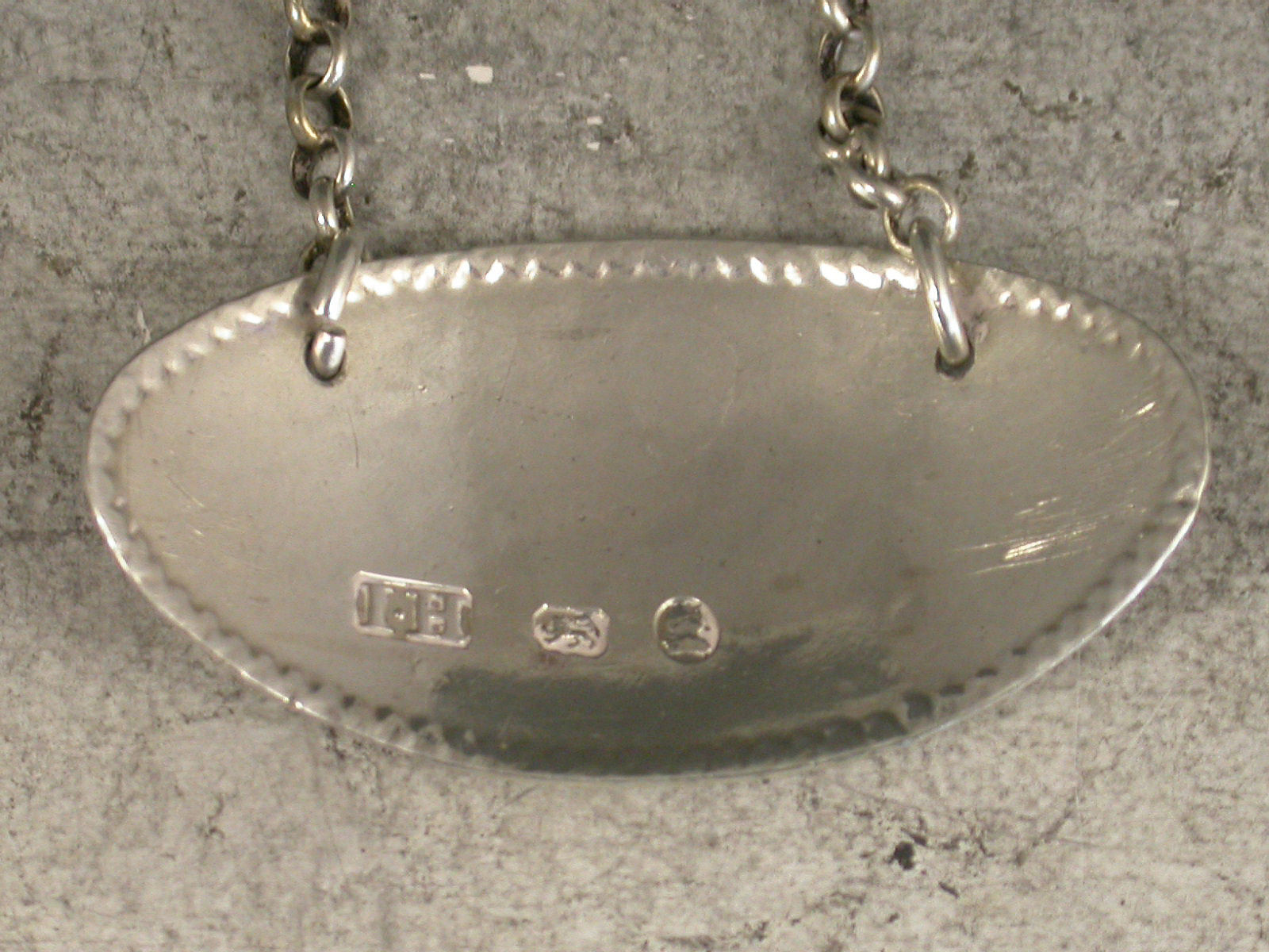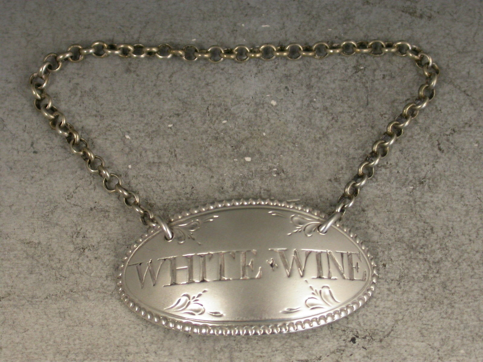 A good George III silver Wine Label of oval form with beaded border and four sprigs of leafage, incised for White Wine.