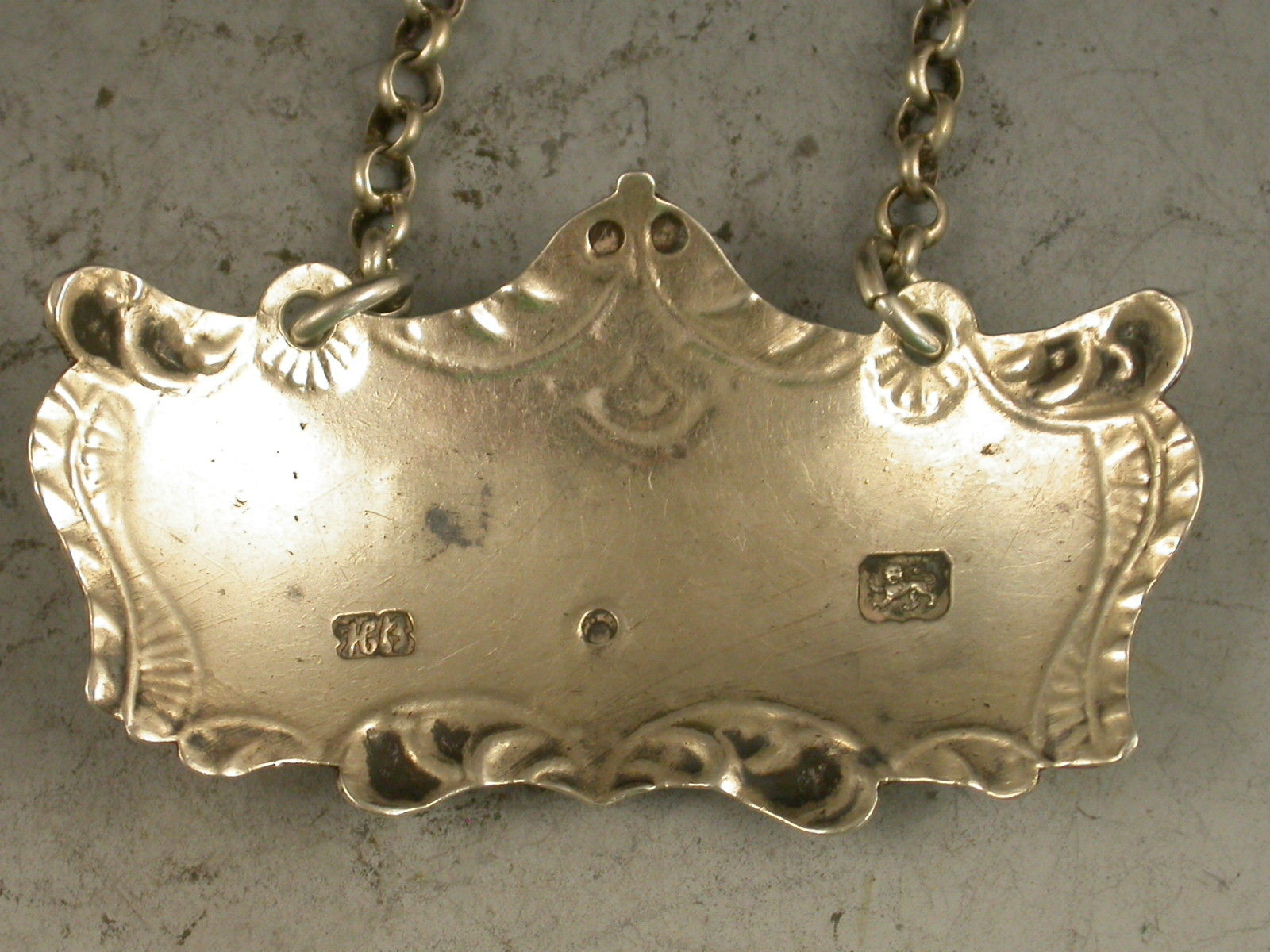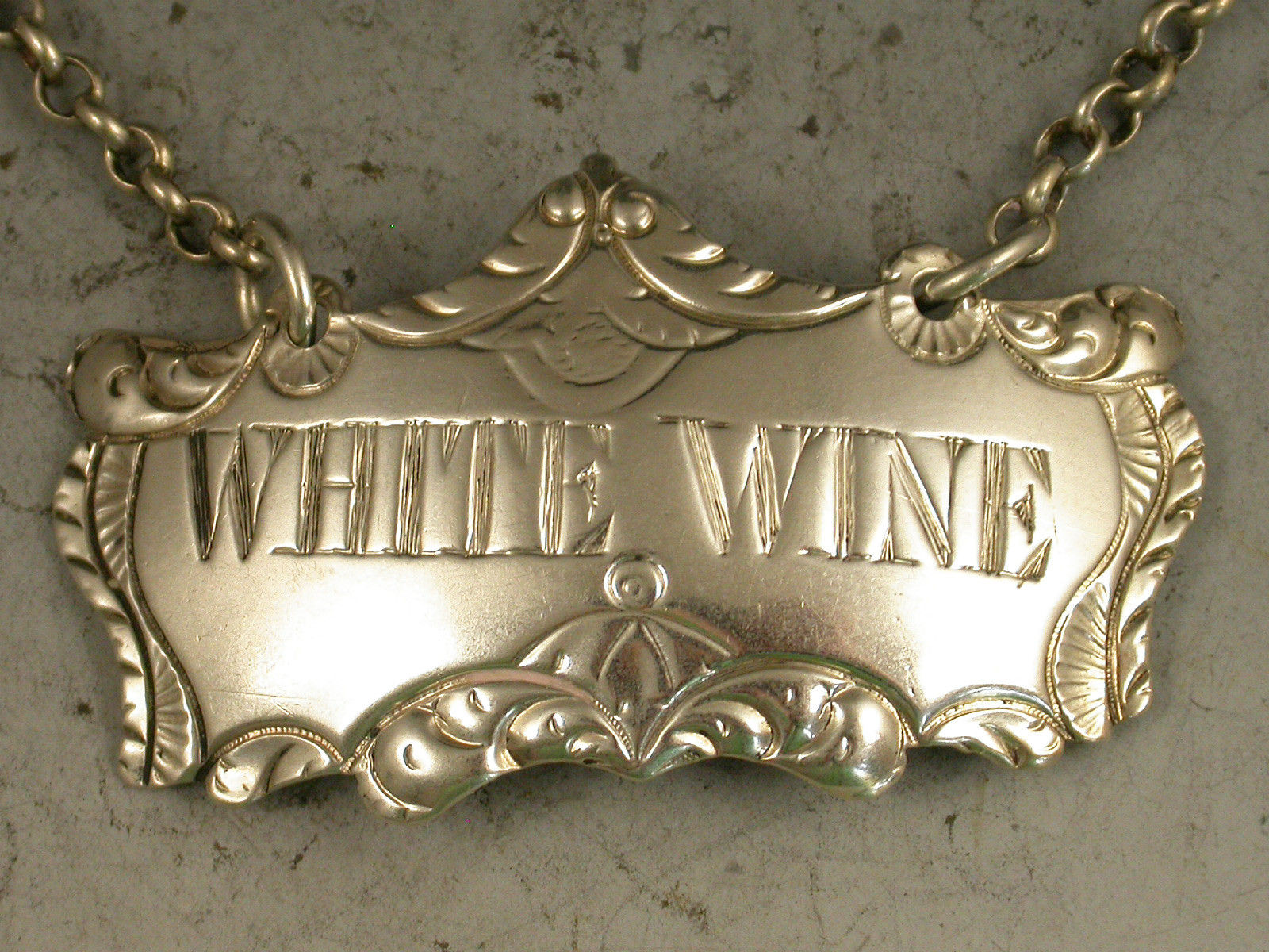 A rare George III 18th century silver Wine Label of unusual shaped rectangular or cushion form with feather edge and scroll border in the form of drapes with a peak at the centre, incised for White Wine.