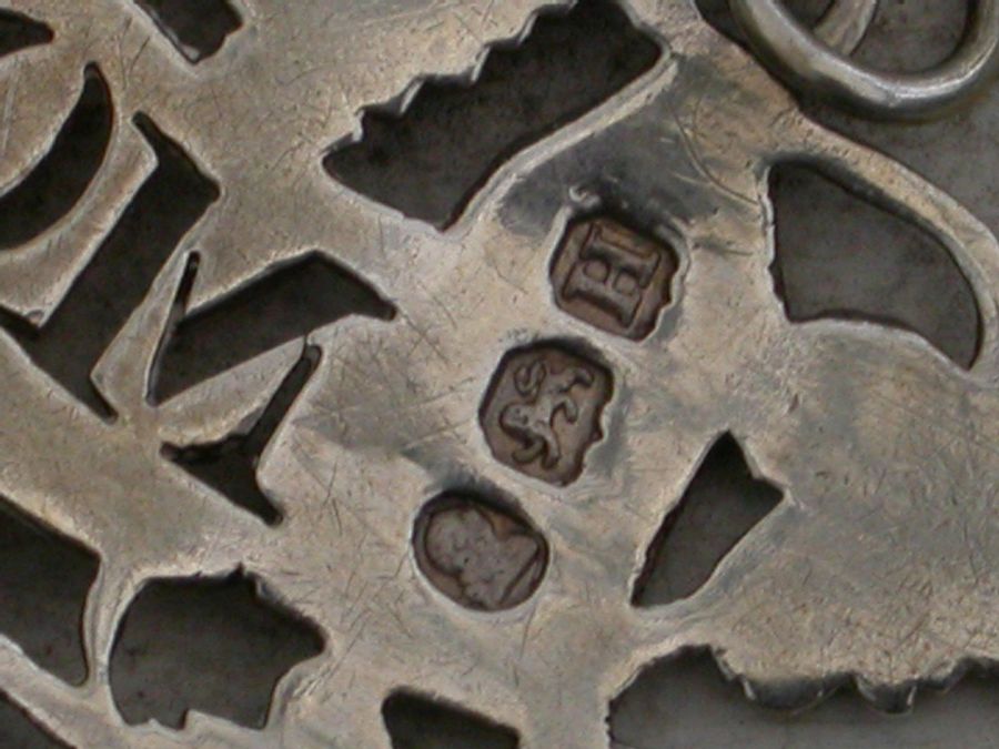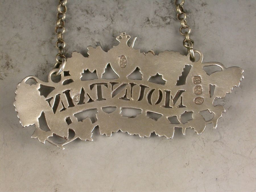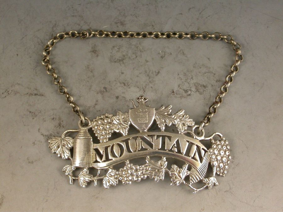 A fine and rare George III cast silver Wine Label of pierced scroll form with border of vine leaves and grapes surrounding the scrolled name plate pierced for Mountain.