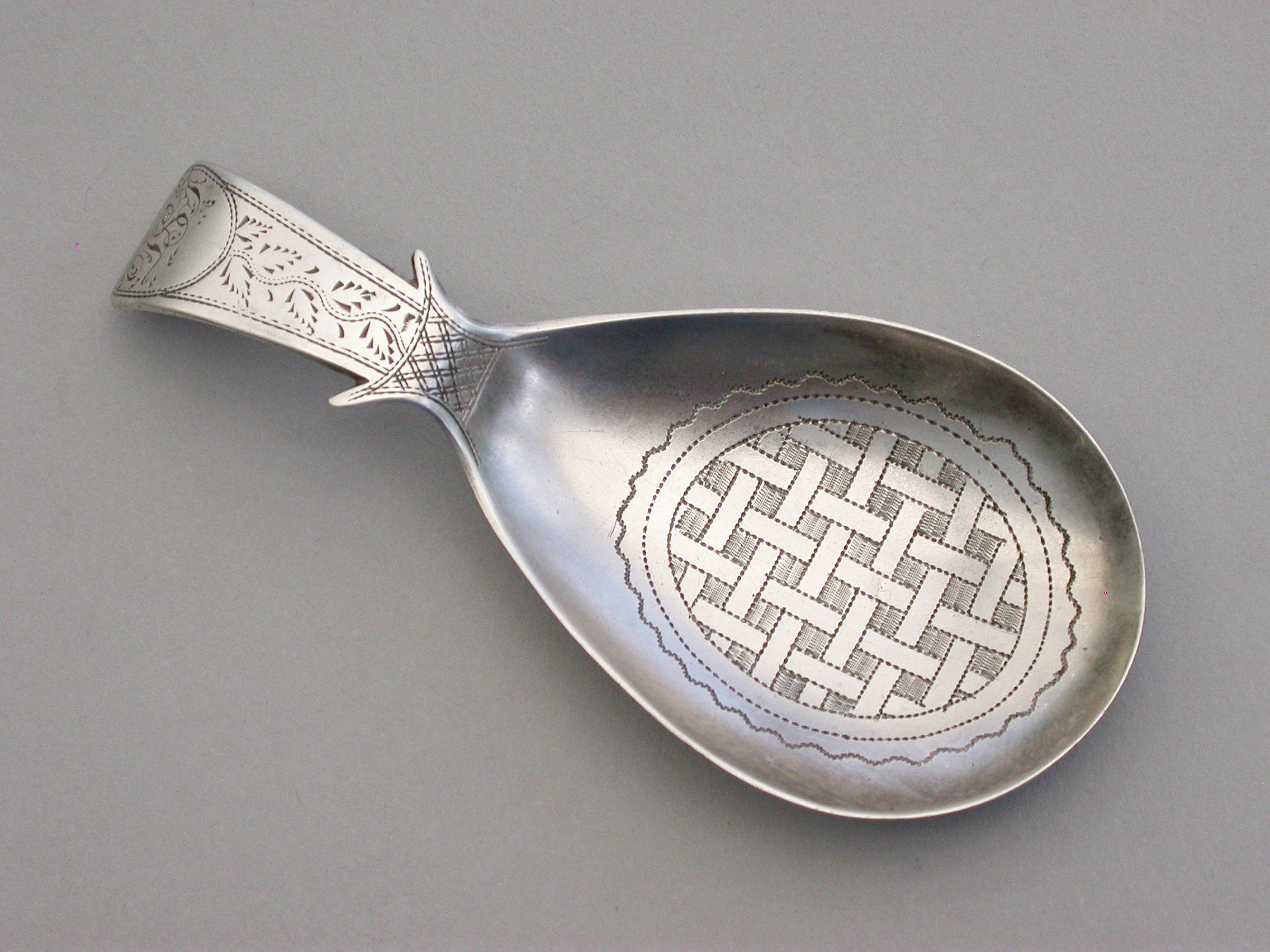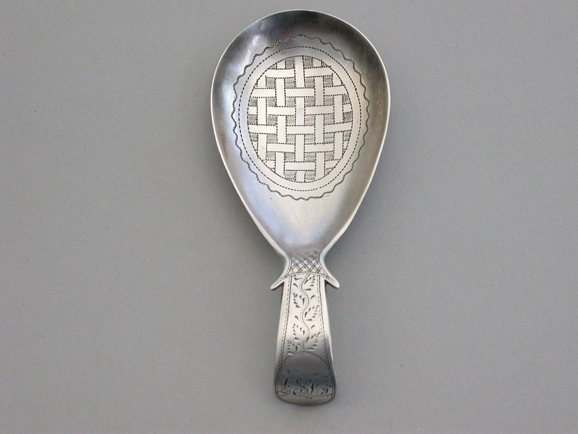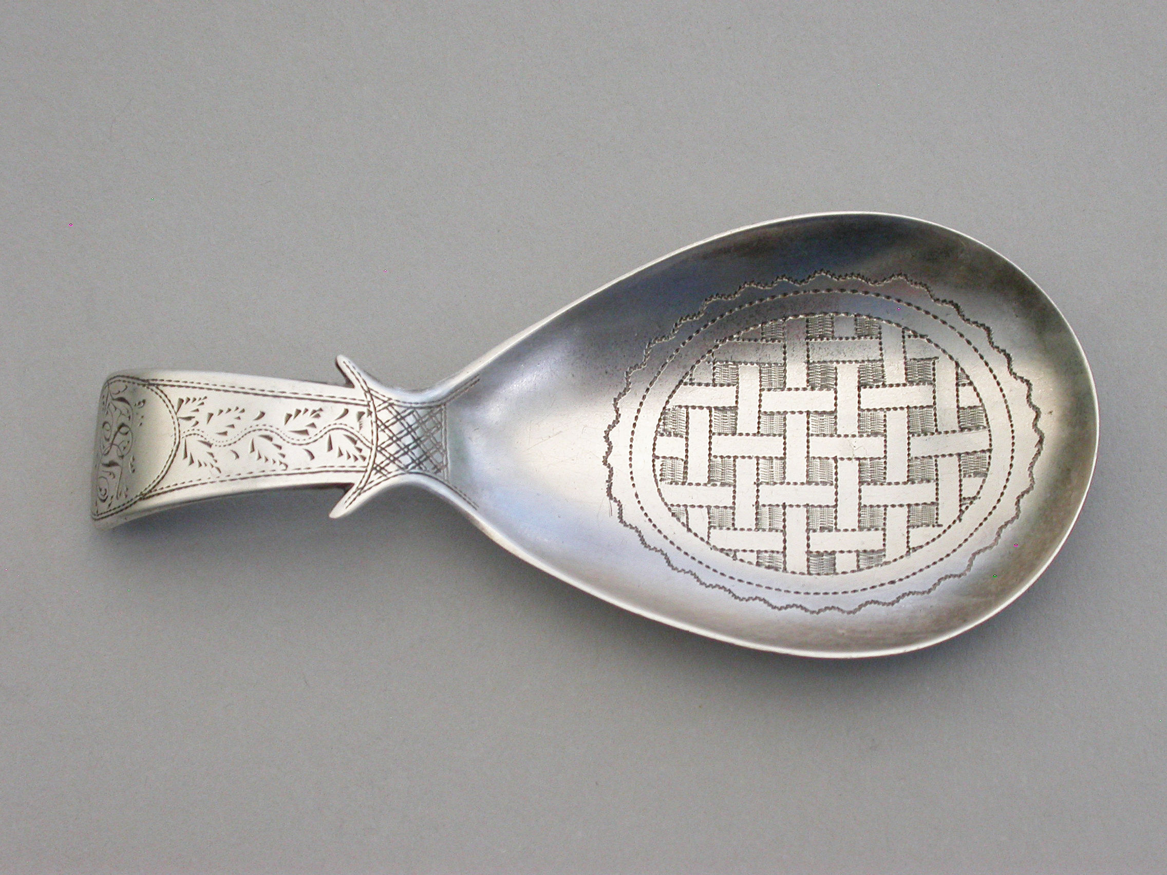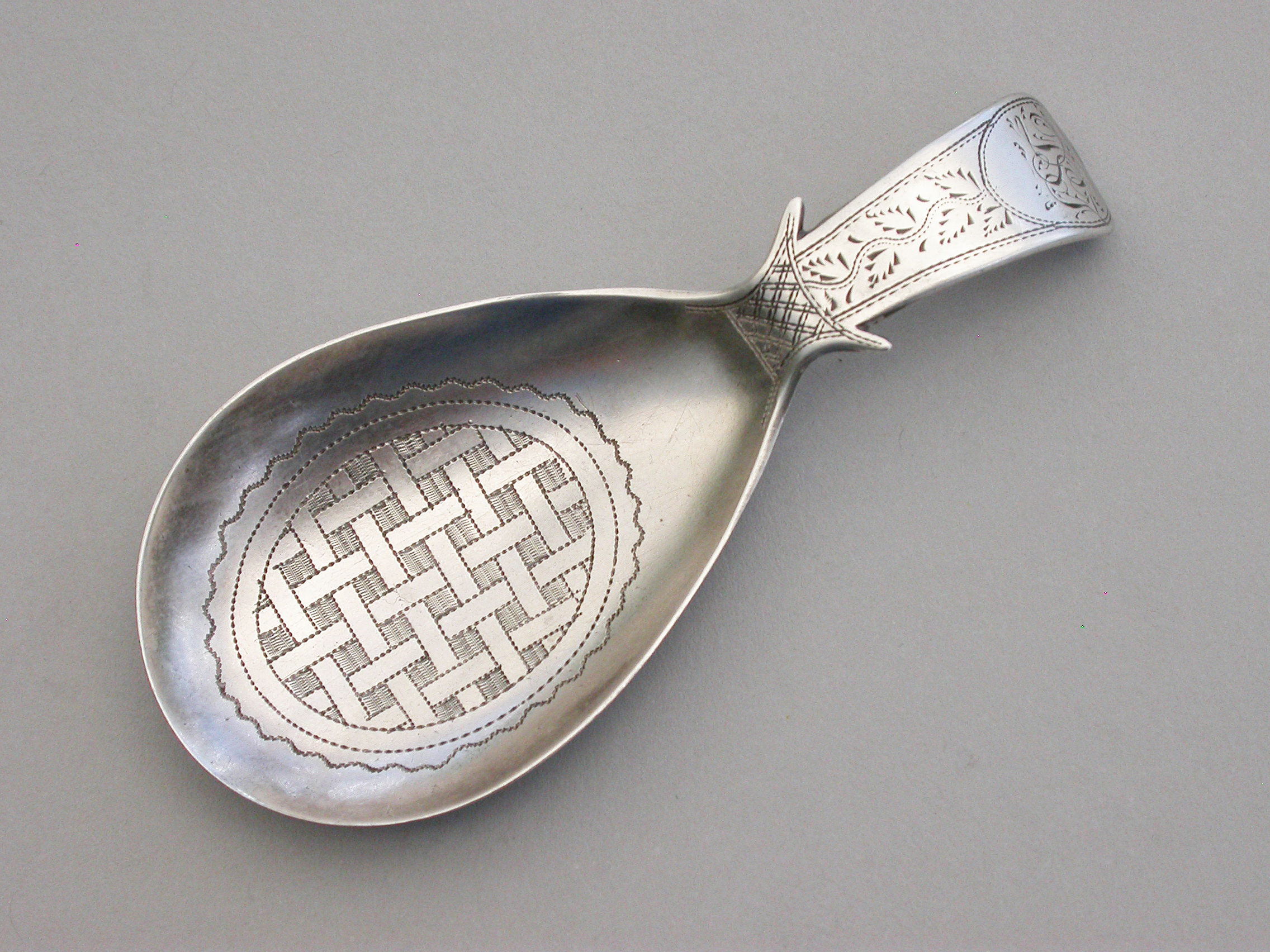 A fine George III silver Caddy Spoon with pear shaped bowl and curved Old English handle with shoulders, the bowl with bright-cut engraved basket-weave design, the handle also bright-cut engraved and with a cartouche engraved with contemporary initials.