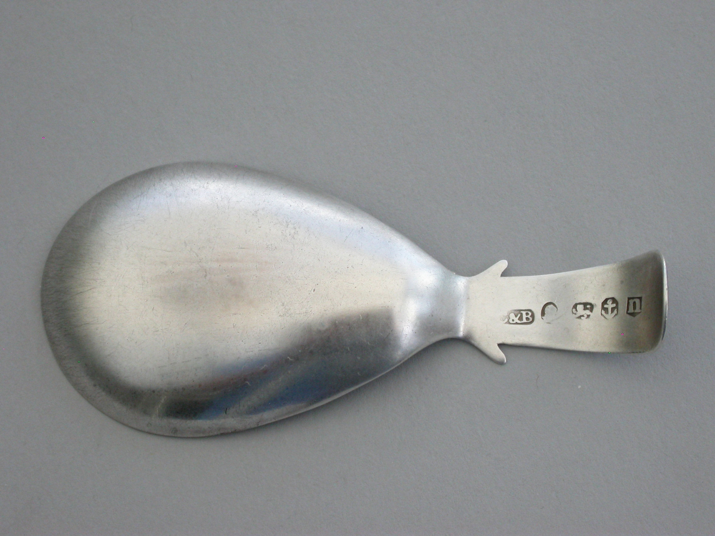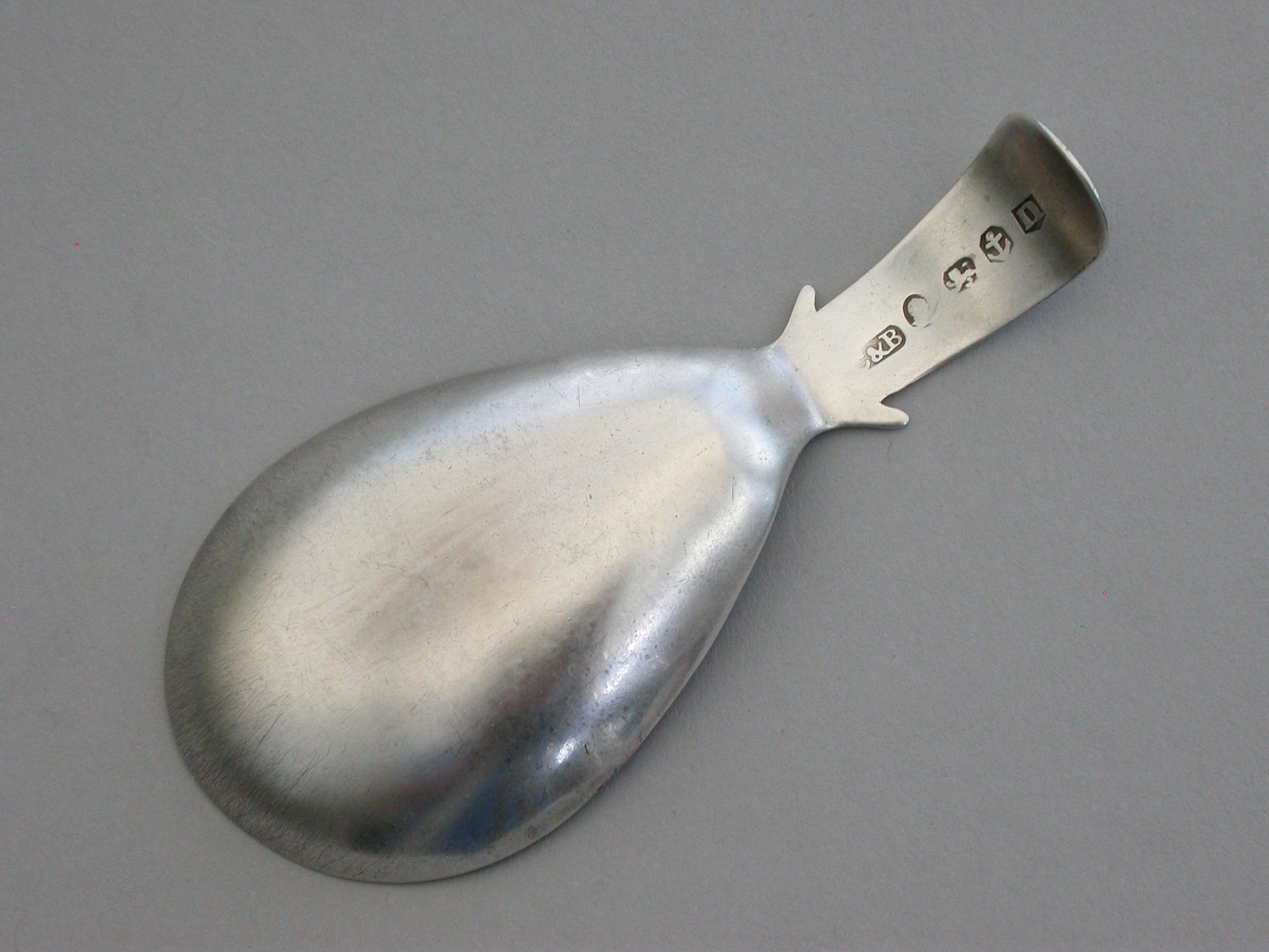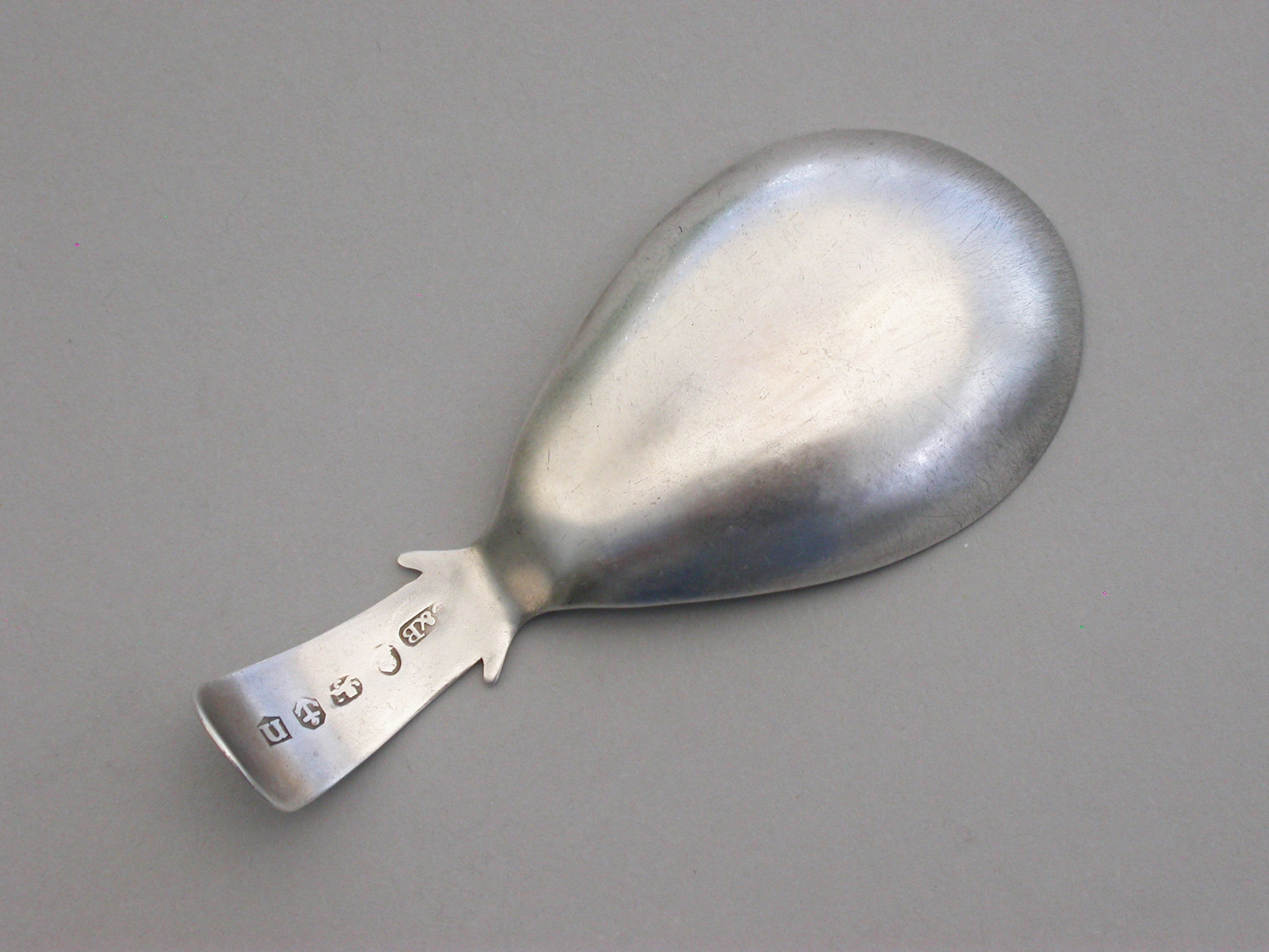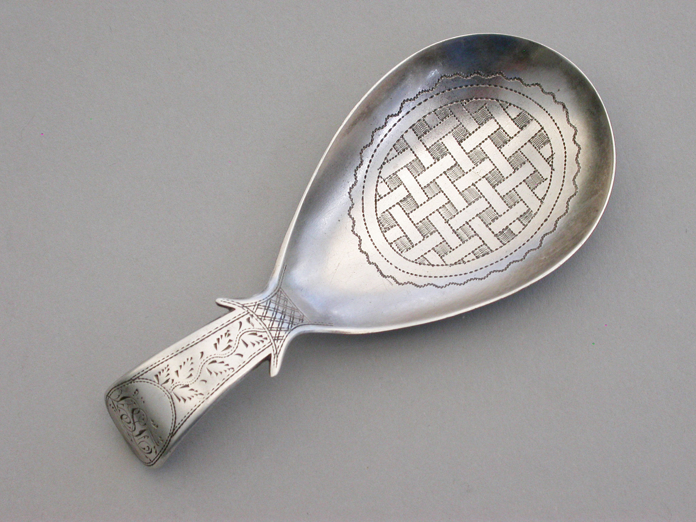 A fine George III silver Caddy Spoon with pear shaped bowl and curved Old English handle with shoulders, the bowl with bright-cut engraved basket-weave design, the handle also bright-cut engraved and with a cartouche engraved with contemporary initials.