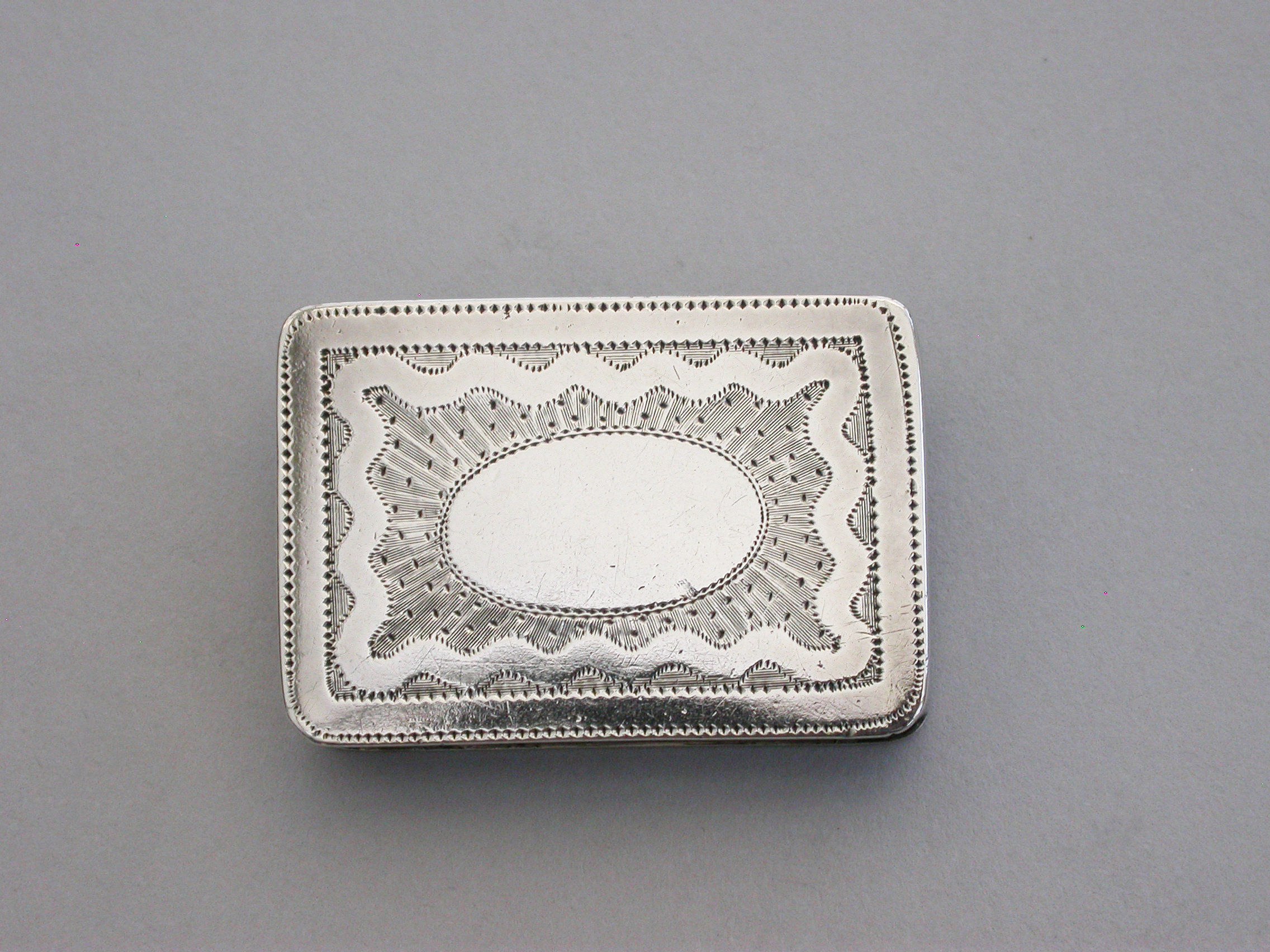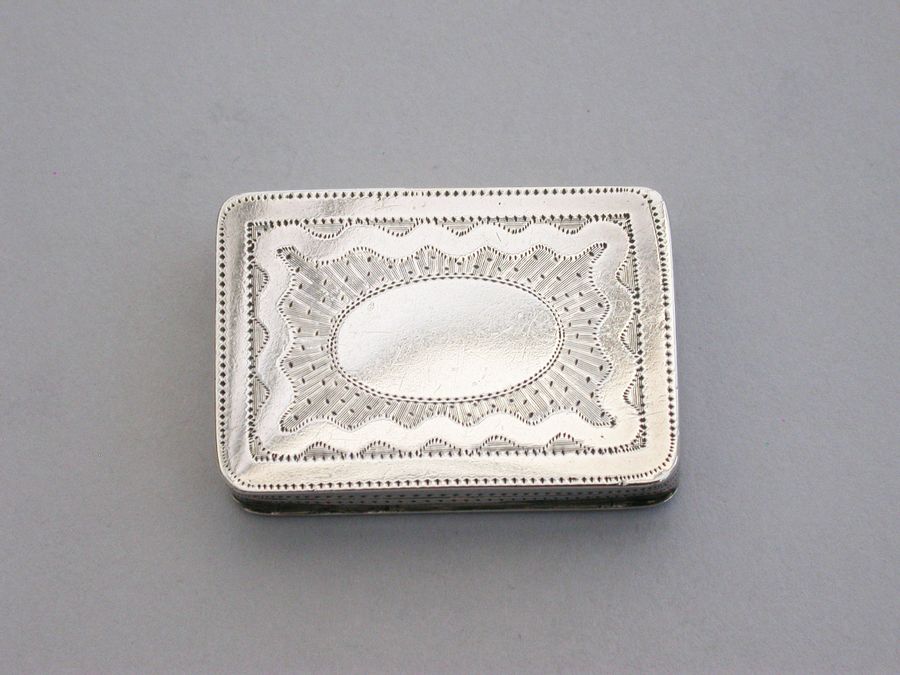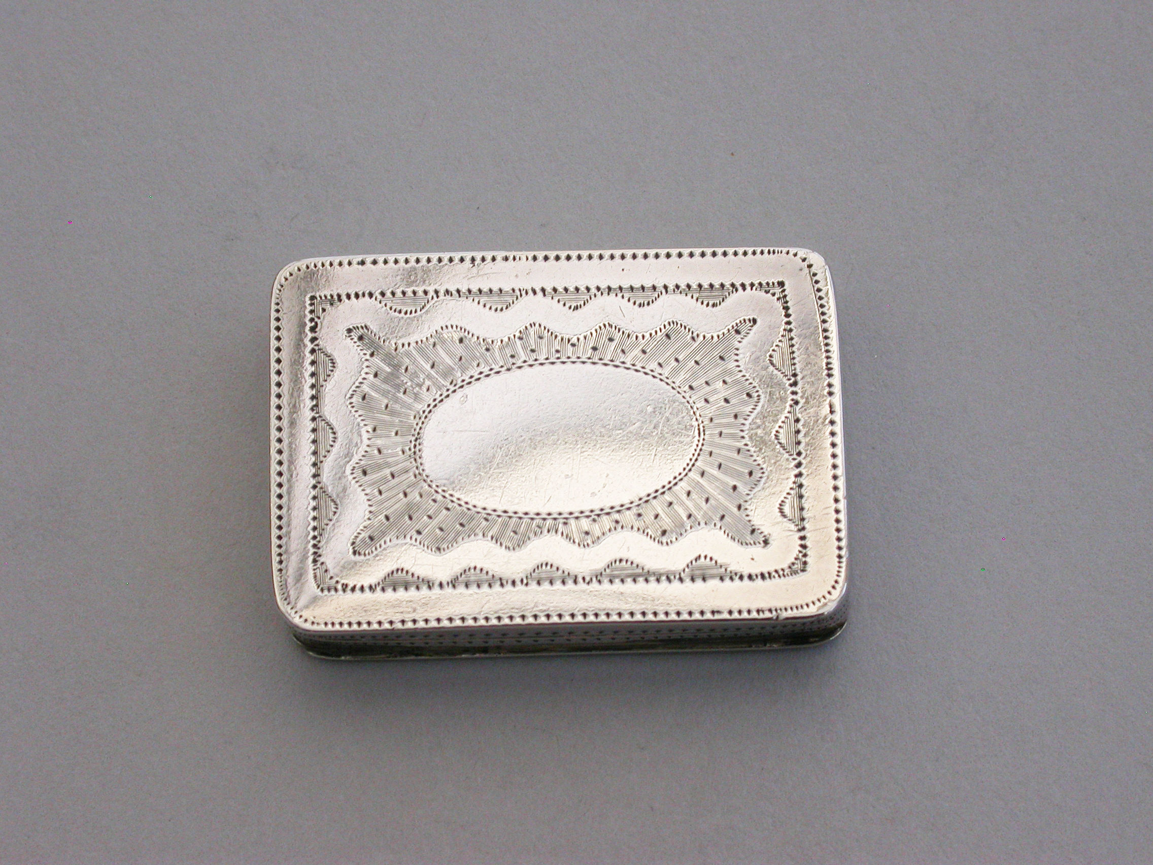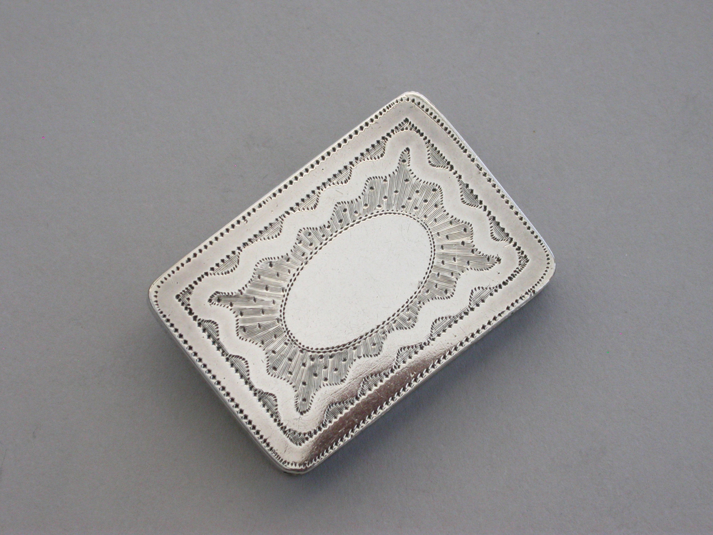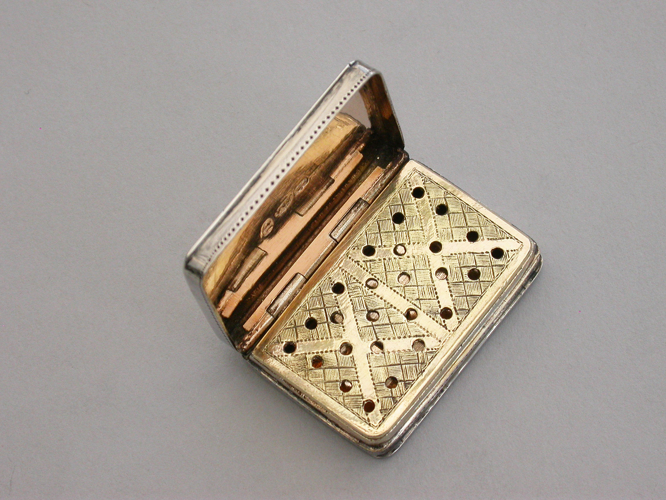 A good quality George III silver Vinaigrette of rectangular form with bright-cut engraved decoration, the cover with plain oval central cartouche within an irregular frame of hatching and prick-dots with plain wavy surround. The pierced silver gilt grille with geometric design formed from small hatched diamonds making two sections each with a cross.