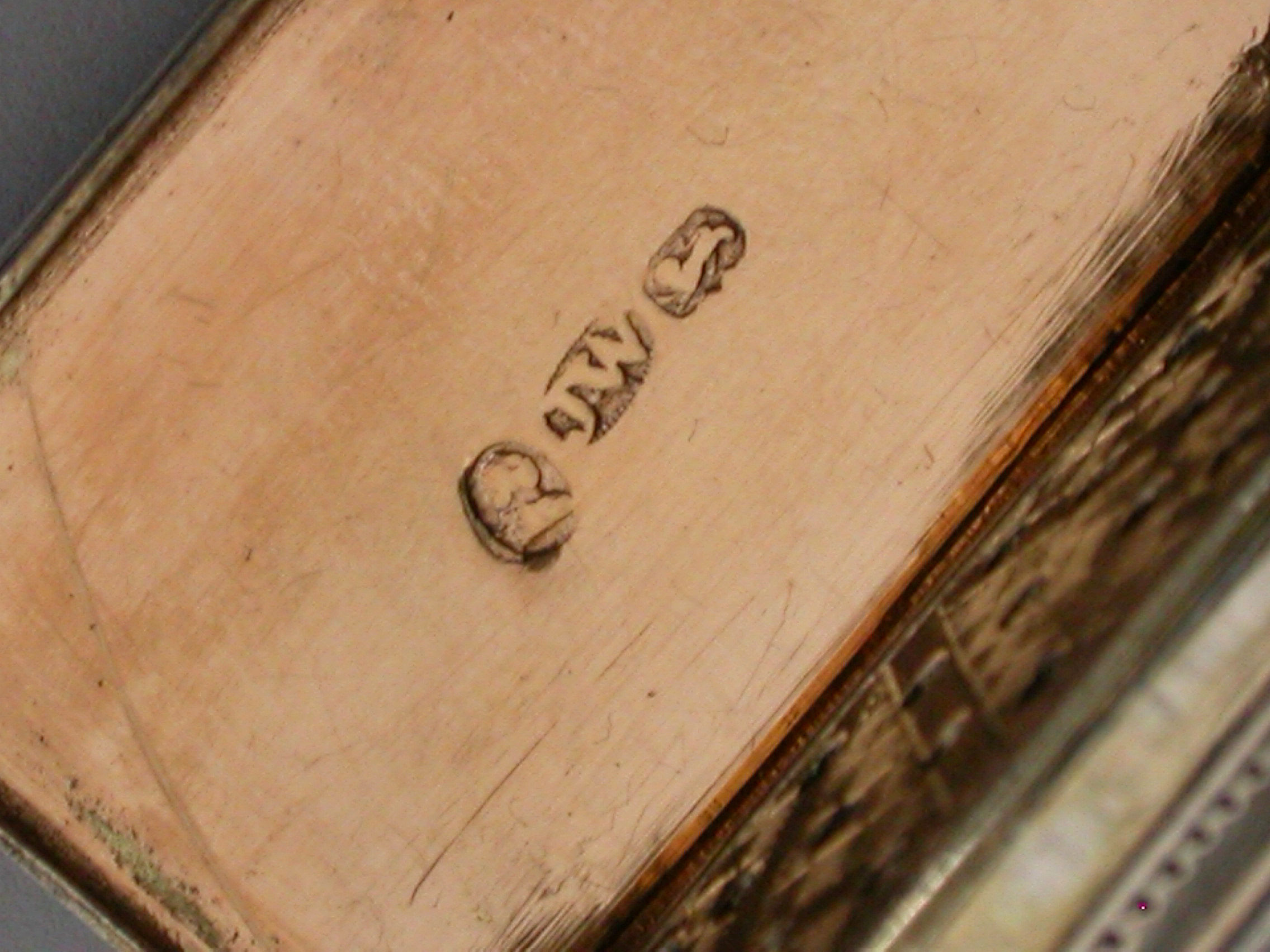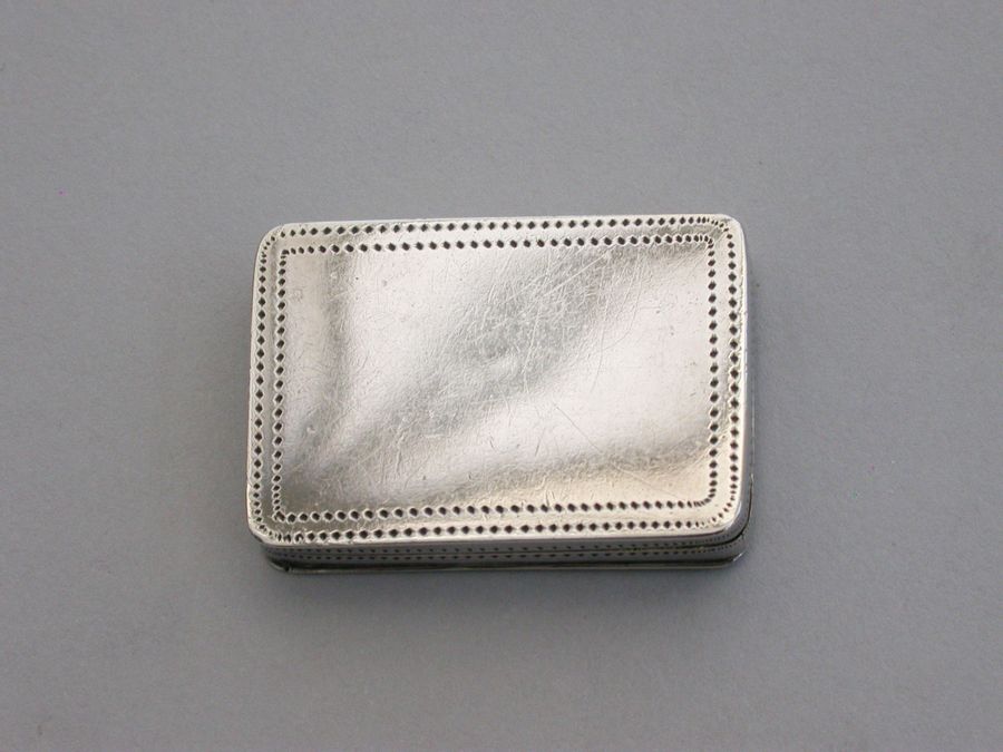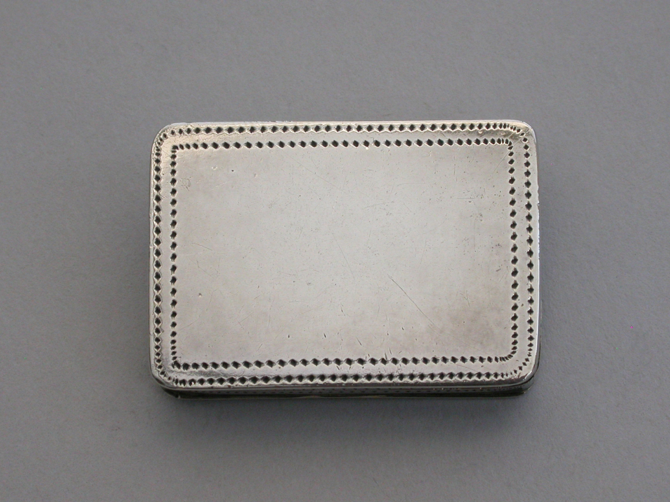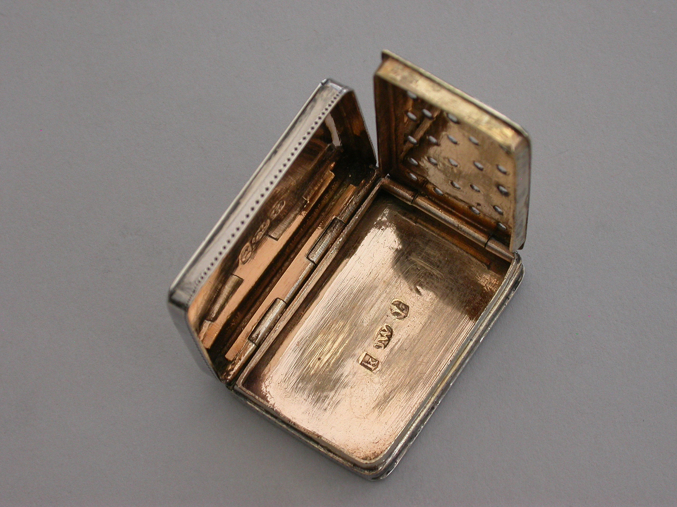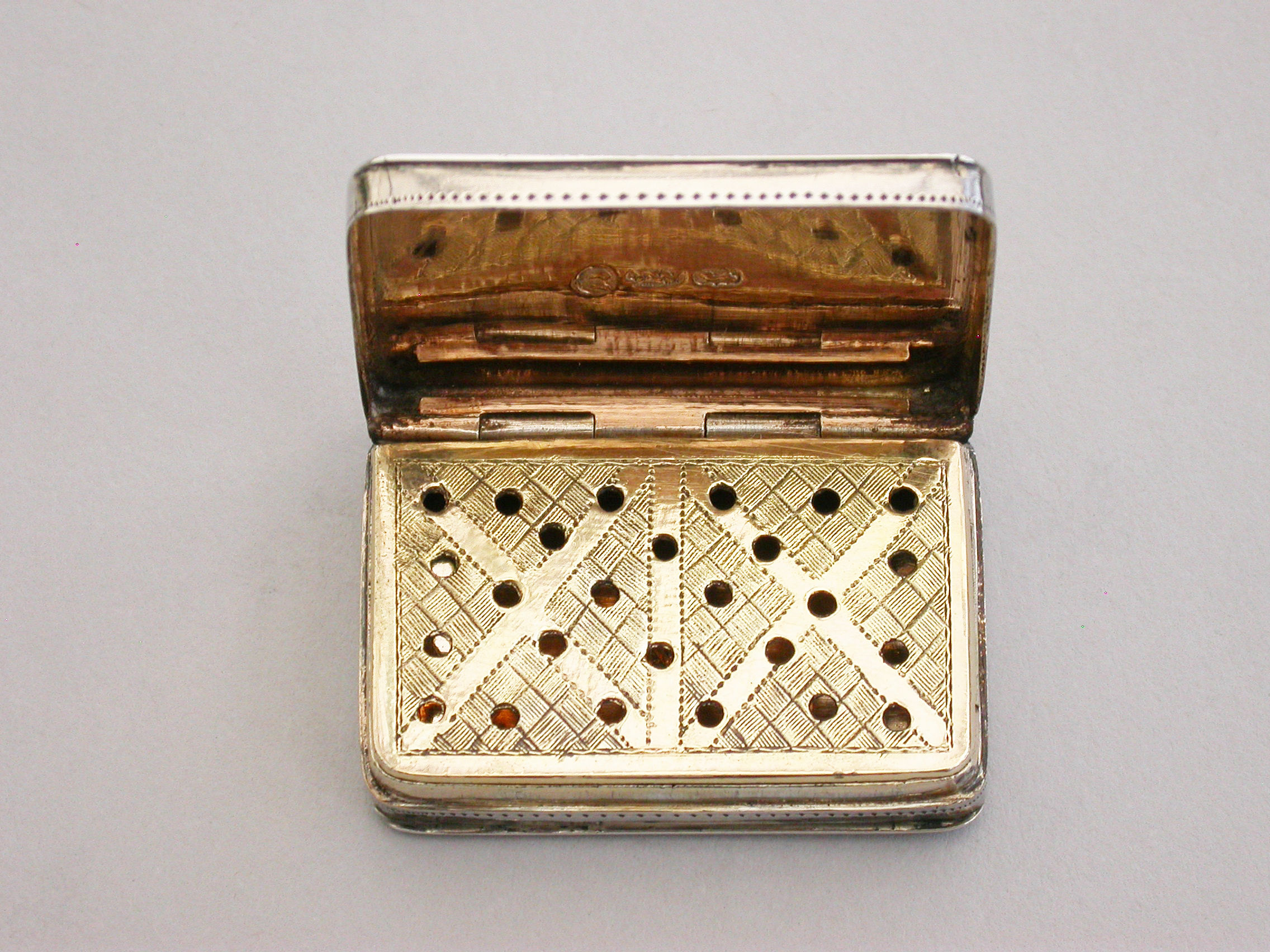 A good quality George III silver Vinaigrette of rectangular form with bright-cut engraved decoration, the cover with plain oval central cartouche within an irregular frame of hatching and prick-dots with plain wavy surround. The pierced silver gilt grille with geometric design formed from small hatched diamonds making two sections each with a cross.