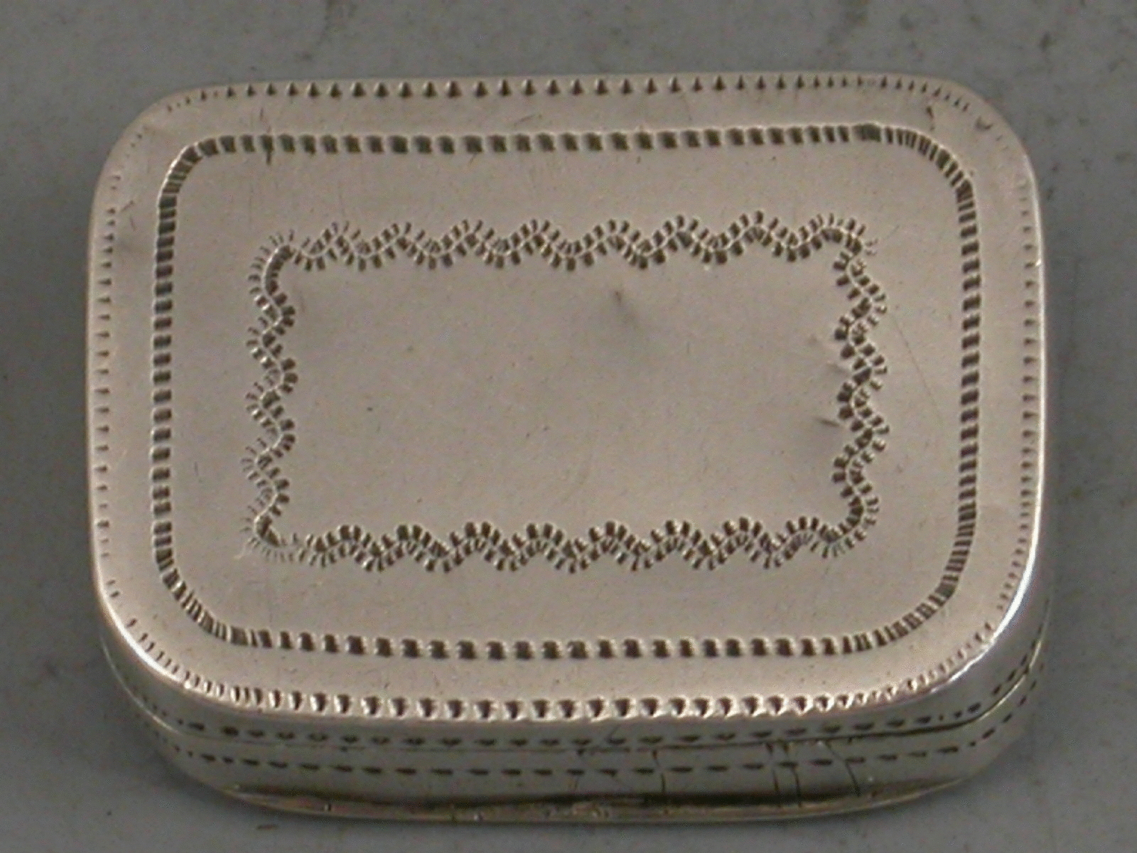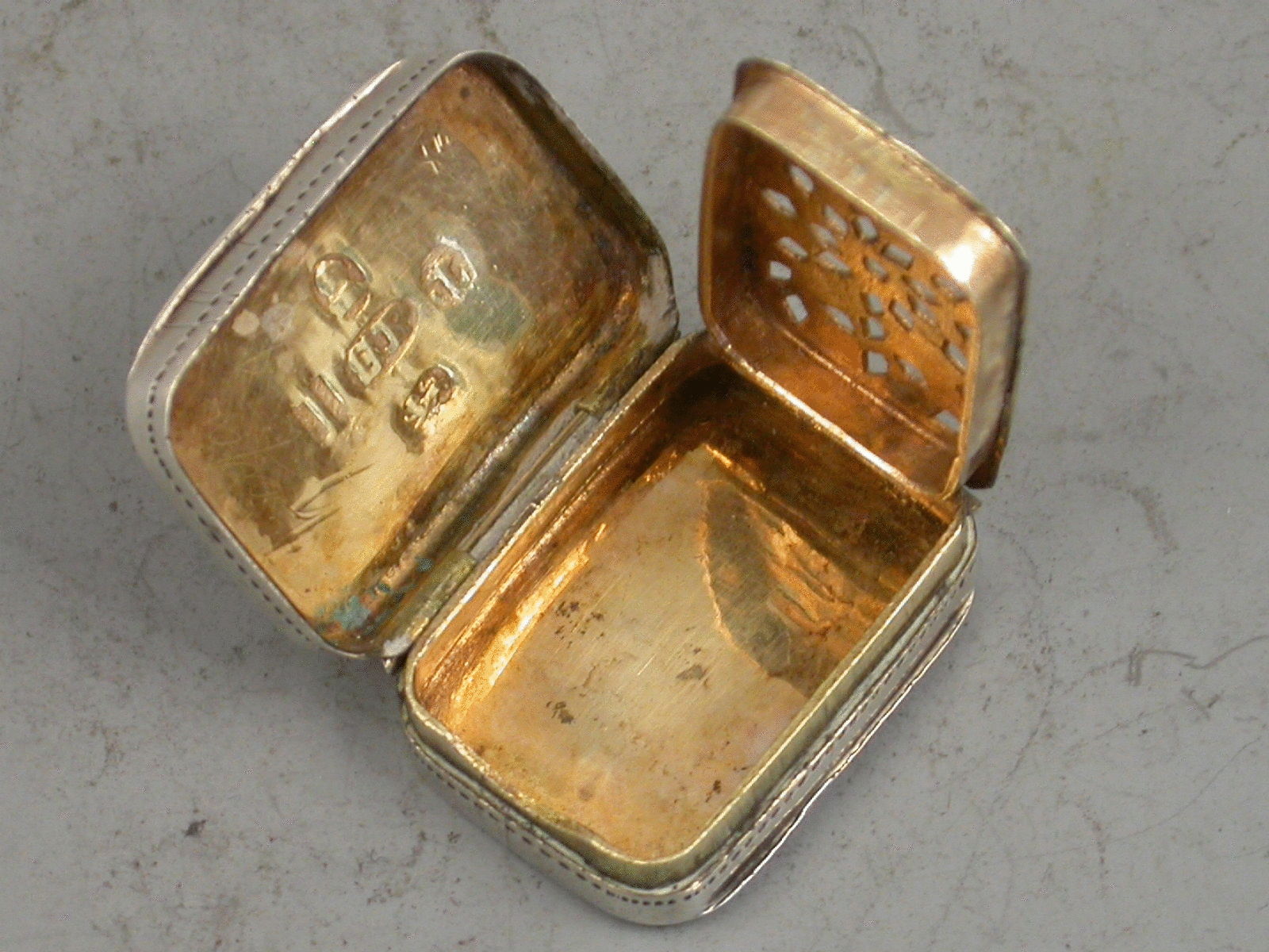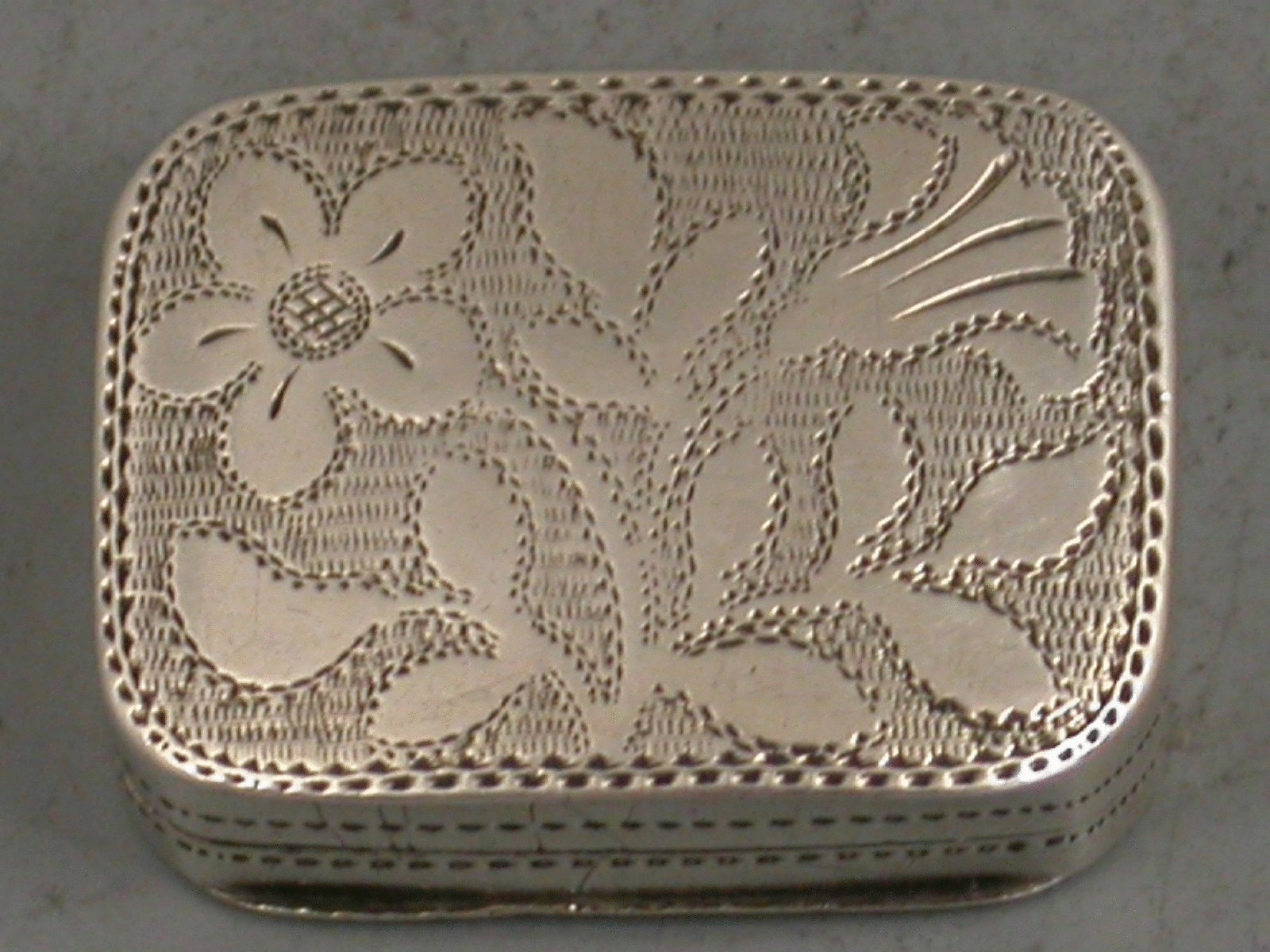 A good George III small silver Vinaigrette of curved rectangular form with bright cut and prick dot engraved decoration depicting flowers to the lid, silver gilt interior with pierced grille.