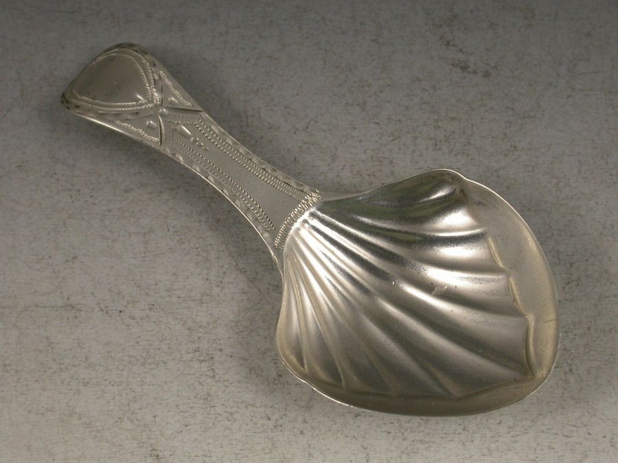 A good George III silver Caddy Spoon with bright cut engraved Old English handle and rare part fluted Anthemion shaped bowl.
