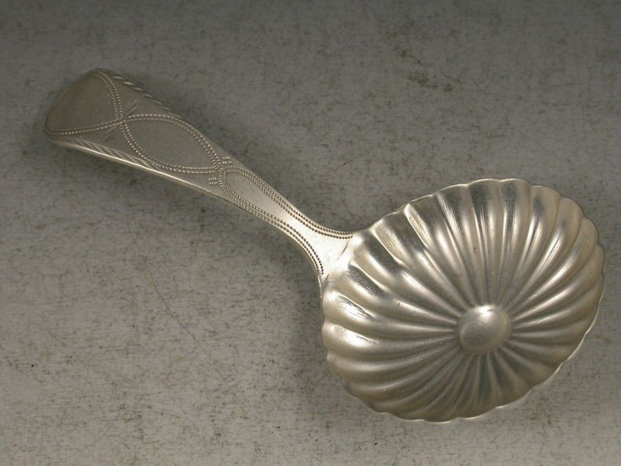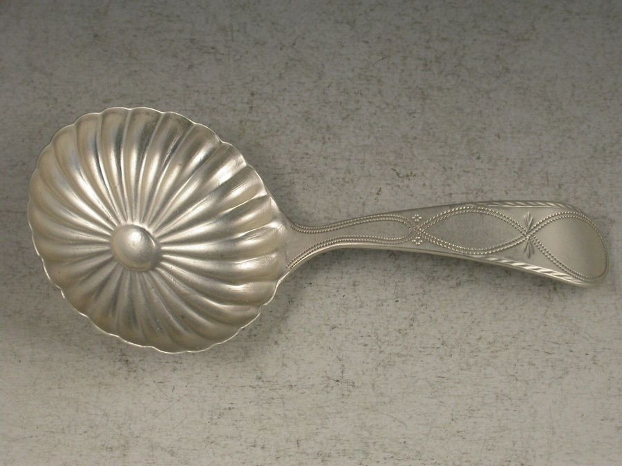 A good George III silver Caddy Spoon with bright cut engraved Old English handle and circular fluted daisy form bowl.