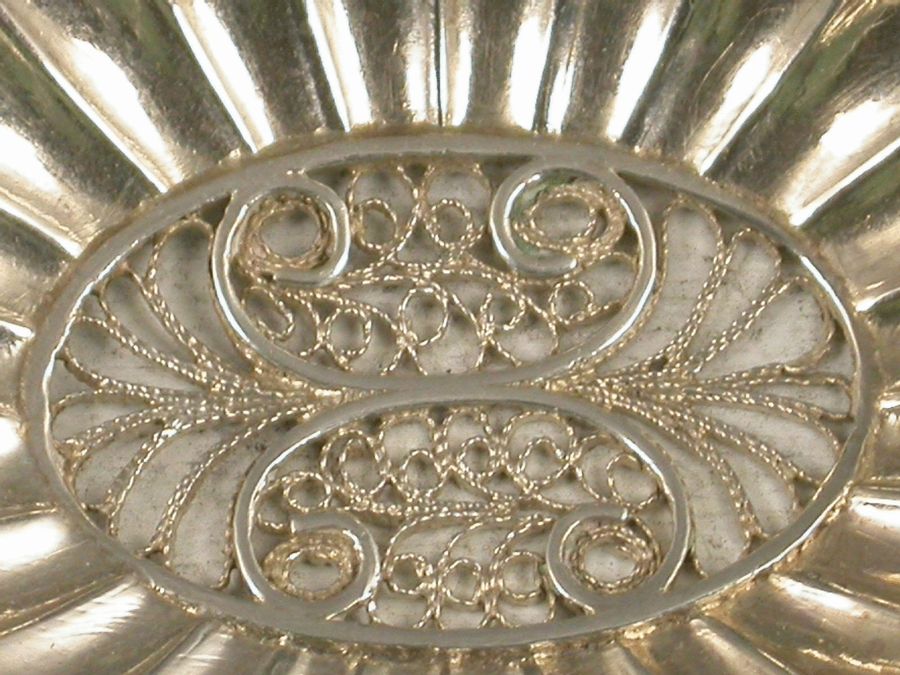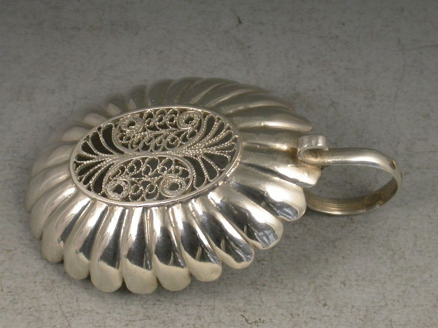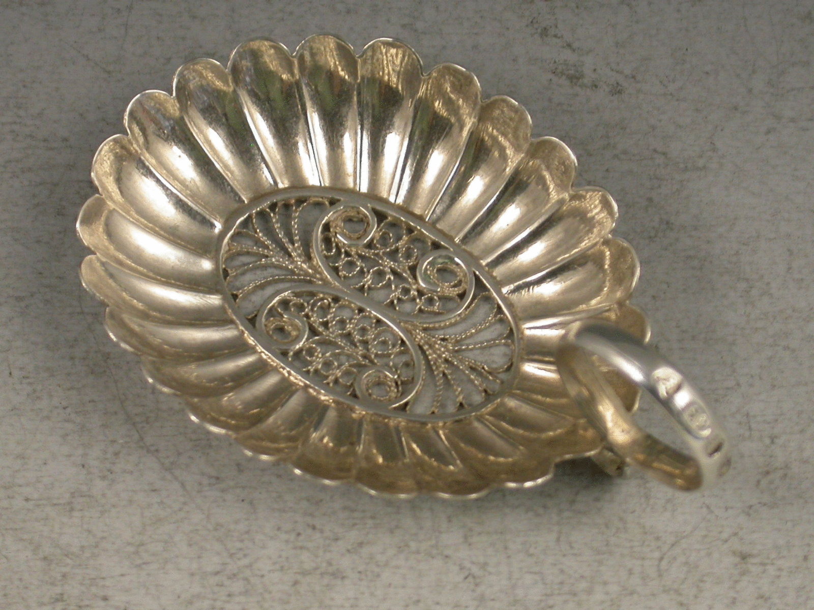 A fine George III silver Caddy Spoon with oval fluted bowl and scrolled ring handle, the base of the bowl with finely pierced filigree insert.